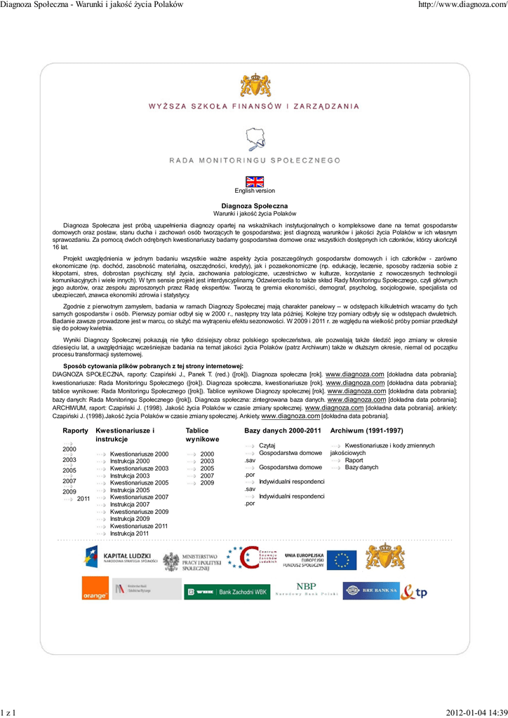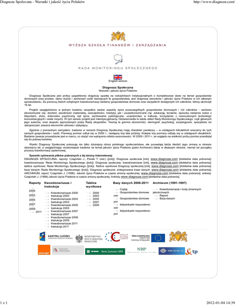 Diagnoza Społeczna - Warunki i jakość życia Polaków 1z1 http://www.diagnoza.com/ English version Diagnoza Społeczna Warunki i jakość życia Polaków Diagnoza Społeczna jest próbą uzupełnienia diagnozy opartej na wskaźnikach instytucjonalnych o kompleksowe dane na temat gospodarstw domowych oraz postaw, stanu ducha i zachowań osób tworzących te gospodarstwa; jest diagnozą warunków i jakości życia Polaków w ich własnym sprawozdaniu. Za pomocą dwóch odrębnych kwestionariuszy badamy gospodarstwa domowe oraz wszystkich dostępnych ich członków, którzy ukończyli 16 lat. Projekt uwzględnienia w jednym badaniu wszystkie ważne aspekty życia poszczególnych gospodarstw domowych i ich członków - zarówno ekonomiczne (np. dochód, zasobność materialną, oszczędności, kredyty), jak i pozaekonomiczne (np. edukację, leczenie, sposoby radzenia sobie z kłopotami, stres, dobrostan psychiczny, styl życia, zachowania patologiczne, uczestnictwo w kulturze, korzystanie z nowoczesnych technologii komunikacyjnych i wiele innych). W tym sensie projekt jest interdyscyplinarny. Odzwierciedla to także skład Rady Monitoringu Społecznego, czyli głównych jego autorów, oraz zespołu zaproszonych przez Radę ekspertów. Tworzą te gremia ekonomiści, demograf, psycholog, socjologowie, specjalista od ubezpieczeń, znawca ekonomiki zdrowia i statystycy. Zgodnie z pierwotnym zamysłem, badania w ramach Diagnozy Społecznej mają charakter panelowy -- w odstępach kilkuletnich wracamy do tych samych gospodarstw i osób. Pierwszy pomiar odbył się w 2000 r., następny trzy lata później. Kolejne trzy pomiary odbyły się w odstępach dwuletnich. Badanie zawsze prowadzone jest w marcu, co służyć ma wytrąceniu efektu sezonowości. W 2009 i 2011 r. ze względu na wielkość próby pomiar przedłużył się do połowy kwietnia. Wyniki Diagnozy Społecznej pokazują nie tylko dzisiejszy obraz polskiego społeczeństwa, ale pozwalają także śledzić jego zmiany w okresie dziesięciu lat, a uwzględniając wcześniejsze badania na temat jakości życia Polaków (patrz Archiwum) także w dłuższym okresie, niemal od początku procesu transformacji systemowej. Sposób cytowania plików pobranych z tej strony internetowej: DIAGNOZA SPOŁECZNA, raporty: Czapiński J., Panek T. (red.) ([rok]). Diagnoza społeczna [rok]. www.diagnoza.com [dokładna data pobrania]; kwestionariusze: Rada Monitoringu Społecznego ([rok]). Diagnoza społeczna, kwestionariusze [rok]. www.diagnoza.com [dokładna data pobrania]; tablice wynikowe: Rada Monitoringu Społecznego ([rok]). Tablice wynikowe Diagnozy społecznej [rok]. www.diagnoza.com [dokładna data pobrania]; bazy danych: Rada Monitoringu Społecznego ([rok]). Diagnoza społeczna: zintegrowana baza danych. www.diagnoza.com [dokładna data pobrania]; ARCHIWUM, raport: Czapiński J. (1998). Jakość życia Polaków w czasie zmiany społecznej. www.diagnoza.com [dokładna data pobrania]. ankiety: Czapiński J. (1998).Jakość życia Polaków w czasie zmiany społecznej. Ankiety. www.diagnoza.com [dokładna data pobrania]. Raporty 2000 2003 2005 2007 2009 2011 Kwestionariusze i instrukcje Kwestionariusze 2000 Instrukcja 2000 Kwestionariusze 2003 Instrukcja 2003 Kwestionariusze 2005 Instrukcja 2005 Kwestionariusze 2007 Instrukcja 2007 Kwestionariusze 2009 Instrukcja 2009 Kwestionariusze 2011 Instrukcja 2011 Tablice wynikowe 2000 2003 2005 2007 2009 Bazy danych 2000-2011 Czytaj Gospodarstwa domowe .sav Gospodarstwa domowe Archiwum (1991-1997) Kwestionariusze i kody zmiennych jakościowych Raport Bazy danych .por Indywidualni respondenci .sav Indywidualni respondenci .por 2012-01-04 14:39