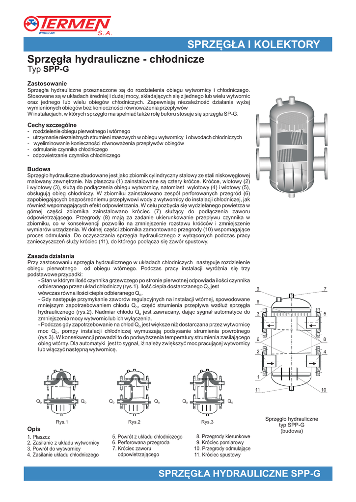 WROCŁAW SPRZĘGŁA I KOLEKTORY Sprzęgła hydrauliczne - chłodnicze Typ SPP-G Zastosowanie Sprzęgła hydrauliczne przeznaczone są do rozdzielenia obiegu wytwornicy i chłodniczego. Stosowane są w układach średniej i dużej mocy, składających się z jednego lub wielu wytwornic oraz jednego lub wielu obiegów chłodniczych. Zapewniają niezależność działania wyżej wymienionych obiegów bez konieczności równoważenia przepływów W instalacjach, w których sprzęgło ma spełniać także rolę buforu stosuje się sprzęgła SP-G. Cechy szczególne - rozdzielenie obiegu pierwotnego i wtórnego utrzymanie niezależnych strumieni masowych w obiegu wytwornicy i obwodach chłodniczych wyeliminowanie konieczności równoważenia przepływów obiegów odmulanie czynnika chłodniczego odpowietrzanie czynnika chłodniczego Budowa Sprzęgło hydrauliczne zbudowane jest jako zbiornik cylindryczny stalowy ze stali niskowęglowej malowany zewnętrznie. Na płaszczu (1) zainstalowane są cztery króćce. Króćce, wlotowy (2) i wylotowy (3), służą do podłączenia obiegu wytwornicy, natomiast wylotowy (4) i wlotowy (5), obsługują obieg chłodniczy. W zbiorniku zainstalowano zespół perforowanych przegród (6) zapobiegających bezpośredniemu przepływowi wody z wytwornicy do instalacji chłodniczej, jak również wspomagających efekt odpowietrzania. W celu pozbycia się wydzielanego powietrza w górnej części zbiornika zainstalowano króciec (7) służący do podłączenia zaworu odpowietrzającego. Przegrody (8) mają za zadanie ukierunkowanie przepływu czynnika w zbiorniku, co w konsekwencji pozwoliło na zmniejszenie rozstawu króćców i zmniejszenie wymiarów urządzenia. W dolnej części zbiornika zamontowano przegrody (10) wspomagające proces odmulania. Do oczyszczania sprzęgła hydraulicznego z wytrąconych podczas pracy zanieczyszczeń służy króciec (11), do którego podłącza się zawór spustowy. Zasada działania Przy zastosowaniu sprzęgła hydraulicznego w układach chłodniczych następuje rozdzielenie obiegu pierwotnego od obiegu wtórnego. Podczas pracy instalacji wyróżnia się trzy podstawowe przypadki: - Stan w którym ilość czynnika grzewczego po stronie pierwotnej odpowiada ilości czynnika odbieranego przez układ chłodniczy (rys.1). Ilość ciepła dostarczanego QD jest wówczas równa ilości ciepła odbieranego QO. - Gdy następuje przymykanie zaworów regulacyjnych na instalacji wtórnej, spowodowane mniejszym zapotrzebowaniem chłodu QO, część strumienia przepływa wzdłuż sprzęgła hydraulicznego (rys.2). Nadmiar chłodu QD jest zawracany, dając sygnał automatyce do zmniejszenia mocy wytwornic lub ich wyłączenia. - Podczas gdy zapotrzebowanie na chłod QO jest większe niż dostarczana przez wytwornicę moc QD, pompy instalacji chłodniczej wymuszają podsysanie strumienia powrotnego (rys.3). W konsekwencji prowadzi to do podwyższenia temperatury strumienia zasilającego obieg wtórny. Dla automatyki jest to sygnał, iż należy zwiększyć moc pracującej wytwornicy lub włączyć następną wytwornicę. 9 7 6 3 5 6 8 2 4 1 11 QD QO Rys.1 QO QD QO QD Rys.2 Rys.3 Opis 1. Płaszcz 2. Zasilanie z układu wytwornicy 3. Powrót do wytwornicy 4. Zasilanie układu chłodniczego 5. Powrót z układu chłodniczego 6. Perforowana przegroda 7. Króciec zaworu odpowietrzającego 10 Sprzęgło hydrauliczne typ SPP-G (budowa) 8. Przegrody kierunkowe 9. Króciec pomiarowy 10. Przegrody odmulające 11. Króciec spustowy SPRZĘGŁA HYDRAULICZNE SPP-G WROCŁAW SPRZĘGŁA I KOLEKTORY Dane techniczne Ciśnienie Temperatura Masa Pojemność Przepł. Moc o DN max. dla t=6 C nominalne nominalna netto zbiornika o kg kW bar C dm3 m3/h Typ Wymiary D L A B H R SPP-G 40/150 40 4 27 14 8,1 159 320 152 225 524 45 SPP-G 50/150 50 5 35 16 8,1 159 320 152 225 524 70 SPP-G 65/200 65 9 63 21 21 219 380 205 225 635 70 SPP-G 80/250 80 13 90 30 30 273 450 220 225 665 70 SPP-G 100/300 100 20 140 50 64 324 500 275 340 890 110 SPP-G 125/300 125 30 210 62 64 324 500 275 340 890 110 SPP-G 150/450 150 50 350 115 190 457 630 398 500 1295 110 6 S O T - ½” 1” ½” 1” 80 SPP-G 200/650* 200 100 700 180 473 650 830 448 700 1595 110 SPP-G 250/650* 250 150 1050 200 473 650 830 448 700 1595 110 SPP-G 300/800* 300 220 1540 260 928 810 1065 612 840 2065 110 SPP-G 350/800* 350 290 2025 290 928 810 1065 612 840 2065 110 SPP-G 400/1000* 400 380 2655 505 1895 1012 1275 782 1100 2665 110 SPP-G 450/1200* 450 540 3770 800 3085 1212 1480 882 1250 3015 110 SPP-G 500/1200* 500 600 4190 825 3085 1212 1480 882 1250 3015 110 1” 2” 2” Uwaga: - kołnierze przyłączeniowe PN16 - wymiary przyłączeniowe wg PN-EN 1092-1 R O T * sprzęgła mogą być wykonane z konstrukcją wsporczą (zbiornik z nogami). dla temperatur T>110oC H B - znak DN Oznaczenie sprzęgła hydraulicznego A SPP-G 300 / 800 / 80 2 3 4 1 - typ sprzęgła hydraulicznego 2 - średnica nominalna DN 3 - oznaczenie średnicy zbiornika 4 - temperatura obliczeniowa S D 185 1 L Sprzęgło hydrauliczne typ SPP-G (wymiary) Zastrzega się prawo do wprowadzenia zmian konstrukcyjnych. SPRZĘGŁA HYDRAULICZNE SPP-G