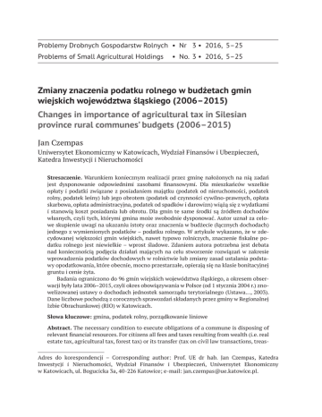 Problemy Drobnych Gospodarstw Rolnych • Nr 3 • 2016, 5–25 Problems of Small Agricultural Holdings • No. 3 • 2016, 5–25 Zmiany znaczenia podatku rolnego w budżetach gmin wiejskich województwa śląskiego (2006–2015) Changes in importance of agricultural tax in Silesian province rural communes’ budgets (2006–2015) Jan Czempas Uniwersytet Ekonomiczny w Katowicach, Wydział Finansów i Ubezpieczeń, Katedra Inwestycji i Nieruchomości Streszczenie. Warunkiem koniecznym realizacji przez gminę nałożonych na nią zadań jest dysponowanie odpowiednimi zasobami finansowymi. Dla mieszkańców wszelkie opłaty i podatki związane z posiadaniem majątku (podatek od nieruchomości, podatek rolny, podatek leśny) lub jego obrotem (podatek od czynności cywilno-prawnych, opłata skarbowa, opłata administracyjna, podatek od spadków i darowizn) wiążą się z wydatkami i stanowią koszt posiadania lub obrotu. Dla gmin te same środki są źródłem dochodów własnych, czyli tych, którymi gmina może swobodnie dysponować. Autor uznał za celowe skupienie uwagi na ukazaniu istoty oraz znaczenia w budżecie (łącznych dochodach) jednego z wymienionych podatków – podatku rolnego. W artykule wykazano, że w zdecydowanej większości gmin wiejskich, nawet typowo rolniczych, znaczenie fiskalne podatku rolnego jest niewielkie – wprost śladowe. Zdaniem autora potrzebna jest debata nad koniecznością podjęcia działań mających na celu stworzenie rozwiązań w zakresie wprowadzenia podatków dochodowych w rolnictwie lub zmiany zasad ustalania podstawy opodatkowania, które obecnie, mocno przestarzałe, opierają się na klasie bonitacyjnej gruntu i cenie żyta. Badania ograniczono do 96 gmin wiejskich województwa śląskiego, a okresem obserwacji były lata 2006–2015, czyli okres obowiązywania w Polsce (od 1 stycznia 2004 r.) znowelizowanej ustawy o dochodach jednostek samorządu terytorialnego (Ustawa…, 2003). Dane liczbowe pochodzą z corocznych sprawozdań składanych przez gminy w Regionalnej Izbie Obrachunkowej (RIO) w Katowicach. Słowa kluczowe: gmina, podatek rolny, porządkowanie liniowe Abstract. The necessary condition to execute obligations of a commune is disposing of relevant financial resources. For citizens all fees and taxes resulting from wealth (i.e. real estate tax, agricultural tax, forest tax) or its transfer (tax on civil law transactions, treasAdres do korespondencji – Corresponding author: Prof. UE dr hab. Jan Czempas, Katedra Inwestycji i Nieruchomości, Wydział Finansów i Ubezpieczeń, Uniwersytet Ekonomiczny w Katowicach, ul. Bogucicka 3a, 40-226 Katowice; e-mail: [email protected]. 6 Jan Czempas ury stamp, administrative fee, inheritance tax) are expenses treated as possession cost or transfer cost. For local communes the same resources are source of own incomes, i.e. the ones for free disposal of a commune. The author decided to focus on the essence and importance of one of these taxes, namely: agricultural tax. The paper proves that for the significant majority of rural communes, even typically agricultural, the fiscal importance of the tax is immaterial. The author argues that it is necessary to start the discussion on the necessity to undertake relevant actions aimed at working out of solutions regarding income taxes in agriculture or to change the basis of agricultural tax calculation - current approach that takes into consideration the class of ground and price of rye seems not to address current specifics of agricultural business. The research was limited to 96 agricultural communes of Silesian voivodship and the timespan of analysis was the decade of 2006-2015 (the period when The Act on Local Administrative Units Incomes was in force – starting 1st January 2004). The figures were obtained from yearly financial statements reported by communes to Regional Accounting Office (Regionalna Izba Obrachunkowa) in Katowice. Keywords: communes; agricultural tax, linear ranging Wstęp Gminy są podstawowymi jednostkami samorządu terytorialnego w Polsce (Konstytucja Rzeczypospolitej Polskiej [RP], 1997, art. 164 pkt 1). Ich obecny status zaistniał z dniem wprowadzenia w życie zapisów ustawy z dnia 8 marca 1990 r. o samorządzie terytorialnym (Ustawa…, 1990). W pierwszych latach istnienia gmin funkcjonował jednostopniowy podział terytorialny, z gminą jako jego podstawowym elementem. Dopiero ustawą z dnia 24 lipca 1998 r. o wprowadzeniu zasadniczego trójstopniowego podziału terytorialnego państwa w polskim systemie administracyjnym pojawiły się samorządowe jednostki powiatowe i wojewódzkie (Ustawa…, 1998, art. 1 pkt 2). Gmina jako jednostka samorządu terytorialnego realizuje szereg zadań, których zasadniczym celem jest zaspokajanie potrzeb lokalnej społeczności, a nie zysk. Zakres tych zadań reguluje ustawa kompetencyjna, a przede wszystkim ustawa o samorządzie terytorialnym (Ustawa…, 1990; Ustawa…, 1998). Dochody gmin Już w Konstytucji RP określone zostały główne źródła dochodów gmin, którymi są: dochody własne, subwencje ogólne oraz dotacje z budżetu państwa (Konstytucja RP, 1997, art. 167). Podobna klasyfikacja widnieje na kartach ustawy o dochodach jednostek samorządu terytorialnego. W art. 3 ust. 3 tegoż aktu ustawodawca podkreśla także, iż dochodami jednostek samorządu terytorialnego mogą być: 1) środki pochodzące ze źródeł zagranicznych, które nie podlegają zwrotowi; 2) środki pochodzące z budżetu Unii Europejskiej; 3) inne środki określone w odrębnych przepisach (Ustawa…, 2003, art. 3 ust. 3). Podział źródeł dochodów własnych został przedstawiony w tabeli 1. PDGR – PSAH Zmiany znaczenia podatku rolnego w budżetach gmin wiejskich województwa śląskiego... Tabela 1. Dochody własne gminy Table 1. Own revenue of municipalities Wpływy z podatków Tax receipts a) od nieruchomości / real estates b) rolnego / agricultural c) leśnego / forest d) od środków t