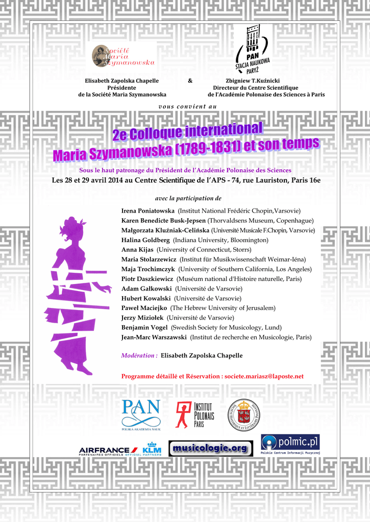 Elisabeth Zapolska Chapelle Présidente de la Société Maria Szymanowska & Zbigniew T.Kuźnicki Directeur du Centre Scientifique de l’Académie Polonaise des Sciences à Paris vous convient au Sous le haut patronage du Président de l’Académie Polonaise des Sciences Les 28 et 29 avril 2014 au Centre Scientifique de l’APS - 74, rue Lauriston, Paris 16e avec la participation de Irena Poniatowska (Institut National Frédéric Chopin,Varsovie) Karen Benedicte Busk-Jepsen (Thorvaldsens Museum, Copenhague) Małgorzata Kluźniak-Celińska (Université Musicale F.Chopin, Varsovie) Halina Goldberg (Indiana University, Bloomington) Anna Kijas (University of Connecticut, Storrs) Maria Stolarzewicz (Institut für Musikwissenschaft Weimar-Iéna) Maja Trochimczyk (University of Southern California, Los Angeles) Piotr Daszkiewicz (Muséum national d'Histoire naturelle, Paris) Adam Gałkowski (Université de Varsovie) Hubert Kowalski (Université de Varsovie) Paweł Maciejko (The Hebrew University of Jerusalem) Jerzy Miziołek (Université de Varsovie) Benjamin Vogel (Swedish Society for Musicology, Lund) Jean-Marc Warszawski (Institut de recherche en Musicologie, Paris) Modération : Elisabeth Zapolska Chapelle Programme détaillé et Réservation : [email protected]