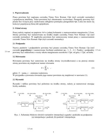 2.5 cm 1. Wprowadzenie Praca powinna być napisana czcionką Times New Roman 12pt (styl czcionki normalny) z pojedynczą interlinią. Tekst powinien być obustronnie wyrównany. Paragrafy powinny być pisane bez wcięcia przy zachowaniu odległości pomiędzy paragrafami 6pt. Linia nie może się kończyć pojedynczą literą lub spójnikiem. 2. Układ strony Pracę należy napisać na papierze A4 w jednej kolumnie z zastosowaniem marginesów 2,5cm. Strony powinny być numerowane na środku stopki czcionką Times New Roman 12p (styl czcionki normalny). W nagłówku powinien być umieszczony temat pracy z zastosowaniem czcionki Times New Roman 10pt (styl czcionki normalny). 2.1 Podpunkt 2.5 cm Nazwy punktów i podpunktów powinny być pisane czcionką Times New Roman 12p (styl czcionki pogrubiony) i numerowane liczbami arabskimi np.: 1, 2 , 2.1. Punkty i podpunkty 2.5 cm powinny być oddzielone o reszty tekstu marginesem szerokości 12pt. od góry i 12pt. od dołu. 2.2 Równania Równania powinny być ustawione na środku strony (wyśrodkowane) a na prawej stronie strony powinien się znajdować numer równania N S = ∑ xi , (1) i =1 gdzie: S – suma, x – zmienna wejściowa. W przypadku cytowania równania jego numer powinien się znajdować w nawiasie (1). 2.3 Rysunki Rysunki i tablice powinny być położone na środku strony, należy je numerować stosując liczby arabskie. (a) fs=44.1kHz Rfs=R⋅44.1kHz (b) Rfs=R⋅44.1kHz fs=44.1kHz Bank filtrów analizy H0(z) Rfs=R⋅44.1kHz Bank filtrów analizy xd(nT/R) x(nT) Interpolator x(nT/R) ↑R H0(z) xd(nT) Interpolator xd(nT/R) ↑R H1(z) xg(nT) Interpolator xg(nT/R) ↑R x(nT) H1(z) Rfs=R⋅44.1kHz xg(nT/R) Rys. 1. Schematy blokowe dwóch wariantów interpolacji sygnału i podziału na podpasma: (a) interpolacja i podział, (b) podział i interpolacja 2.5 cm 1 2.5 cm Tablica 1 Współczynniki projektowanych filtrów falowych Typ filtru γ0 γ1 γ2 Ilość operacji arytmetycznych Bessela 0.9545945 -0.929192 0.9981974 8m, 8d Butterwortha 0.9479508 -0.9410535 0.9911951 8m, 8d 3. Układ strony Odwołania do literatury powinny zawierać numer pozycji literaturowej umieszczony w nawiasie kwadratowym [1]. Literatura [1] Dąbrowski A., Figlak P., Gołębiowski R., Marciniak T., Cyfrowe przetwarzanie sygnałów przy użyciu procesorów sygnałowych, Wydawnictwo Politechniki Poznańskiej, Poznań, 1997. 2
