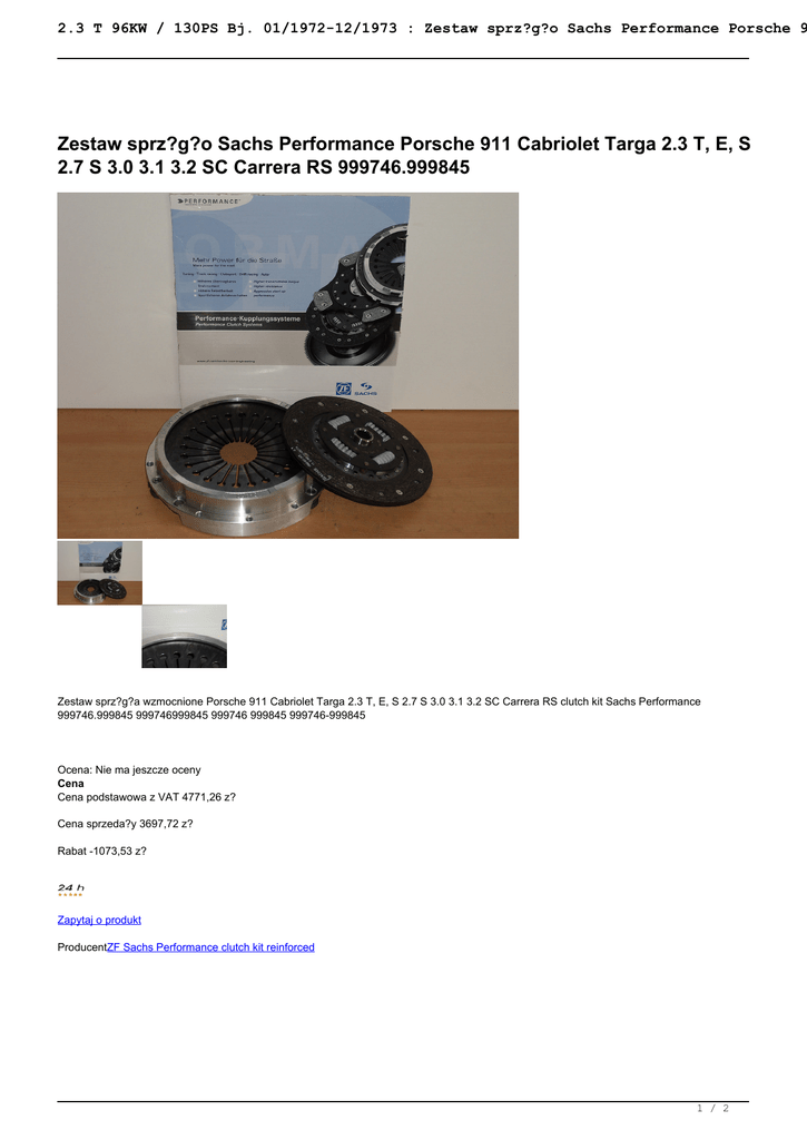 2.3 T 96KW / 130PS Bj. 01/1972-12/1973 : Zestaw sprz?g?o Sachs Performance Porsche 9 Zestaw sprz?g?o Sachs Performance Porsche 911 Cabriolet Targa 2.3 T, E, S 2.7 S 3.0 3.1 3.2 SC Carrera RS 999746.999845 Zestaw sprz?g?a wzmocnione Porsche 911 Cabriolet Targa 2.3 T, E, S 2.7 S 3.0 3.1 3.2 SC Carrera RS clutch kit Sachs Performance 999746.999845 999746999845 999746 999845 999746-999845 Ocena: Nie ma jeszcze oceny Cena Cena podstawowa z VAT 4771,26 z? Cena sprzeda?y 3697,72 z? Rabat -1073,53 z? Zapytaj o produkt ProducentZF Sachs Performance clutch kit reinforced 1 / 2 2.3 T 96KW / 130PS Bj. 01/1972-12/1973 : Zestaw sprz?g?o Sachs Performance Porsche 9 Opis Sachs Race Engineering / Sachs Performance Kupplung Set 999746 999845 bis 455NM+ / 337lb/ft+ mit gefedeter organischer Kupplungsscheibe 2 / 2 Powered by TCPDF (www.tcpdf.org)