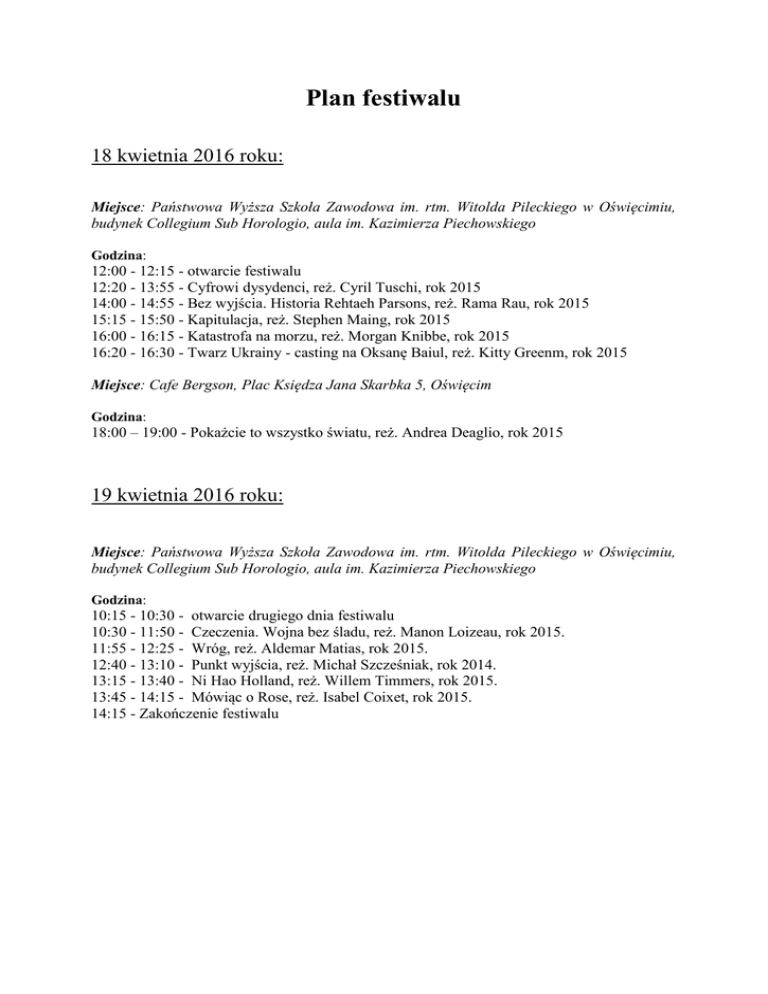 Plan festiwalu 18 kwietnia 2016 roku: Miejsce: Państwowa Wyższa Szkoła Zawodowa im. rtm. Witolda Pileckiego w Oświęcimiu, budynek Collegium Sub Horologio, aula im. Kazimierza Piechowskiego Godzina: 12:00 - 12:15 - otwarcie festiwalu 12:20 - 13:55 - Cyfrowi dysydenci, reż. Cyril Tuschi, rok 2015 14:00 - 14:55 - Bez wyjścia. Historia Rehtaeh Parsons, reż. Rama Rau, rok 2015 15:15 - 15:50 - Kapitulacja, reż. Stephen Maing, rok 2015 16:00 - 16:15 - Katastrofa na morzu, reż. Morgan Knibbe, rok 2015 16:20 - 16:30 - Twarz Ukrainy - casting na Oksanę Baiul, reż. Kitty Greenm, rok 2015 Miejsce: Cafe Bergson, Plac Księdza Jana Skarbka 5, Oświęcim Godzina: 18:00 – 19:00 - Pokażcie to wszystko światu, reż. Andrea Deaglio, rok 2015 19 kwietnia 2016 roku: Miejsce: Państwowa Wyższa Szkoła Zawodowa im. rtm. Witolda Pileckiego w Oświęcimiu, budynek Collegium Sub Horologio, aula im. Kazimierza Piechowskiego Godzina: 10:15 - 10:30 - otwarcie drugiego dnia festiwalu 10:30 - 11:50 - Czeczenia. Wojna bez śladu, reż. Manon Loizeau, rok 2015. 11:55 - 12:25 - Wróg, reż. Aldemar Matias, rok 2015. 12:40 - 13:10 - Punkt wyjścia, reż. Michał Szcześniak, rok 2014. 13:15 - 13:40 - Ni Hao Holland, reż. Willem Timmers, rok 2015. 13:45 - 14:15 - Mówiąc o Rose, reż. Isabel Coixet, rok 2015. 14:15 - Zakończenie festiwalu
