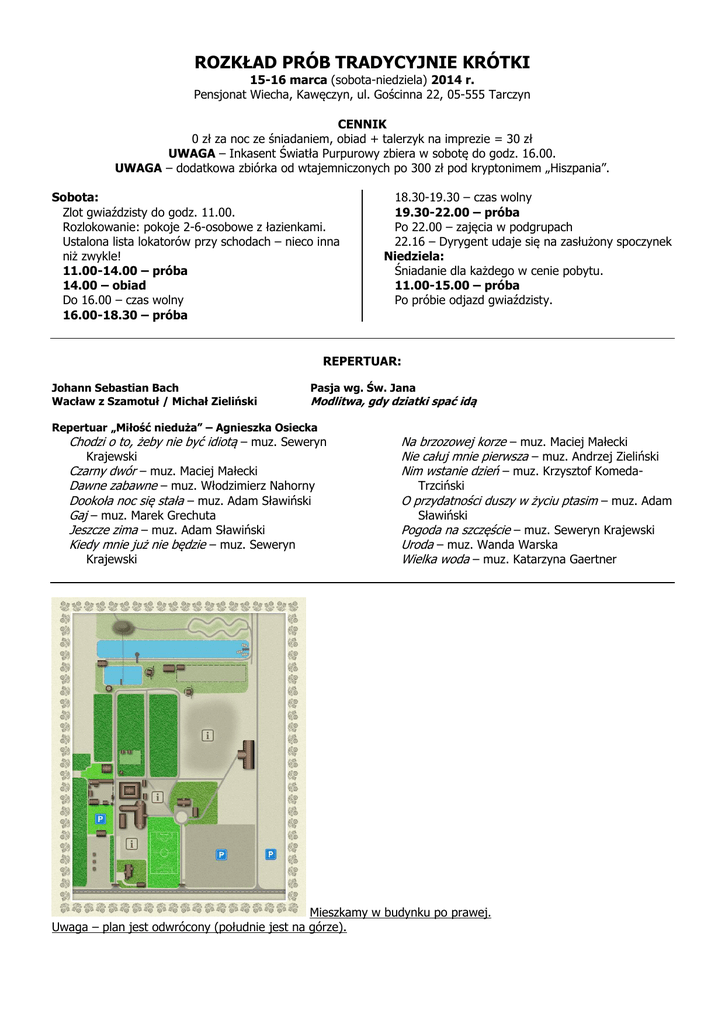 ROZKŁAD PRÓB TRADYCYJNIE KRÓTKI 15-16 marca (sobota-niedziela) 2014 r. Pensjonat Wiecha, Kawęczyn, ul. Gościnna 22, 05-555 Tarczyn CENNIK 0 zł za noc ze śniadaniem, obiad + talerzyk na imprezie = 30 zł UWAGA – Inkasent Światła Purpurowy zbiera w sobotę do godz. 16.00. UWAGA – dodatkowa zbiórka od wtajemniczonych po 300 zł pod kryptonimem „Hiszpania”. Sobota: Zlot gwiaździsty do godz. 11.00. Rozlokowanie: pokoje 2-6-osobowe z łazienkami. Ustalona lista lokatorów przy schodach – nieco inna niż zwykle! 11.00-14.00 – próba 14.00 – obiad Do 16.00 – czas wolny 16.00-18.30 – próba 18.30-19.30 – czas wolny 19.30-22.00 – próba Po 22.00 – zajęcia w podgrupach 22.16 – Dyrygent udaje się na zasłużony spoczynek Niedziela: Śniadanie dla każdego w cenie pobytu. 11.00-15.00 – próba Po próbie odjazd gwiaździsty. REPERTUAR: Johann Sebastian Bach Wacław z Szamotuł / Michał Zieliński Pasja wg. Św. Jana Modlitwa, gdy dziatki spać idą Repertuar „Miłość nieduża” – Agnieszka Osiecka Chodzi o to, żeby nie być idiotą – muz. Seweryn Krajewski Czarny dwór – muz. Maciej Małecki Dawne zabawne – muz. Włodzimierz Nahorny Dookoła noc się stała – muz. Adam Sławiński Gaj – muz. Marek Grechuta Jeszcze zima – muz. Adam Sławiński Kiedy mnie już nie będzie – muz. Seweryn Krajewski Na brzozowej korze – muz. Maciej Małecki Nie całuj mnie pierwsza – muz. Andrzej Zieliński Nim wstanie dzień – muz. Krzysztof KomedaTrzciński O przydatności duszy w życiu ptasim – muz. Adam Sławiński Pogoda na szczęście – muz. Seweryn Krajewski Uroda – muz. Wanda Warska Wielka woda – muz. Katarzyna Gaertner Mieszkamy w budynku po prawej. Uwaga – plan jest odwrócony (południe jest na górze). CHARAKTERYSTYCZNY BOCIAN WSKAZUJE DROGĘ PRZEZ TARCZYN Start licznika kilometrów na skrzyżowaniu Al. Krakowskiej z Łopuszańską – 34 km Wyjeżdżasz z Warszawy Al. Krakowską, czyli na Raszyn. Można sikać. Przez Raszyn do Janek – 7 km Na rozjeździe w Jankach – na Kraków trasą nr 7. Trasą nr 7 („krakowską”) do obwodnicy Tarczyna – 18,5 km Za Tarczynem jeszcze prosto przez Rembertów – 4 km 4 km za światłami na obwodnicy Tarczyna – skręt w lewo w drogę lokalną na Kawęczyn (drogowskaz „Kawęczyn 4” po prawej na poboczu, pas do skrętu w lewo). Od tego miejsca mogą pojawiać się drogowskazy firmowe na Gościniec Wiecha. Prosto i prosto aż droga sama skręci w prawo – 3,7 km Prosto jeszcze 1300 m, przez skrzyżowanie prosto – Pensjonat po prawej, wjazd w pierwszą bramę i za drogowskazami na parking „Pensjonat”. PRZEZ PIASECZNO I ZALESIE DOLNE Start licznika kilometrów na skrzyżowaniu Puławskiej z Płaskowickiej – 28 km Wyjeżdżasz z Warszawy ul. Puławską, czyli drogą krajową nr 79. Prosto do wielkiego skrzyżowania w Piasecznie – 7 km Na skrzyżowaniu najpierw w prawo i od razu w lewo (ul. Wojska Polskiego). Prosto do skrzyżowania z Sienkiewicza, czyli z drogą nr 722 – 1,5 km W prawo w drogę nr 722 na Grójec. Drogi nr 722 na Grójec trzymaj się przez kolejne 16 km. Uważaj w Zalesiu Dolnym (w lewo), w Jagarzewie (w prawo) i w Łosiu (prosto). Po 14 km przejedziesz wiaduktem nad torami kolejowymi – teraz uważaj! Miniesz las po prawej i od razu skręcasz w prawo – 1,5 km za wiaduktem nad torami – w drogę lokalną na Racibory (uwaga: drogowskaz schowany w krzakach po prawej, widać go w ostatniej chwili!). Prosto – przez mostek, łukiem w prawo, łukiem w lewo – do skrzyżowania w Raciborach – 2,5 km Skręcasz w lewo – może być drogowskaz Kawęczyn lub Lesznowolę. Prosto do kolejnego skrzyżowania – 1300 m Skręcasz w lewo – może być drogowskaz firmowy na Gościniec Wiecha. Prosto 600 m – Pensjonat po prawej, wjazd w pierwszą bramę i za drogowskazami na parking „Pensjonat”.