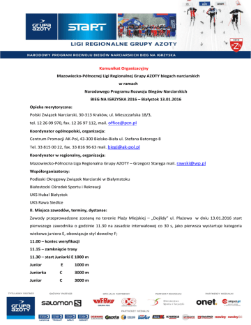 Komunikat Organizacyjny Mazowiecko-Północnej Ligi Regionalnej Grupy AZOTY biegach narciarskich w ramach Narodowego Programu Rozwoju Biegów Narciarskich BIEG NA IGRZYSKA 2016 – Białystok 13.01.2016 Opieka merytoryczna: Polski Związek Narciarski, 30-313 Kraków, ul. Mieszczańska 18/3, tel. 12 26 09 970, fax. 12 26 97 112, mail. [email protected] Koordynator ogólnopolski, organizacja: Centrum Promocji AK-Pol, 43-300 Bielsko-Biała ul. Stefana Batorego 8 Tel. 33 815 00 22, fax. 33 816 96 63 mail. [email protected] Koordynator w regionalny, organizacja: Mazowiecko-Północna Liga Regionalna Grupy AZOTY – Grzegorz Staręga mail. [email protected] Współorganizatorzy: Podlaski Okręgowy Związek Narciarski w Białymstoku Białostocki Ośrodek Sportu i Rekreacji UKS Hubal Białystok UKS Rawa Siedlce II. Miejsca zawodów, terminy, dystanse: Zawody przeprowadzone zostaną na terenie Plaży Miejskiej – „Dojlidy” ul. Plażowa w dniu 13.01.2016 start pierwszego zawodnika o godzinie 11.30 na zasadzie interwałowej co 30 s, jako pierwsza wystartuje kategoria wiekowa juniora E, obowiązuje styl dowolny F; 11.00 – koniec weryfikacji 11.15 – zamknięcie trasy 11.30 – start Juniorki E 1000 m Junior E 1000 m Juniorka C 3000 m Junior C 3000 m Juniorka D 2000 m Junior D 2000 m III. Sprawy organizacyjne: 1. Ligi Regionalne Grupy AZOTY są cyklem 25 zawodów w biegach narciarskich /po pięć w każdej z powyższych Lig Regionalnych/ przeznaczonym dla kategorii wiekowej Junior E (2004 i młodsi). Koordynator ogólnopolski dopuszcza możliwość startu w zawodach także kategorii Junior C (2000-2001), Junior D (2002-2003). 2. Zawody rozgrywane będą zgodnie z Narciarskim Regulaminem Sportowym i Regulaminem Lig Regionalnych Grupy AZOTY Narodowego Programu Rozwoju Biegów Narciarskich „Bieg na Igrzyska”. 3. Klasyfikacja generalna w danej Lidze Regionalnej Grupy AZOTY będzie prowadzona dla juniora E. Do klasyfikacji generalnej juniora E zaliczane będą cztery najlepsze starty z pięciu zawodów cyklu dla danej Ligi Regionalnej Grupy AZOTY. Najlepsi juniorzy E zostaną zakwalifikowani do finału Pucharu Grupy AZOTY. Prawo startu w finale Pucharu Grupy AZOTY będzie miało 12 najlepszych juniorek E i 12 najlepszych juniorów E z danej Ligi Regionalnej. Łącznie prawo kwalifikacji będzie miało 60 juniorek E i 60 juniorów E. 4. Punkty uzyskane przez juniorki/juniorów E w finale Pucharu Grupy AZOTY nie będą zaliczane do klasyfikacji klubowej Pucharu Grupy AZOTY. 5. Zgłoszenie na drukach PZN do godziny 15.00 dnia 12.01.2016 na adres mail. [email protected] lub [email protected] weryfikacja do godziny 11.00 w dniu zawodów obowiązkowo badania lekarskie lub oświadczenie rodziców, każdy zawodnik powinien być ubezpieczony od NNW, organizator nie odpowiada za pozostawiony sprzęt i za następstwa nieszczęśliwych wypadków. Udział w zawodach jest bezpłatny. 6. Niestawienie się zawodnika lub zawodniczki z numerem startowym na ceremonii dekoracji będzie skutkowało dyskwalifikacją, co jest równoznaczne z odebraniem punktów indywidualnych. 7. Zawody będą punktowane w sposób następujący: miejsce punkty miejsce punkty 1 100 16 15 2 80 17 14 3 60 18 13 4 50 19 12 5 45 20 11 6 40 21 10 7 36 22 9 8 32 23 8 9 29 24 7 10 26 25 6 11 24 26 5 12 22 27 4 13 20 28 3 14 18 29 2 15 16 30 1