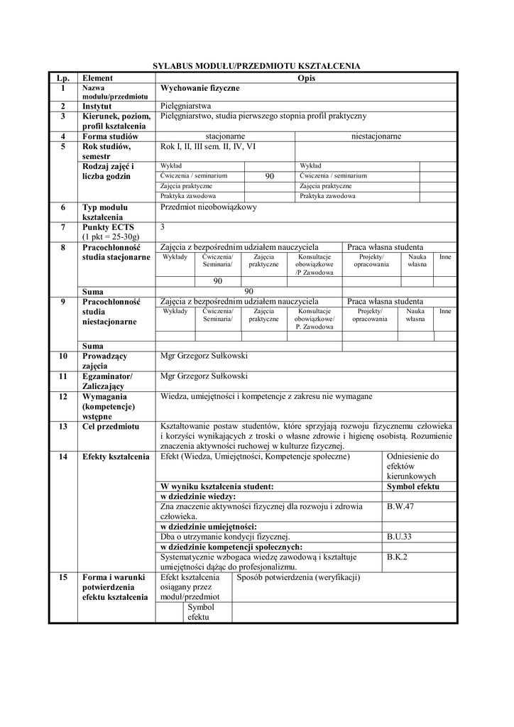 Lp. 1 2 3 4 5 6 7 8 Element Nazwa modułu/przedmiotu SYLABUS MODUŁU/PRZEDMIOTU KSZTAŁCENIA Opis Wychowanie fizyczne Instytut Kierunek, poziom, profil kształcenia Forma studiów Rok studiów, semestr Rodzaj zajęć i liczba godzin Pielęgniarstwa Pielęgniarstwo, studia pierwszego stopnia profil praktyczny Typ modułu kształcenia Punkty ECTS (1 pkt = 25-30g) Pracochłonność studia stacjonarne Przedmiot nieobowiązkowy stacjonarne Rok I, II, III sem. II, IV, VI niestacjonarne Wykład Wykład Ćwiczenia / seminarium Zajęcia praktyczne Praktyka zawodowa 90 Ćwiczenia / seminarium Zajęcia praktyczne Praktyka zawodowa 3 Zajęcia z bezpośrednim udziałem nauczyciela Wykłady Ćwiczenia/ Seminaria/ Zajęcia praktyczne Konsultacje obowiązkowe /P Zawodowa Praca własna studenta Projekty/ opracowania Nauka własna Inne 90 9 Suma Pracochłonność studia niestacjonarne 13 Suma Prowadzący zajęcia Egzaminator/ Zaliczający Wymagania (kompetencje) wstępne Cel przedmiotu 14 Efekty kształcenia 15 Forma i warunki potwierdzenia efektu kształcenia 10 11 12 90 Zajęcia z bezpośrednim udziałem nauczyciela Wykłady Ćwiczenia/ Seminaria/ Zajęcia praktyczne Konsultacje obowiązkowe/ P. Zawodowa Praca własna studenta Projekty/ opracowania Nauka własna Inne Mgr Grzegorz Sułkowski Mgr Grzegorz Sułkowski Wiedza, umiejętności i kompetencje z zakresu nie wymagane Kształtowanie postaw studentów, które sprzyjają rozwoju fizycznemu człowieka i korzyści wynikających z troski o własne zdrowie i higienę osobistą. Rozumienie znaczenia aktywności ruchowej w kulturze fizycznej. Efekt (Wiedza, Umiejętności, Kompetencje społeczne) Odniesienie do efektów kierunkowych W wyniku kształcenia student: Symbol efektu w dziedzinie wiedzy: Zna znaczenie aktywności fizycznej dla rozwoju i zdrowia B.W.47 człowieka. w dziedzinie umiejętności: Dba o utrzymanie kondycji fizycznej. B.U.33 w dziedzinie kompetencji społecznych: Systematycznie wzbogaca wiedzę zawodową i kształtuje B.K.2 umiejętności dążąc do profesjonalizmu. Efekt kształcenia Sposób potwierdzenia (weryfikacji) osiągany przez moduł/przedmiot Symbol efektu student przygotowuje konspekt rozgrzewki oraz na bieżąco przygotowuje się do treści realizowanych na zajęciach B.U33 przeprowadza rozgrzewkę na zajęciach prezentacja ustna BK2 przedłużona obserwacja przez opiekuna, nauczyciela prowadzącego, samoocena studenta Kompetencja społeczne umiejętności wiedza B.W.47. 16 17 18 Stosowane metody dydaktyczne Forma i warunki zaliczenia modułu, zasady dopuszczenia do egzaminu oraz zaliczenia poszczególnych zajęć Treści merytoryczne przedmiotu 19 Wykaz literatury podstawowej 20 Wykaz literatury uzupełniającej (pomocniczej) Pokaz z objaśnieniem, pogadanka, metody podające, poszukujące i ekspresyjne. Zasady dopuszczenia do zaliczenia 1. Obecność na zajęciach 2. Uzyskanie zaliczenia z ćwiczeń Tematyka ćwiczeń: 1. Umiejętności motoryczne, charakterystyka. 2. Metody i środki nauczania czynności ruchowych. 3. Podnoszenie własnej sprawności fizycznej (poprzez świadomy, aktywny udział w zajęciach). 4. Nauka ćwiczeń kształtujących motorykę i prawidłową postawę ciała oraz wpływ ćwiczeń fizycznych na zdrowie i profilaktykę niektórych chorób. 5. Testy sprawności fizycznej do oceny stanu fizycznego własnego organizmu. 6. Dostosowanie i programowanie ćwiczeń w zależności od wieku i aktualnego stanu zdrowia oraz sprawności fizycznej organizmu. 7. Formy aktywnego wypoczynku, realizacja wybranych (np. jogging, turystyka górska, jazda na rowerze, jazda na rolkach, spacerowanie, itd.). 8. Doskonalenie wybranych elementów gimnastyki oraz gier i zabaw. 1. Bondarowicz M. : Zabawy w grach sportowych. Warszawa 1995. 2. Maszczak T.: Metodyka wychowania fizycznego. Warszawa 1995. 3. Mazurek L.: Gimnastyka podstawowa. Warszawa 1971. 4. Nowotny J.: Antropomotoryka. Poznań 2003. 5. Trześniowski R.: Zabawy i gry ruchowe. Warszawa 1995. 6. Ulatowski T.: Teoria sportu. Tom I. Warszawa 1992. 1. Burger Doris Nordic Walking – sposób na zdrowie i kondycję. Warszawa 2010. 2. Gołąbek T., Jasiak H., Jucewicz A.: ABC sport dla wszystkich. Warszawa 1988. 3. Mała Encyklopedia Sportu. Warszawa 1980.
