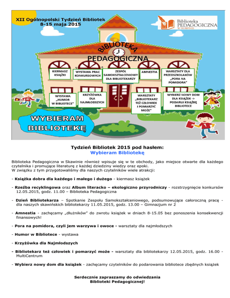 Tydzień Bibliotek 2015 pod hasłem: Wybieram Bibliotekę Biblioteka Pedagogiczna w Skawinie również wpisuje się w te obchody, jako miejsce otwarte dla każdego czytelnika i promujące literaturę z każdej dziedziny wiedzy oraz epoki. W związku z tym przygotowaliśmy dla naszych czytelników wiele atrakcji: - Książka dobra dla każdego i małego i dużego - kiermasz książek - Rzeźba recyklingowa oraz Album literacko – ekologiczno przyrodniczy - rozstrzygnięcie konkursów 12.05.2015, godz. 11.00 – Biblioteka Pedagogiczna - Dzień Bibliotekarza – Spotkanie Zespołu Samokształceniowego, podsumowujące całoroczną pracę dla naszych skawińskich bibliotekarzy 11.05.2015, godz. 13.00 – Gimnazjum nr 2 - Amnestia - zachęcamy „dłużników” do zwrotu książek w dniach 8-15.05 bez ponoszenia konsekwencji finansowych! - Pora na pomidora, czyli jem warzywa i owoce - warsztaty dla najmłodszych - Humor w Bibliotece - wystawa - Krzyżówka dla Najmłodszych - Bibliotekarz też człowiek i pomarzyć może - warsztaty dla bibliotekarzy 12.05.2015, godz. 16.00 MultiCentrum - Wybierz nowy dom dla książek - zachęcamy czytelników do podarowania bibliotece zbędnych książek Serdecznie zapraszamy do odwiedzania Biblioteki Pedagogicznej!