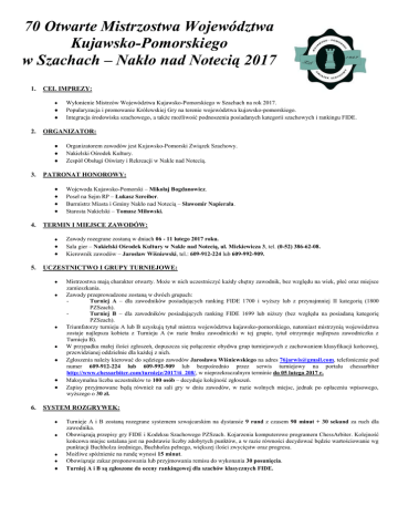 70 Otwarte Mistrzostwa Województwa Kujawsko-Pomorskiego w Szachach – Nakło nad Notecią 2017 1. CEL IMPREZY: Wyłonienie Mistrzów Województwa Kujawsko-Pomorskiego w Szachach na rok 2017. Popularyzacja i promowanie Królewskiej Gry na terenie województwa kujawsko-pomorskiego. Integracja środowiska szachowego, a także możliwość podnoszenia posiadanych kategorii szachowych i rankingu FIDE. 2. ORGANIZATOR: Organizatorem zawodów jest Kujawsko-Pomorski Związek Szachowy. Nakielski Ośrodek Kultury. Zespół Obsługi Oświaty i Rekreacji w Nakle nad Notecią. 3. PATRONAT HONOROWY: Wojewoda Kujawsko-Pomorski – Mikołaj Bogdanowicz. Poseł na Sejm RP – Łukasz Szreiber. Burmistrz Miasta i Gminy Nakło nad Notecią – Sławomir Napierała. Starosta Nakielski – Tomasz Miłowski. 4. TERMIN I MIEJSCE ZAWODÓW: Zawody rozegrane zostaną w dniach 06 - 11 lutego 2017 roku. Sala gier – Nakielski Ośrodek Kultury w Nakle nad Notecią, ul. Mickiewicza 3, tel. (0-52) 386-62-08. Kierownik zawodów – Jarosław Wiśniewski, tel.: 609-912-224 lub 609-992-909. 5. UCZESTNICTWO I GRUPY TURNIEJOWE: Mistrzostwa mają charakter otwarty. Może w nich uczestniczyć każdy chętny zawodnik, bez względu na wiek, płeć oraz miejsce zamieszkania. Zawody przeprowadzone zostaną w dwóch grupach: Turniej A – dla zawodników posiadających ranking FIDE 1700 i wyższy lub z przynajmniej II kategorią (1800 PZSzach). Turniej B – dla zawodników posiadających ranking FIDE 1699 lub niższy (bez względu na posiadaną kategorię PZSzach). Triumfatorzy turnieju A lub B uzyskują tytuł mistrza województwa kujawsko-pomorskiego, natomiast mistrzynią województwa zostaje najlepsza kobieta z Turnieju A (w razie braku zawodniczki w tej grupie, tytuł otrzymuje najlepsza zawodniczka z Turnieju B). W przypadku małej ilości zgłoszeń, dopuszcza się połączenie obydwu grup turniejowych z zachowaniem klasyfikacji końcowej, przewidzianej oddzielnie dla każdej z nich. Zgłoszenia należy kierować do sędziego zawodów Jarosława Wiśniewskiego na adres [email protected], telefonicznie pod numer 609-912-224 lub 609-992-909 lub bezpośrednio przez serwis turniejowy na portalu chessarbiter http://www.chessarbiter.com/turnieje/2017/ti_208/, w nieprzekraczalnym terminie do 05 lutego 2017 r. Maksymalna liczba uczestników to 100 osób – decyduje kolejność zgłoszeń. Zapisy przyjmowane będą również na sali gry w dniu zawodów, w razie wolnych miejsc, jednak po opłaceniu wpisowego, wyższego o 30 zł. 6. SYSTEM ROZGRYWEK: Turnieje A i B zostaną rozegrane systemem szwajcarskim na dystansie 9 rund z czasem 90 minut + 30 sekund za ruch dla zawodnika. Obowiązują przepisy gry FIDE i Kodeksu Szachowego PZSzach. Kojarzenia komputerowe programem ChessArbiter. Kolejność końcowa miejsc ustalana jest na podstawie liczby zdobytych punktów, a w razie równości decydować będzie wartościowanie wg punktacji Buchholza średniego, Buchholza pełnego, większej ilości zwycięstw oraz progresu. Możliwe spóźnienie na rundę wynosi 15 minut. Obowiązuje zakaz proponowania lub przyjmowania remisu do wykonania 30 posunięcia. Turniej A i B są zgłoszone do oceny rankingowej dla szachów klasycznych FIDE. 7. PROGRAM MISTRZOSTW: 06 luty 2017 r. (poniedziałek) 07 luty 2017 r. (wtorek) 08 luty 2017 r. (środa) 09 luty 2017 r. (czwartek) 10 luty 2017 r. (piątek) 11 luty 2017 r. (sobota) - 1300 ÷ 1430 - 1500 ÷ 1515 - 1515 - 1000 ÷ 1400 - 1400 ÷ 1500 - 1500 - 1000 ÷ 1400 - 1400 ÷ 1500 - 1500 - 1000 ÷ 1400 - 1700 ÷ 1930 - 1000 ÷ 1400 - 1400 ÷ 1500 - 1500 - 0900 ÷ 1300 - 1330 ÷ 1400 - 1415 8. – weryfikacja listy startowej – odprawa techniczna. – otwarcie mistrzostw z udziałem zaproszonych gości – runda I. – runda II. – przerwa obiadowa. – runda III. – runda IV. – przerwa obiadowa. – runda V. – runda VI. – IX rundowy Turniej Szachów Błyskawicznych z tempem 3+2. – runda VII. – przerwa obiadowa. – runda VIII. – runda IX. – podsumowanie mistrzostw, wręczenie pucharów, dyplomów i nagród. – Zakończenie mistrzostw. ZASADY FINANSOWANIA: Zawodnicy zobowiązani są do wpłacenia wpisowego (uwzględniającego opłatę rankingową do FIDE) w wysokości: Turniej A: seniorzy – 100 zł, juniorzy – 90 zł. Turniej B: seniorzy – 90 zł, juniorzy – 80 zł. Wpisowe należy wpłacać przelewem na konto Kujawsko-Pomorskiego Związku Szachowego nr 95 9511 0000 2001 0004 3498 0001 wraz z podaniem imienia i nazwiska osoby, której wpłata dotyczy (w przypadku wpłat zbiorowych, imiona i nazwiska zawodników) do dnia 04.02.2017 r. W przypadkach braku możliwości dokonania płatności przelewem, kierownik zawodów przyjmował będzie wpłaty na sali gier (tylko zgłoszenie do mistrzostw w dniu zawodów obarczone będzie koniecznością wpłaty wpisowego o 30 zł wyższego). Koszty organizacyjne pokrywa Nakielski Ośrodek Kultury oraz Kujawsko-Pomorski Związek Szachowy. 9. NAGRODY: Zawodnicy z miejsc I-III w turniejach A oraz B oraz mistrzyni województwa kujawsko-pomorskiego otrzymują puchary, dyplomy i nagrody finansowe w podanych poniżej wysokościach*: TURNIEJ A: I miejsce – 750 zł. II miejsce – 600 zł. III miejsce – 500 zł. IV miejsce – 400 zł. V miejsce – 300 zł. TURNIEJ B: I miejsce – 500 zł. II miejsce – 400 zł. III miejsce – 300 zł. IV miejsce – 250 zł V miejsce – 200 zł. *Podane powyżej sumy uwzględniają udział co najmniej 40 uczestników w każdej z grup. W przypadku niższej frekwencji, organizator zastrzega sobie możliwość obniżenia wysokości podanych powyżej nagród w stosunku procentowym do ostatecznej ilości zawodników, np. przy 30 uczestnikach, wysokość nagród spada o 25%. Ostateczna wysokość nagród finansowych zostanie podana przed rozpoczęciem 1 rundy. Pula nagród rzeczowych w zawodach wynosić będzie ok. 2.500,00 zł, a nagrody te będą wręczane co najmniej do 15 miejsca w każdym z turniejów lub za da