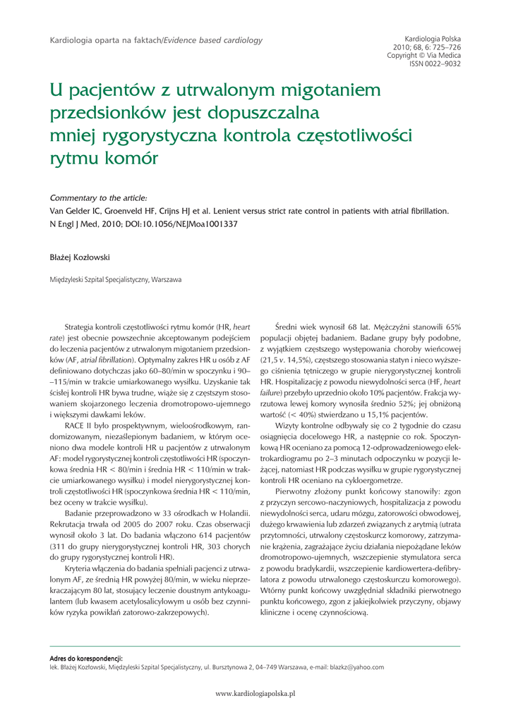 Kardiologia oparta na faktach/Evidence based cardiology Kardiologia Polska 2010; 68, 6: 725–726 Copyright © Via Medica ISSN 0022–9032 U pacjentów z utrwalonym migotaniem przedsionków jest dopuszczalna mniej rygorystyczna kontrola częstotliwości rytmu komór Commentary to the article: Van Gelder IC, Groenveld HF, Crijns HJ et al. Lenient versus strict rate control in patients with atrial fibrillation. N Engl J Med, 2010; DOI:10.1056/NEJMoa1001337 Błażej Kozłowski Międzyleski Szpital Specjalistyczny, Warszawa Strategia kontroli częstotliwości rytmu komór (HR, heart rate) jest obecnie powszechnie akceptowanym podejściem do leczenia pacjentów z utrwalonym migotaniem przedsionków (AF, atrial fibrillation). Optymalny zakres HR u osób z AF definiowano dotychczas jako 60–80/min w spoczynku i 90– –115/min w trakcie umiarkowanego wysiłku. Uzyskanie tak ścisłej kontroli HR bywa trudne, wiąże się z częstszym stosowaniem skojarzonego leczenia dromotropowo-ujemnego i większymi dawkami leków. RACE II było prospektywnym, wieloośrodkowym, randomizowanym, niezaślepionym badaniem, w którym oceniono dwa modele kontroli HR u pacjentów z utrwalonym AF: model rygorystycznej kontroli częstotliwości HR (spoczynkowa średnia HR < 80/min i średnia HR < 110/min w trakcie umiarkowanego wysiłku) i model nierygorystycznej kontroli częstotliwości HR (spoczynkowa średnia HR < 110/min, bez oceny w trakcie wysiłku). Badanie przeprowadzono w 33 ośrodkach w Holandii. Rekrutacja trwała od 2005 do 2007 roku. Czas obserwacji wynosił około 3 lat. Do badania włączono 614 pacjentów (311 do grupy nierygorystycznej kontroli HR, 303 chorych do grupy rygorystycznej kontroli HR). Kryteria włączenia do badania spełniali pacjenci z utrwalonym AF, ze średnią HR powyżej 80/min, w wieku nieprzekraczającym 80 lat, stosujący leczenie doustnym antykoagulantem (lub kwasem acetylosalicylowym u osób bez czynników ryzyka powikłań zatorowo-zakrzepowych). Średni wiek wynosił 68 lat. Mężczyźni stanowili 65% populacji objętej badaniem. Badane grupy były podobne, z wyjątkiem częstszego występowania choroby wieńcowej (21,5 v. 14,5%), częstszego stosowania statyn i nieco wyższego ciśnienia tętniczego w grupie nierygorystycznej kontroli HR. Hospitalizację z powodu niewydolności serca (HF, heart failure) przebyło uprzednio około 10% pacjentów. Frakcja wyrzutowa lewej komory wynosiła średnio 52%; jej obniżoną wartość (< 40%) stwierdzano u 15,1% pacjentów. Wizyty kontrolne odbywały się co 2 tygodnie do czasu osiągnięcia docelowego HR, a następnie co rok. Spoczynkową HR oceniano za pomocą 12-odprowadzeniowego elektrokardiogramu po 2–3 minutach odpoczynku w pozycji leżącej, natomiast HR podczas wysiłku w grupie rygorystycznej kontroli HR oceniano na cykloergometrze. Pierwotny złożony punkt końcowy stanowiły: zgon z przyczyn sercowo-naczyniowych, hospitalizacja z powodu niewydolności serca, udaru mózgu, zatorowości obwodowej, dużego krwawienia lub zdarzeń związanych z arytmią (utrata przytomności, utrwalony częstoskurcz komorowy, zatrzymanie krążenia, zagrażające życiu działania niepożądane leków dromotropowo-ujemnych, wszczepienie stymulatora serca z powodu bradykardii, wszczepienie kardiowertera-defibrylatora z powodu utrwalonego częstoskurczu komorowego). Wtórny punkt końcowy uwzględniał składniki pierwotnego punktu końcowego, zgon z jakiejkolwiek przyczyny, objawy kliniczne i ocenę czynnościową. Adres do korespondencji: lek. Błażej Kozłowski, Międzyleski Szpital Specjalistyczny, ul. Bursztynowa 2, 04–749 Warszawa, e-mail: [email protected] www.kardiologiapolska.pl 726 Błażej Kozłowski Niewydolność serca definiowano jako hospitalizację z powodu HF wymagającą rozpoczęcia lub zwiększenia dawki diuretyków. Udar mózgu definiowano jako nagłe wystąpienie ogniskowego ubytku neurologicznego związane z zamknięciem dużej tętnicy mózgowej udokumentowanym w badaniu obrazowym. Duże krwawienie definiowano jako objawowe krwawienie, krwawienie powodujące spadek hemoglobiny o co najmniej 20 g/l lub wymagające przetoczenia co najmniej 2 jednostek krwi. W grupach nierygorystycznej i rygorystycznej kontroli HR stosowano odpowiednio: beta-adrenolityki w monoterapii u 42,4 v. 20,1% pacjentów (p < 0,001), werapamil lub diltiazem w monoterapii u 5,8 v. 5,3% (p = 0,78), digoksynę w monoterapii u 6,8 v. 1,7% (p = 0,002), beta-adrenolityk w połączeniu z werapamilem lub diltiazemem u 3,9 v. 12,5% (p < 0,001), beta-adrenolityk w połączeniu z digoksyną u 19,3 v. 37,3% (p < 0,001), digoksynę w połączeniu z werapamilem lub diltiazemem u 5,8 v. 9,6% (p = 0,08), beta-adrenolityk w połączeniu z digoksyną oraz werapamilem lub diltiazemem u 1,0 v. 8,9% (p < 0,001). Leczenia dromotropowo-ujemnego nie wymagało 10,3% pacjentów w grupie nierygorystycznej kontroli HR i 1,0% w grupie rygorystycznej kontroli HR (p < 0,001). W grupie nierygorystycznej kontroli HR dawka beta-adrenolityku w przeliczeniu na metoprolol była niższa (120 v. 162 mg, p < 0,001), podobnie jak dawka werapamilu (166 v. 217 mg, p < 0,001); różnice dotyczące dawki diltiazemu i digoksyny nie były istotne statystycznie. Antagonistę witaminy K stosowano u 98,7% osób, a kwas acetylosalicylowy u pozostałych pacjentów. Łączna liczba wizyt niezbędna do uzyskania pożądanej HR była znacznie wyższa w grupie rygorystycznej kontroli HR (684 v. 75, p < 0,001). W grupie nierygorystycznej kontroli HR pożądaną HR osiągnięto u 97,7%, natomiast w grupie rygorystycznej kontroli HR u 75,2% osób. Pożądaną HR w trakcie umiarkowanego wysiłku osiągnięto w tej grupie u 72,6% pacjentów. Po osiągnięciu docelowej kontroli częstotliwości rytmu komór średnia spoczynkowa HR w grupach nierygorystycznej i rygorystycznej kontroli HR wynosiła 93 v. 76/min (p < 0,001). Podczas wizyty rocznej średnia spoczynkowa HR wynosiła 86 v. 75/min (p < 0,001), p