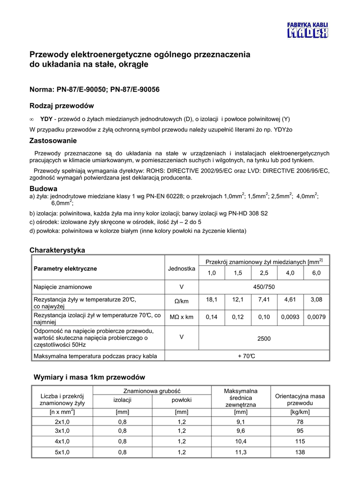 Przewody elektroenergetyczne ogólnego przeznaczenia do układania na stałe, okrągłe Norma: PN-87/E-90050; PN-87/E-90056 Rodzaj przewodów • YDY - przewód o Ŝyłach miedzianych jednodrutowych (D), o izolacji i powłoce polwinitowej (Y) W przypadku przewodów z Ŝyłą ochronną symbol przewodu naleŜy uzupełnić literami Ŝo np. YDYŜo Zastosowanie Przewody przeznaczone są do układania na stałe w urządzeniach i instalacjach elektroenergetycznych pracujących w klimacie umiarkowanym, w pomieszczeniach suchych i wilgotnych, na tynku lub pod tynkiem. Przewody spełniają wymagania dyrektyw: ROHS: DIRECTIVE 2002/95/EC oraz LVD: DIRECTIVE 2006/95/EC, zgodność wymagań potwierdzana jest deklaracją producenta. Budowa 2 2 2 2 a) Ŝyła: jednodrutowe miedziane klasy 1 wg PN-EN 60228; o przekrojach 1,0mm ; 1,5mm ; 2,5mm ; 4,0mm ; 2 6,0mm ; b) izolacja: polwinitowa, kaŜda Ŝyła ma inny kolor izolacji; barwy izolacji wg PN-HD 308 S2 c) ośrodek: izolowane Ŝyły skręcone w ośrodek, ilość Ŝył – 2 do 5 d) powłoka: polwinitowa w kolorze białym (inne kolory powłoki na Ŝyczenie klienta) Charakterystyka Przekrój znamionowy Ŝył miedzianych [mm Parametry elektryczne Jednostka Napięcie znamionowe 1,0 1,5 V Rezystancja Ŝyły w temperaturze 20°C, co najwyŜej Rezystancja izolacji Ŝył w temperaturze 70°C, co najmniej Odporność na napięcie probiercze przewodu, wartość skuteczna napięcia probierczego o częstotliwości 50Hz 2,5 2] 4,0 6,0 450/750 Ω/km 18,1 12,1 7,41 4,61 3,08 MΩ x km 0,14 0,12 0,10 0,0093 0,0079 V Maksymalna temperatura podczas pracy kabla 2500 + 70°C Wymiary i masa 1km przewodów [n x mm ] [mm] [mm] Maksymalna średnica zewnętrzna [mm] 2x1,0 0,8 1,2 9,1 78 3x1,0 0,8 1,2 9,6 95 4x1,0 0,8 1,2 10,4 115 5x1,0 0,8 1,2 11,3 138 Liczba i przekrój znamionowy Ŝyły 2 Znamionowa grubość izolacji powłoki Orientacyjna masa przewodu [kg/km] 2x1,5 0,8 1,2 9,6 93 3x1,5 0,8 1,2 10,2 115 4x1,5 0,8 1,2 11,0 141 5x1,5 0,8 1,2 12,1 168 2x2,5 0,8 1,2 10,4 121 3x2,5 0,8 1,2 11,0 152 4x2,5 0,8 1,2 12,0 186 5x2,5 0,8 1,2 13,3 223 2x4,0 0,9 1,2 11,8 169 3x4,0 0,9 1,2 12,6 219 4x4,0 0,9 1,3 13,9 276 5x4,0 0,9 1,3 15,7 359 2x6,0 0,9 1,2 12,9 218 3x6,0 0,9 1,3 13,9 289 4x6,0 0,9 1,3 15,2 361 5x6,0 0,9 1,3 17,3 435 Pakowanie KrąŜki owinięte folią, długość odcinków fabrykacyjnych – wg Ŝyczenia klienta; standardowo - 100m. Na szpulach owinięte folią. Informacje dodatkowe Kolory izolacji Ŝył: Przewody z Ŝyłą ochronną (zielono-Ŝółtą) Liczba Ŝył śyła ochronna 3 zielono-Ŝółta niebieska 4 zielono-Ŝółta 4* zielono-Ŝółta niebieska 5 zielono-Ŝółta niebieska * - tylko do określonych zastosowań śyły robocze brązowa brązowa czarna brązowa czarna brązowa czarna szara szara Przewody bez Ŝyły ochronnej (zielono-Ŝółtej) Liczba Ŝył śyła ochronna 2 niebieska brązowa 3 brązowa 3* niebieska brązowa 4 niebieska brązowa 5 niebieska brązowa * - tylko do określonych zastosowań śyły robocze czarna czarna czarna czarna szara szara szara czarna