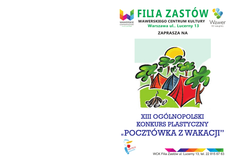 FILI A ZASTÓW WAWERSKIEGO CENTRUM KULTURY Warszawa ul.. Lucerny 13 ZAPRASZA NA XIII OGÓLNOPOLSKI KONKURS PLASTYCZNY POCZTÓWKA Z WAKACJI” “ WCK Filia Zastów ul. Lucerny 13, tel. 22 815 67 63 G£ÓWNE ZA£O¯ENIA KONKURSU: -zatrzymanie wspomnieñ wakacyjnych, -rozwijanie i kszta³towanie ¿ywej wyobraŸni plastycznej, -upowszechnienie twórczoœci nieprofesjonalnej, -prezentacja talentów plastycznych. UCZESTNICY KONKURSU: -indywidualni, -dzieci, m³odzie¿, doroœli dzia³aj¹cy w przedszkolach, œwietlicach, klubach, placówkach kultury, placówkach wychowawczych i innych. PRZEPISY OGÓLNE: Ka¿dy uczestnik mo¿e z³o¿yæ tylko jedn¹ pracê, wykonan¹ dowoln¹ p³ask¹ technik¹ (bez komputerowej). Prace na konkurs nale¿y przes³aæ po wewnêtrznej ocenie. Pocztówka (10 cm x 15 cm) musi byæ oprawiona w passe-partout (szerokoœæ ramki 0,5 cm z ka¿dej strony). Ca³kowity rozmiar pocztówki to 11 cm x 16 cm. UWAGA: Prace wykonane z plasteliny oraz zawieraj¹ce gotowe elementy, to znaczy niewykonane w³asnorêcznie przez autora (cekiny, guziki, serwetki z nadrukiem, muszelki itp.) nie bêd¹ oceniane. Do ka¿dej pracy nale¿y do³¹czyæ (na odwrocie) informacjê zawieraj¹c¹ imiê i nazwisko, wiek autora (nie klasê), nazwê placówki, telefon, adres e-mail, imiê i nazwisko opiekuna artystycznego. Metryczki prosimy wype³niaæ drukowanymi literami (patrz wzór w regulaminie). Wszystkie prace z³o¿one na konkurs przechodz¹ na w³asnoœæ Organizatora. Prawa autorskie przechodz¹ na w³asnoœæ Organizatora. Udzia³ w konkursie jest jednoczeœnie zgod¹ na filmowanie, fotografowanie oraz bezp³atn¹ publikacjê prac, jak i upublicznianie wizerunku na stronach internetowych, gazetach itp. , promuj¹cych dzia³alnoœæ kulturaln¹ i udzia³ w konkursie.Organizator zastrzega sobie mo¿liwoœæ zmiany terminów opublikowania protoko³u jury na stronie internetowej oraz terminu i miejsca wrêczenia nagród. Sprawy nie ujête w regulaminie rozstrzyga Organizator. Prosimy o do³¹czenie listy wszystkich autorów przes³anych prac, opatrzon¹ piecz¹tk¹ firmow¹. KATEGORIE WIEKOWE: - 3-4 lata, 5-6 lat, 7-9 lat, 10-13 lat, 14-16 lat, powy¿ej 17 lat. JURY OCENIAJ¥C PRACÊ ZWRACA UWAGÊ NA: - starannoœæ wykonania, - wra¿enie artystyczne, - samodzielnoœæ. PRACE NALE¯Y Z£O¯YÆ LUB PRZES£AÆ NA ADRES: FILIA ZASTÓW WAWERSKIEGO CENTRUM KULTURY ul. LUCERNY 13 04-687 WARSZAWA do dnia 14 PADZIERNIKA 2016 roku (liczy siê data wp³ywu) Uroczyste podsumowanie konkursu oraz wrêczenie nagród odbêdzie siê w dniu 5 LISTOPADA 2016 roku. Lista laureatów oraz godzina wrêczenia nagród bêdzie zamieszczona w dniu 25 PADZIERNIKA 2016 roku na naszej stronie internetowej: www.wck-wawer.pl/zastow Dla zwyciêzców oraz opiekunów artystycznych przewidziano nagrody! Wzór metryczki KASIA KOWALSKA, 7 LAT MIEJSKI OŒRODEK KULTURY UL.POLECZKI 22, 04-687 WARSZAWA TEL. 226159834, [email protected] PRACA WYKONANA POD KIERUNKIEM JANA NOWAKA