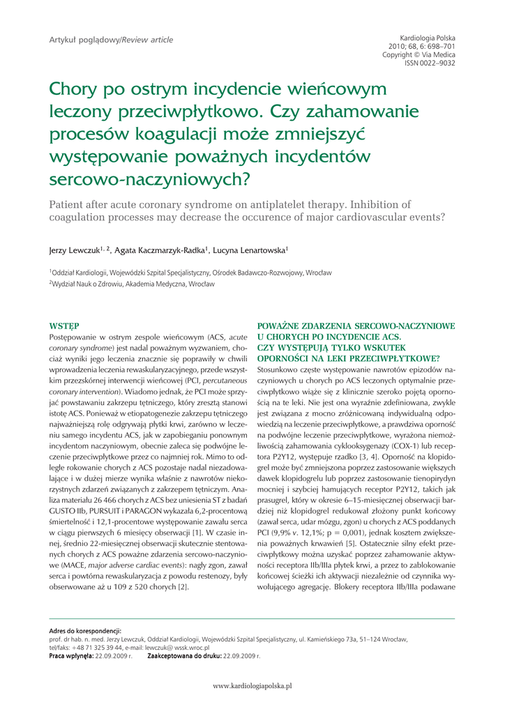 Kardiologia Polska 2010; 68, 6: 698–701 Copyright © Via Medica ISSN 0022–9032 Artykuł poglądowy/Review article Chory po ostrym incydencie wieńcowym leczony przeciwpłytkowo. Czy zahamowanie procesów koagulacji może zmniejszyć występowanie poważnych incydentów sercowo−naczyniowych? Patient after acute coronary syndrome on antiplatelet therapy. Inhibition of coagulation processes may decrease the occurence of major cardiovascular events? Jerzy Lewczuk1, 2, Agata Kaczmarzyk−Radka1, Lucyna Lenartowska1 1Oddział Kardiologii, Wojewódzki Szpital Specjalistyczny, Ośrodek Badawczo-Rozwojowy, Wrocław 2Wydział Nauk o Zdrowiu, Akademia Medyczna, Wrocław WSTĘP Postępowanie w ostrym zespole wieńcowym (ACS, acute coronary syndrome) jest nadal poważnym wyzwaniem, chociaż wyniki jego leczenia znacznie się poprawiły w chwili wprowadzenia leczenia rewaskularyzacyjnego, przede wszystkim przezskórnej interwencji wieńcowej (PCI, percutaneous coronary intervention). Wiadomo jednak, że PCI może sprzyjać powstawaniu zakrzepu tętniczego, który zresztą stanowi istotę ACS. Ponieważ w etiopatogenezie zakrzepu tętniczego najważniejszą rolę odgrywają płytki krwi, zarówno w leczeniu samego incydentu ACS, jak w zapobieganiu ponownym incydentom naczyniowym, obecnie zaleca się podwójne leczenie przeciwpłytkowe przez co najmniej rok. Mimo to odległe rokowanie chorych z ACS pozostaje nadal niezadowalające i w dużej mierze wynika właśnie z nawrotów niekorzystnych zdarzeń związanych z zakrzepem tętniczym. Analiza materiału 26 466 chorych z ACS bez uniesienia ST z badań GUSTO IIb, PURSUIT i PARAGON wykazała 6,2-procentową śmiertelność i 12,1-procentowe występowanie zawału serca w ciągu pierwszych 6 miesięcy obserwacji [1]. W czasie innej, średnio 22-miesięcznej obserwacji skutecznie stentowanych chorych z ACS poważne zdarzenia sercowo-naczyniowe (MACE, major adverse cardiac events): nagły zgon, zawał serca i powtórna rewaskularyzacja z powodu restenozy, były obserwowane aż u 109 z 520 chorych [2]. POWAŻNE ZDARZENIA SERCOWO-NACZYNIOWE U CHORYCH PO INCYDENCIE ACS. CZY WYSTĘPUJĄ TYLKO WSKUTEK OPORNOŚCI NA LEKI PRZECIWPŁYTKOWE? Stosunkowo częste występowanie nawrotów epizodów naczyniowych u chorych po ACS leczonych optymalnie przeciwpłytkowo wiąże się z klinicznie szeroko pojętą opornością na te leki. Nie jest ona wyraźnie zdefiniowana, zwykle jest związana z mocno zróżnicowaną indywidualną odpowiedzią na leczenie przeciwpłytkowe, a prawdziwa oporność na podwójne leczenie przeciwpłytkowe, wyrażona niemożliwością zahamowania cyklooksygenazy (COX-1) lub receptora P2Y12, występuje rzadko [3, 4]. Oporność na klopidogrel może być zmniejszona poprzez zastosowanie większych dawek klopidogrelu lub poprzez zastosowanie tienopirydyn mocniej i szybciej hamujących receptor P2Y12, takich jak prasugrel, który w okresie 6–15-miesięcznej obserwacji bardziej niż klopidogrel redukował złożony punkt końcowy (zawał serca, udar mózgu, zgon) u chorych z ACS poddanych PCI (9,9% v. 12,1%; p = 0,001), jednak kosztem zwiększenia poważnych krwawień [5]. Ostatecznie silny efekt przeciwpłytkowy można uzyskać poprzez zahamowanie aktywności receptora IIb/IIIa płytek krwi, a przez to zablokowanie końcowej ścieżki ich aktywacji niezależnie od czynnika wywołującego agregację. Blokery receptora IIb/IIIa podawane Adres do korespondencji: prof. dr hab. n. med. Jerzy Lewczuk, Oddział Kardiologii, Wojewódzki Szpital Specjalistyczny, ul. Kamieńskiego 73a, 51–124 Wrocław, tel/faks: +48 71 325 39 44, e-mail: lewczuk@ wssk.wroc.pl Praca wpłynęła: 22.09.2009 r. Zaakceptowana do druku: 22.09.2009 r. www.kardiologiapolska.pl 699 Chory po ostrym incydencie wieńcowym leczony przeciwpłytkowo dożylnie są stosowane u chorych z szczególnie nasilonym niedokrwieniem serca, zmniejszając u nich liczbę zgonów i zawałów serca. Chociaż efekty dożylnego podawania blokerów IIb/IIIa w okresie hospitalizacji mogą utrzymywać się w obserwacji odległej [6], to jednak jak dotąd zawiodły próby przewlekłej doustnej terapii tymi preparatami [7]. Oporność na leczenie przeciwpłytkowe, która występuje w wielu schorzeniach, szczególnie u chorych na cukrzycę, u pacjentów otyłych i z hiperlipidemią lub u osób przyjmujących niesteroidowe leki przeciwzapalne, wiąże się jednak z poważnymi konsekwencjami klinicznymi. W czasie blisko 2-letniej prospektywnej obserwacji 326 pacjentów ze stabilną chorobą niedokrwienną serca oporność na kwas acetylosalicylowy (ASA) wiązała się z 3-krotnie zwiększonym ryzykiem zgonu, zawału i udaru mózgu [3]. W czasie innej 6-miesięcznej obserwacji 125 chorych z zawałem serca z uniesieniem ST (STEMI, ST elevation myocardial infarction) rezydualna aktywność płytek wiązała się z upośledzeniem perfuzji mięśnia sercowego i funkcji lewej komory oraz z nawrotem epizodów wieńcowych [8]. Podobnie zwiększone ryzyko nawrotu incydentów sercowo-naczyniowych stwierdzono u chorych ze STEMI, poddanych stentowaniu, u których wykazano oporność na klopidogrel [9]. ROLA UKŁADU KRZEPNIĘCIA W WYSTĘPOWANIU INCYDENTÓW SERCOWO-NACZYNIOWYCH PO ACS Istnieją przesłanki, że u chorych z ACS poddanych PCI leczonych następnie przewlekle i optymalnie przeciwpłytkowo zagrożenie wystąpieniem incydentów sercowo-naczyniowych może się wiązać z niepełnym oddziaływaniem terapeutycznym na inny istotny mechanizm tworzenia się zakrzepu tętniczego — na procesy koagulacyjne. W modelu doświadczalnym wykonanie plastyki balonowej wiązało się z co najmniej 2-tygodniowym nasileniem generacji trombiny. Tylko stały wlew hirydyny (ale już nie podanie jej jednorazowo w formie bolusu i 2-dniowego dożylnego wlewu) obniżał produkcję trombiny i hamował o 40% redukcję światła naczyń z powodu tworzenia neointimy [10]. Na większe niż się powszechnie sądzi znaczenie procesów zakrzepo