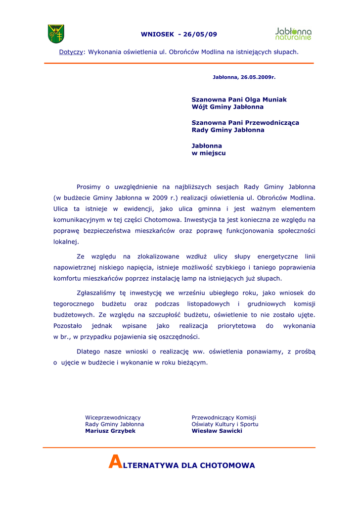 WNIOSEK - 26/05/09 Dotyczy: Wykonania oświetlenia ul. Obrońców Modlina na istniejących słupach. Jabłonna, 26.05.2009r. Szanowna Pani Olga Muniak Wójt Gminy Jabłonna Szanowna Pani Przewodnicząca Rady Gminy Jabłonna Jabłonna w miejscu Prosimy o uwzględnienie na najbliższych sesjach Rady Gminy Jabłonna (w budżecie Gminy Jabłonna w 2009 r.) realizacji oświetlenia ul. Obrońców Modlina. Ulica ta istnieje w ewidencji, jako ulica gminna i jest ważnym elementem komunikacyjnym w tej części Chotomowa. Inwestycja ta jest konieczna ze względu na poprawę bezpieczeństwa mieszkańców oraz poprawę funkcjonowania społeczności lokalnej. Ze względu na zlokalizowane wzdłuż ulicy słupy energetyczne linii napowietrznej niskiego napięcia, istnieje możliwość szybkiego i taniego poprawienia komfortu mieszkańców poprzez instalację lamp na istniejących już słupach. Zgłaszaliśmy tę inwestycję we wrześniu ubiegłego roku, jako wniosek do tegorocznego budżetu oraz podczas listopadowych i grudniowych komisji budżetowych. Ze względu na szczupłość budżetu, oświetlenie to nie zostało ujęte. Pozostało jednak wpisane jako realizacja priorytetowa do wykonania w br., w przypadku pojawienia się oszczędności. Dlatego nasze wnioski o realizację ww. oświetlenia ponawiamy, z prośbą o ujęcie w budżecie i wykonanie w roku bieżącym. Wiceprzewodniczący Rady Gminy Jabłonna Mariusz Grzybek A Przewodniczący Komisji Oświaty Kultury i Sportu Wiesław Sawicki LTERNATYWA DLA CHOTOMOWA