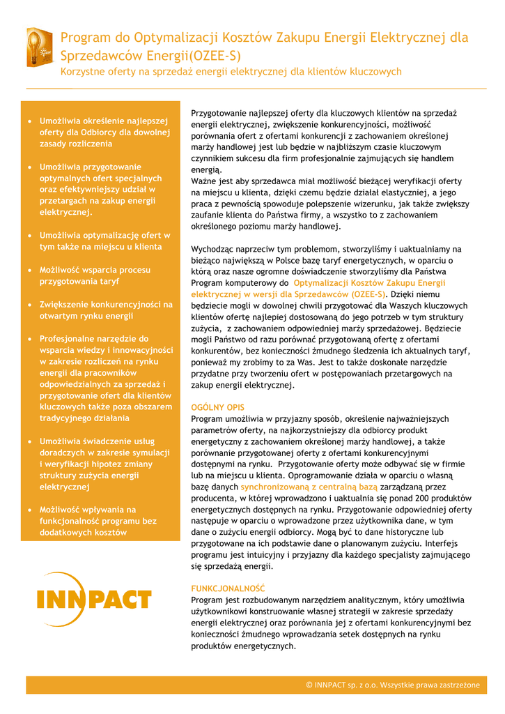 Program do Optymalizacji Kosztów Zakupu Energii Elektrycznej dla Sprzedawców Energii(OZEE-S) Korzystne oferty na sprzedaż energii elektrycznej dla klientów kluczowych Umożliwia określenie najlepszej oferty dla Odbiorcy dla dowolnej zasady rozliczenia Umożliwia przygotowanie optymalnych ofert specjalnych oraz efektywniejszy udział w przetargach na zakup energii elektrycznej. Umożliwia optymalizację ofert w tym także na miejscu u klienta Możliwość wsparcia procesu przygotowania taryf Zwiększenie konkurencyjności na otwartym rynku energii Profesjonalne narzędzie do wsparcia wiedzy i innowacyjności w zakresie rozliczeń na rynku energii dla pracowników odpowiedzialnych za sprzedaż i przygotowanie ofert dla klientów kluczowych także poza obszarem tradycyjnego działania Umożliwia świadczenie usług doradczych w zakresie symulacji i weryfikacji hipotez zmiany struktury zużycia energii elektrycznej Możliwość wpływania na funkcjonalność programu bez dodatkowych kosztów Przygotowanie najlepszej oferty dla kluczowych klientów na sprzedaż energii elektrycznej, zwiększenie konkurencyjności, możliwość porównania ofert z ofertami konkurencji z zachowaniem określonej marży handlowej jest lub będzie w najbliższym czasie kluczowym czynnikiem sukcesu dla firm profesjonalnie zajmujących się handlem energią. Ważne jest aby sprzedawca miał możliwość bieżącej weryfikacji oferty na miejscu u klienta, dzięki czemu będzie działał elastyczniej, a jego praca z pewnością spowoduje polepszenie wizerunku, jak także zwiększy zaufanie klienta do Państwa firmy, a wszystko to z zachowaniem określonego poziomu marży handlowej. Wychodząc naprzeciw tym problemom, stworzyliśmy i uaktualniamy na bieżąco największą w Polsce bazę taryf energetycznych, w oparciu o którą oraz nasze ogromne doświadczenie stworzyliśmy dla Państwa Program komputerowy do Optymalizacji Kosztów Zakupu Energii elektrycznej w wersji dla Sprzedawców (OZEE-S). Dzięki niemu będziecie mogli w dowolnej chwili przygotować dla Waszych kluczowych klientów ofertę najlepiej dostosowaną do jego potrzeb w tym struktury zużycia, z zachowaniem odpowiedniej marży sprzedażowej. Będziecie mogli Państwo od razu porównać przygotowaną ofertę z ofertami konkurentów, bez konieczności żmudnego śledzenia ich aktualnych taryf, ponieważ my zrobimy to za Was. Jest to także doskonałe narzędzie przydatne przy tworzeniu ofert w postępowaniach przetargowych na zakup energii elektrycznej. OGÓLNY OPIS Program umożliwia w przyjazny sposób, określenie najważniejszych parametrów oferty, na najkorzystniejszy dla odbiorcy produkt energetyczny z zachowaniem określonej marży handlowej, a także porównanie przygotowanej oferty z ofertami konkurencyjnymi dostępnymi na rynku. Przygotowanie oferty może odbywać się w firmie lub na miejscu u klienta. Oprogramowanie działa w oparciu o własną bazę danych synchronizowaną z centralną bazą zarządzaną przez producenta, w której wprowadzono i uaktualnia się ponad 200 produktów energetycznych dostępnych na rynku. Przygotowanie odpowiedniej oferty następuje w oparciu o wprowadzone przez użytkownika dane, w tym dane o zużyciu energii odbiorcy. Mogą być to dane historyczne lub przygotowane na ich podstawie dane o planowanym zużyciu. Interfejs programu jest intuicyjny i przyjazny dla każdego specjalisty zajmującego się sprzedażą energii. FUNKCJONALNOŚĆ Program jest rozbudowanym narzędziem analitycznym, który umożliwia użytkownikowi konstruowanie własnej strategii w zakresie sprzedaży energii elektrycznej oraz porównania jej z ofertami konkurencyjnymi bez konieczności żmudnego wprowadzania setek dostępnych na rynku produktów energetycznych. © INNPACT sp. z o.o. Wszystkie prawa zastrzeżone Program do Optymalizacji Kosztów Zakupu Energii Elektrycznej dla Sprzedawców Energii(OZEE-S) Korzystne oferty na sprzedaż energii elektrycznej dla klientów kluczowych Wymagania Dzięki temu użytkownik może całkowicie skoncentrować się na przygotowaniu oferty, która będzie optymalna zarówno dla klienta jak i dla sprzedawcy. Dostęp do Internetu, Windows XP/Vista Technologia Program został opracowany w technologii MS .NET TM w oparciu o relacyjną bazę MS SQL Server TM (Express) Inne produkty Dla sprzedawców oferujemy także darmowe narzędzie do samodzielnego wprowadzania aktualnej oferty taryfowej do centralnej bazy danych, dzięki czemu do aktualnej Państwa oferty będą miały miliony użytkowników Internetu oraz użytkowników serwisu energiataniej.pl Program udostępnia następujące funkcjonalność. Możliwość wprowadzenia planowanego kosztu godzinowego energii lub importu z pliku, z określeniem marży handlowej zmiennej w czasie Możliwość definicji taryf specjalnych wraz z definicją dedykowanego rozkładu stref czasowych Możliwość definicji cen godzinowych dla grafiku wraz z importem aktualnych cen z rynku bilansowego z Internetu Możliwość tworzenia godzinowych profili statystycznych na bazie danych okresowych. Możliwość zmiany struktury zużycia energii i analizy scenariuszowej Możliwość weryfikacji opłacalności oferowanych taryf specjalnych Możliwość weryfikacji opłacalności umów grafikowych i porównania z taryfami specjalnymi oraz standardowymi Możliwość korzystania z centralnej i uaktualnianej bazy danych taryf standardowych (ok 200 grup taryfowych w 14-tu taryfach) ZAKRES OFERTY INNPACT –Sp. z o.o. Ul. Legnicka 52 54-204 Wrocław tel. +48 71 358 26 32 fax. +48 71 750 34 17 email: [email protected] , www.innpact.pl REGON 020859630 NIP 894-296-03-94 Sąd rejonowy Wrocław Fabryczna KRS 0000319762 W ramach oferty użytkownik otrzymuje program wraz z licencją (czasowo nieograniczoną, niewyłączną, na użytkownika nazwanego) na jego użytkowanie, dokumentację w wersji elektronicznej oraz roczną opiekę serwisową, z dostępem do uaktualnianej bazy danych o produkt