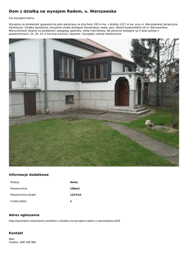 Dom z działką na wynajem Radom, u. Warszawska [na wynajem] domy Wynajmę na działalność gospodarczą dom parterowy ze strychem 100 m kw. z działką 1227 m kw. przy ul. Warszawskiej (atrakcyjna lokalizacja). Działka ogrodzona, wszystkie media dostępne (kanalizacja, woda, gaz). Wjazd bezpośrednio od ul. Warszawskiej. Nieruchomość idealna na działalność usługową, gabinety, sklep internetowy. Na parterze dostępne są 3 duże pokoje o powierzchniach: 25, 20, 25 m kw oraz kuchnia i łazienka. Szczegóły udzielę telefonicznie. Informacje dodatkowe Rodzaj domy Powierzchnia 100m2 Powierzchnia działki 1227m2 Liczba pięter 1 Adres ogłoszenia http://sprzedam-mieszkanie.com/dom-z-dzialka-na-wynajem-radom-u-warszawska,o245 Kontakt Mail: Telefon: 608 189 984 Lokalizacja ul.Warszawska, Radom Mazowieckie (pl) Ogłoszenie dodano: 2016-09-16 10:51:54 Ogłoszenie wygasa: 2016-12-17 10:51:54 Powered by TCPDF (www.tcpdf.org)