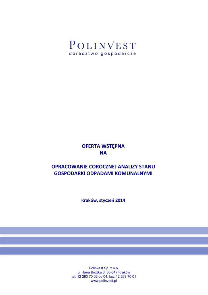 OFERTA WSTĘPNA NA OPRACOWANIE COROCZNEJ ANALIZY STANU GOSPODARKI ODPADAMI KOMUNALNYMI Kraków, styczeń 2014 Polinvest Sp. z o.o. ul. Jana Brożka 3, 30-347 Kraków tel. 12 263 70 02 do 04, fax: 12 263 70 01 www.polinvest.pl styczeń 2014 SPIS TREŚCI 1. POLINVEST SP. Z O.O. 3 1.1 1.2 1.3 Zespół Grupa Doradcza POLINVEST Świadczone usługi 3 3 4 2. WSTĘPNY ZAKRES OFEROWANYCH PRAC 6 3. DOŚWIADCZENIA W OBSZARZE GOSPODARKI ODPADAMI 7 Oferta wstępna na opracowanie corocznej analizy stanu gospodarki odpadami komunalnymi 2 styczeń 2014 1. POLINVEST SP. Z O.O. POLINVEST Sp. z o.o. jest jedną z najbardziej doświadczonych firm doradczych działających na polskim rynku, funkcjonującą od 1989 r. POLINVEST świadczy kompleksowe usługi doradcze w zakresie zarządzania dla podmiotów polskich i zagranicznych. Dla naszych Klientów pozyskaliśmy prawie 3,3 mld zł dotacji z funduszy europejskich, uzyskując w tym zakresie 1. miejsce wśród firm doradczych w Polsce (Ranking Funduszy Europejskich). Doradzaliśmy w przygotowaniu kluczowych projektów inwestycyjnych polskiej energetyki. POLINVEST wykonał dotychczas około 2 000 projektów doradczych dla ponad 900 Klientów. 1.1 Zespół Prezes Zarządu: dr Wiesław Samitowski Specjalista z zakresu zarządzania i rachunkowości z praktyką zawodową od 1977 r. Od maja 2010 r. – Prezes Stowarzyszenia Doradców Gospodarczych (SDG). Zespół POLINVESTU Zespół POLINVESTU stanowią specjaliści z zakresu finansów, pozyskiwania funduszy europejskich, marketingu, zarządzania, doradztwa personalnego, prawa oraz rachunkowości. POLINVEST wraz z powiązanymi podmiotami tworzy Grupę Doradczą POLINVEST, która na stałe zatrudnia 30 konsultantów. Ponadto POLINVEST współpracuje z liczną grupą ekspertów branżowych. 1.2 Grupa Doradcza POLINVEST Oferta wstępna na opracowanie corocznej analizy stanu gospodarki odpadami komunalnymi 3 styczeń 2014 Poza POLINVEST Sp. z o.o., Grupę Doradczą POLINVEST tworzą następujące podmioty: 1.3 POLINVEST - AUDIT Sp. z o.o. (Firma audytorsko-księgowa) Grzegorz Samitowski Kancelaria Prawna Świadczone usługi POLINVEST samodzielnie oraz w kooperacji z podmiotami z Grupy Doradczej świadczy kompleksowe usługi doradcze w następującym zakresie: Doradztwo w pozyskiwaniu środków z funduszy europejskich oraz z innych źródeł finansowania inwestycji strategie pozyskania finansowania studia wykonalności dokumenty aplikacyjne/wnioski raporty o oddziaływaniu na środowisko materiały przetargowe pomoc dla Jednostki Realizującej Projekt w zarządzaniu realizacją dofinansowywanego projektu, archiwizowanie dokumentów projektu ewaluacja rezultatów dofinansowywanych projektów Doradztwo w projektowaniu i wdrażaniu systemów zarządzania projektowanie Zintegrowanego Systemu Zarządzania struktury organizacyjne zmiany systemów ewidencji procedury planowania i kontroli systemy motywacyjne zrównoważone karty wyników zintegrowane systemy informatyczne controlling wdrażanie procedur archiwizacji Doradztwo w opracowywaniu i wdrażaniu strategii analizy strategiczne programy rozwoju i restrukturyzacji przedsiębiorstw doradztwo w procesach skutecznego wdrażania strategii Oferta wstępna na opracowanie corocznej analizy stanu gospodarki odpadami komunalnymi 4 styczeń 2014 Doradztwo w uzyskiwaniu decyzji administracyjnych w procesie inwestycyjnym wnioski taryfowe i projekty taryf dla ciepła, energii elektrycznej i paliw gazowych pomoc w postępowaniu przed Urzędem Regulacji Energetyki koncesje i pozwolenia w zakresie prowadzonej działalności gospodarczej Doradztwo w procesie nabywania oraz sprzedaży spółek analizy due diligence biznes plany wyceny udziałów i akcji spółek opracowywanie warunków transakcji udział w negocjacjach i kompleksowa obsługa procesu transakcji doradztwo w łączeniu lub dzieleniu podmiotów Obsługa prawna prowadzonych działań Kompleksowe szkolenia służące wdrażaniu zmian Oferta wstępna na opracowanie corocznej analizy stanu gospodarki odpadami komunalnymi 5 styczeń 2014 2. WSTĘPNY ZAKRES OFEROWANYCH PRAC W związku z koniecznością spełnienia wymogów ustawy z dnia 13 września 1996 r. o utrzymaniu czystości i porządku w gminach, POLINVEST sp. z o.o. oferuje wykonanie dla Gminy raportu z corocznej analizy stanu gospodarki odpadami komunalnymi. Wstępna struktura oferowanego raportu obejmuje następujące elementy: 1) Określenie charakterystyki systemu gospodarowania odpadami komunalnymi na terenie Gminy, w tym: a) analiza możliwości przetwarzania zmieszanych odpadów komunalnych, odpadów zielonych oraz pozostałości z sortowania odpadów komunalnych przeznaczonych do składowania, b) określenie potrzeb inwestycyjnych związanych z gospodarowaniem odpadami komunalnymi, c) analiza stopnia wywiązania się z wymogów prawnych w zakresie poziomów zagospodarowania odpadów komunalnych. 2) Analiza przepływów finansowych w ramach systemu gospodarowania odpadami komunalnymi. 3) Analiza obsługi administracyjnej systemu gospodarowania odpadami komunalnymi. 4) Wnioski i rekomendacje dotyczące systemu gospodarowania odpadami komunalnymi. W ramach powyższego raportu, POLINVEST przeanalizuje wszelkie uwarunkowania istotne z punktu widzenia sprawności funkcjonowania systemu gospodarowania odpadami komunalnymi. Wykorzystane zostaną szerokie doświadczenia POLINESTU wynikające z realizacji prac doradczych polegających na wdrażaniu zapisów ustawy z dnia 13 września 1996 r. o utrzymaniu czystości i porządku w gminach (wymienione w p. 3 niniejszej oferty). Prace wymienione w p. 2 oferty zostaną wykonane w terminie 2 miesięcy od daty zawarcia stosownej umowy. POLINVEST proponuje wykonanie prac objętych niniejszą wstępną ofertą za kwotę poniżej 14 tys. EURO, a oferta cenowa zostanie Państwu przedstawiona w przypadku uzgodnienia szczegółowego zakresu prac. Oferta wstępna na opracowanie corocznej analizy stanu gospodarki odpadami komunalnymi 6 styc