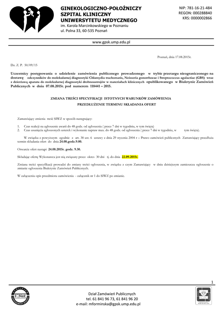 NIP: 781-16-21-484 REGON: 000288840 KRS: 0000002866 GINEKOLOGICZNO-POŁOŻNICZY SZPITAL KLINICZNY UNIWERSYTETU MEDYCZNEGO im. Karola Marcinkowskiego w Poznaniu ul. Polna 33, 60-535 Poznań www.gpsk.ump.edu.pl Poznań, dnia 17.08.2015r. Dz. Z. P. 50/09/15 Uczestnicy postępowania o udzielenie zamówienia publicznego prowadzonego w trybie przetargu nieograniczonego na dostawę odczynników do molekularnej diagnostyki Chlamydia trachomatis, Neisseria gonorrhoeae i Streptococcus agalactiae (GBS) wraz z dzierżawą aparatu do molekularnej diagnostyki drobnoustrojów w materiałach klinicznych opublikowanego w Biuletynie Zamówień Publicznych w dniu 07.08.2015r. pod numerem 118441 – 2015. ZMIANA TREŚCI SPECYFIKACJI ISTOTNYCH WARUNKÓW ZAMÓWIENIA PRZEDŁUŻENIE TERMINU SKŁADANIA OFERT Zamawiający zmienia treść SIWZ w sposób następujący: 1. 2. Czas reakcji na zgłoszenie awarii do 48 godz. od zgłoszenia ( przez 7 dni w tygodniu, w tym święta) Czas usunięcia zgłoszonych usterek i wykonanie napraw max. do 48 godz. od zgłoszenia ( przez 7 dni w tygodniu, w tym święta). W związku z powyższym zgodnie z art. 38 ust. 6 ustawy z dnia 29 stycznia 2004 r – Prawo zamówień publicznych Zamawiający przedłuża termin składania ofert do dnia 24.08.godz.9.00. Otwarcie ofert nastąpi 24.08.2015r. godz. 9.30. Składając ofertę Wykonawca jest nią związany przez okres 30 dni tj. do dnia 22.09.2015r. Zmiana treści specyfikacji prowadzi do zmiany treści ogłoszenia, w związku z czym Zamawiający w dniu dzisiejszym zamieszcza ogłoszenie o zmianie ogłoszenia Biuletynie Zamówień Publicznych. W załączeniu opis przedmiotu zamówienia - załącznik nr 1 do SIWZ po zmianie. 1 Dział Zamówień Publicznych tel. 61 841 96 73, 61 841 96 20 e-mail: [email protected] GINEKOLOGICZNO-POŁOŻNICZY SZPITAL KLINICZNY UNIWERSYTETU MEDYCZNEGO NIP: 781-16-21-484 REGON: 000288840 KRS: 0000002866 im. Karola Marcinkowskiego w Poznaniu ul. Polna 33, 60-535 Poznań www.gpsk.ump.edu.pl Załącznik Nr 1 do SIWZ ________________________ (oznaczenie Wykonawcy) Opis przedmiotu zamówienia wraz z wymaganiami technicznymi i zestawieniem parametrów Dotyczy przetargu nieograniczonego na dostawę odczynników do molekularnej diagnostyki Chlamydia trachomatis, Neisseria gonorrhoeae i Streptococcus agalactiae (GBS) wraz z dzierżawą aparatu do molekularnej diagnostyki drobnoustrojów w materiałach klinicznych 1.Aparat do molekularnej diagnostyki drobnoustrojów w materiałach klinicznych L. p. Wymagania do przedmiotu zamówienia Parametry wymagane 1. Producent Podać 2. Nazwa i typ Podać 3. Aparat nie starszy niż 2010 rok, posiadający deklarację zgodności CE dla oferowanego systemu. Tak 4. Aparat Real Time PCR w pełni zautomatyzowany z możliwością wykonania pojedynczej próbki Tak 5. System zapewniający zintegrowaną izolację DNA, amplifikację i detekcję w jednym procesie bez konieczności przenoszenia próbki Tak 6. System dający możliwość bezpośredniego badania próbki klinicznej bez wstępnej ekstrakcji DNA Tak 7. System dający możliwość monitorowania przebiegu reakcji Tak 8. System nie wymagający posiadania i spełniania kryteriów dla Pracowni Biologii Molekularnej Tak 9. Zintegrowany system gwarantujący minimalizację ryzyka zakażenia pracowników laboratorium Tak 10. Kompletny system zawierający aparat, komputer z oprogramowaniem, czytnik kodów kreskowych Tak 11. Zapewnienie merytorycznej konsultacji telefonicznej w przypadku trudności technicznych Tak 12. Aparat jest przystosowany do pracy w sieci komputerowej. Tak 13. Podłączenie analizatora do sieci komputerowej Eskulap. Tak 14. Możliwość dwukierunkowej komunikacji z systemem informatycznym Eskulap w czasie rzeczywistym i wprowadzenia Tak Parametry oferowane (podać / potwierdzić / opisać) 2 Dział Zamówień Publicznych tel. 61 841 96 73, 61 841 96 20 e-mail: [email protected] GINEKOLOGICZNO-POŁOŻNICZY SZPITAL KLINICZNY UNIWERSYTETU MEDYCZNEGO NIP: 781-16-21-484 REGON: 000288840 KRS: 0000002866 im. Karola Marcinkowskiego w Poznaniu ul. Polna 33, 60-535 Poznań www.gpsk.ump.edu.pl danych demograficznych pacjenta. 15. Analizator powinien posiadać system UPS na co najmniej 30 min, co umożliwi zakończenie bieżącej aplikacji w przypadku braku zasilania. Tak 16. Po uruchomieniu urządzenia, a przed podpisaniem protokołu odbioru, szkolenie poinstalacyjne dla personelu Dzierżawcy w zakresie prawidłowej obsługi urządzenia oraz procedury badawczej Tak 17. Genetyczne testy diagnostyczne do jednoczasowego wykrywania Chlamydia trachomatis i Neisseria gonorrhoeae lub tylko Chlamydia trachomatis z moczu, wymazów z pochwy i szyjki macicy, testy kompatybilne z aparatem; czas trwania badania poniżej 2 godzin Tak 18. Zestaw do pobierania oraz transportu wymazów z cewki, pochwy i szyjki macicy w kierunku Ch. trachomatis/N. gonorrhoeae Tak 19. Genetyczne testy diagnostyczne wykrywające DNA GBS z wymazów z pochwy i odbytu, testy kompatybilne z aparatem; czas trwania badania do 50 min. Tak 20. Zestaw do pobierania oraz transportu wymazów z pochwy i odbytu w kierunku GBS Tak 21. Instrukcja obsługi w języku polskim (wraz z dostawą) Tak WARUNKI SERWISU 22. Zapewnienie bezpłatnego autoryzowanego serwisu producenta oferowanego analizatora w oparciu o oryginalne materiały i części zamienne przez okres obowiązywania umowy w tym przeglądy techniczne wg zaleceń producenta na koszt Wydzierżawiającego Tak Tak 23. Sprawowanie obsługi serwisowej zlokalizowanej na terenie RP 24. Czas reakcji na zgłoszenie awarii do 48 godz. od zgłoszenia ( przez 7 dni w tygodniu, w tym święta) (podać dane teleadresowe: adres, telefon, faks) Tak Czas usunięcia zgłoszonych usterek i wykonanie napraw 25. max. do 48 godz. od zgłoszenia ( przez 7 dni w tygodniu, w tym święta) Tak 3 Dział Zamówień Publicznych tel. 61 841 96 73, 61 841 96 20 e-mail: [email protected] NIP: 781-16-21-484 REGON: 000288840 KRS: 0000002866 GINEKOLOGICZN