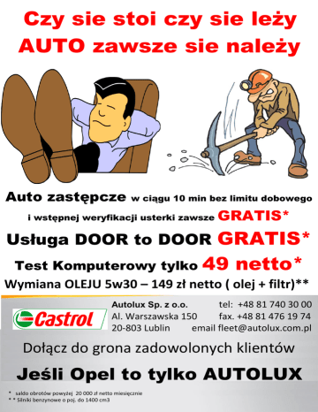 Czy sie stoi czy sie leży AUTO zawsze sie należy Auto zastępcze w ciągu 10 min bez limitu dobowego i wstępnej weryfikacji usterki zawsze GRATIS* Usługa DOOR to DOOR GRATIS* Test Komputerowy tylko 49 netto* Wymiana OLEJU 5w30 – 149 zł netto ( olej + filtr)** tel: +48 81 740 30 00 Al. Warszawska 150 fax. +48 81 476 19 74 20-803 Lublin email [email protected] Autolux Sp. z o.o. Dołącz do grona zadowolonych klientów Jeśli Opel to tylko AUTOLUX * saldo obrotów powyżej 20 000 zł netto miesięcznie * * Silniki benzynowe o poj. do 1400 cm3