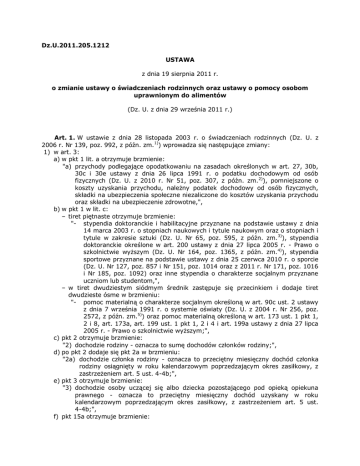 Dz.U.2011.205.1212 USTAWA z dnia 19 sierpnia 2011 r. o zmianie ustawy o świadczeniach rodzinnych oraz ustawy o pomocy osobom uprawnionym do alimentów (Dz. U. z dnia 29 września 2011 r.) Art. 1. W ustawie z dnia 28 listopada 2003 r. o świadczeniach rodzinnych (Dz. U. z 2006 r. Nr 139, poz. 992, z późn. zm.1)) wprowadza się następujące zmiany: 1) w art. 3: a) w pkt 1 lit. a otrzymuje brzmienie: "a) przychody podlegające opodatkowaniu na zasadach określonych w art. 27, 30b, 30c i 30e ustawy z dnia 26 lipca 1991 r. o podatku dochodowym od osób fizycznych (Dz. U. z 2010 r. Nr 51, poz. 307, z późn. zm.2)), pomniejszone o koszty uzyskania przychodu, należny podatek dochodowy od osób fizycznych, składki na ubezpieczenia społeczne niezaliczone do kosztów uzyskania przychodu oraz składki na ubezpieczenie zdrowotne,", b) w pkt 1 w lit. c: – tiret piętnaste otrzymuje brzmienie: "- stypendia doktoranckie i habilitacyjne przyznane na podstawie ustawy z dnia 14 marca 2003 r. o stopniach naukowych i tytule naukowym oraz o stopniach i tytule w zakresie sztuki (Dz. U. Nr 65, poz. 595, z późn. zm. 3)), stypendia doktoranckie określone w art. 200 ustawy z dnia 27 lipca 2005 r. - Prawo o szkolnictwie wyższym (Dz. U. Nr 164, poz. 1365, z późn. zm. 4)), stypendia sportowe przyznane na podstawie ustawy z dnia 25 czerwca 2010 r. o sporcie (Dz. U. Nr 127, poz. 857 i Nr 151, poz. 1014 oraz z 2011 r. Nr 171, poz. 1016 i Nr 185, poz. 1092) oraz inne stypendia o charakterze socjalnym przyznane uczniom lub studentom,", – w tiret dwudziestym siódmym średnik zastępuje się przecinkiem i dodaje tiret dwudzieste ósme w brzmieniu: "- pomoc materialną o charakterze socjalnym określoną w art. 90c ust. 2 ustawy z dnia 7 września 1991 r. o systemie oświaty (Dz. U. z 2004 r. Nr 256, poz. 2572, z późn. zm.5)) oraz pomoc materialną określoną w art. 173 ust. 1 pkt 1, 2 i 8, art. 173a, art. 199 ust. 1 pkt 1, 2 i 4 i art. 199a ustawy z dnia 27 lipca 2005 r. - Prawo o szkolnictwie wyższym;", c) pkt 2 otrzymuje brzmienie: "2) dochodzie rodziny - oznacza to sumę dochodów członków rodziny;", d) po pkt 2 dodaje się pkt 2a w brzmieniu: "2a) dochodzie członka rodziny - oznacza to przeciętny miesięczny dochód członka rodziny osiągnięty w roku kalendarzowym poprzedzającym okres zasiłkowy, z zastrzeżeniem art. 5 ust. 4-4b;", e) pkt 3 otrzymuje brzmienie: "3) dochodzie osoby uczącej się albo dziecka pozostającego pod opieką opiekuna prawnego - oznacza to przeciętny miesięczny dochód uzyskany w roku kalendarzowym poprzedzającym okres zasiłkowy, z zastrzeżeniem art. 5 ust. 4-4b;", f) pkt 15a otrzymuje brzmienie: 2) 3) 4) 5) "15a) przepisach o koordynacji systemów zabezpieczenia społecznego - oznacza to rozporządzenie Parlamentu Europejskiego i Rady (WE) nr 883/2004 z dnia 29 kwietnia 2004 r. w sprawie koordynacji systemów zabezpieczenia społecznego (Dz. Urz. UE L 166 z 30.04.2004, str. 1, z późn. zm.; Dz. Urz. UE Polskie wydanie specjalne, rozdz. 5, t. 5, str. 72) oraz rozporządzenie Parlamentu Europejskiego i Rady (WE) NR 987/2009 z dnia 16 września 2009 r. dotyczące wykonywania rozporządzenia (WE) nr 883/2004 w sprawie koordynacji systemów zabezpieczenia społecznego (Dz. Urz. UE L 284 z 30.10.2009, str. 1) ;", g) w pkt 21 w lit. d średnik zastępuje się przecinkiem i dodaje lit. e w brzmieniu: "e) niezdolność do samodzielnej egzystencji orzeczoną na podstawie przepisów o emeryturach i rentach z Funduszu Ubezpieczeń Społecznych lub przepisów o ubezpieczeniu społecznym rolników;", h) w pkt 23 dodaje się lit. h i lit. i w brzmieniu: "h) utratą zasiłku chorobowego, świadczenia rehabilitacyjnego lub zasiłku macierzyńskiego, przysługujących po utracie zatrudnienia lub innej pracy zarobkowej, i) utratą zasądzonych świadczeń alimentacyjnych w związku ze śmiercią osoby zobowiązanej do tych świadczeń;", i) w pkt 24 dodaje się lit. h w brzmieniu: "h) uzyskaniem zasiłku chorobowego, świadczenia rehabilitacyjnego lub zasiłku macierzyńskiego, przysługujących po utracie zatrudnienia lub innej pracy zarobkowej."; w art. 5: a) ust. 4 i 4a otrzymują brzmienie: "4. W przypadku utraty dochodu przez członka rodziny, osobę uczącą się lub dziecko pozostające pod opieką opiekuna prawnego w roku kalendarzowym poprzedzającym okres zasiłkowy lub po tym roku, ustalając ich dochód, nie uwzględnia się dochodu utraconego. 4a. W przypadku uzyskania dochodu przez członka rodziny, osobę uczącą się lub dziecko pozostające pod opieką opiekuna prawnego w roku kalendarzowym poprzedzającym okres zasiłkowy, ustalając dochód członka rodziny, osoby uczącej się lub dziecka pozostającego pod opieką opiekuna prawnego, uzyskany w tym roku dochód dzieli się przez liczbę miesięcy, w których dochód ten został osiągnięty, jeżeli dochód ten jest uzyskiwany w dniu ustalania prawa do świadczeń rodzinnych.", b) po ust. 4a dodaje się ust. 4b w brzmieniu: "4b. W przypadku uzyskania dochodu przez członka rodziny, osobę uczącą się lub dziecko pozostające pod opieką opiekuna prawnego po roku kalendarzowym poprzedzającym okres zasiłkowy dochód ich ustala się na podstawie dochodu członka rodziny, dochodu osoby uczącej się lub dochodu dziecka pozostającego pod opieką opiekuna prawnego, powiększonego o kwotę uzyskanego dochodu z miesiąca następującego po miesiącu, w którym dochód został osiągnięty, jeżeli dochód ten jest uzyskiwany w dniu ustalania prawa do świadczeń rodzinnych."; w art. 9 ust. 9 otrzymuje brzmienie: "9. Przepisu ust. 6 nie stosuje się do osób będących prawnymi lub faktycznymi opiekunami dziecka, a także do osób, które przysposobiły dziecko."; w art. 15b ust. 7 otrzymuje brzmienie: "7. Przepisu ust. 5 nie stosuje się do osób będących prawnymi lub faktycznymi opiekunami dziecka, a także do osób, które przysposobiły dziecko."; w art. 16 ust. 5a otrzymuje brzmienie: "5a. Osobom, o kt
