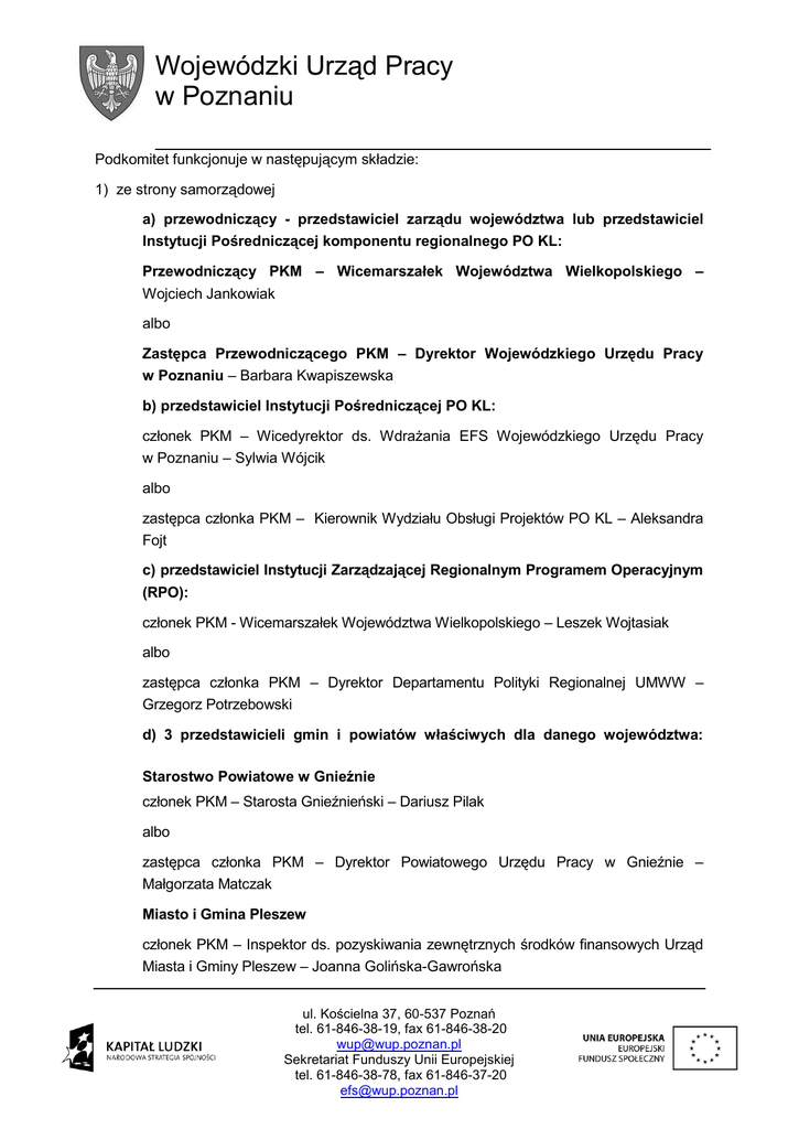 Wojewódzki Urząd Pracy w Poznaniu Podkomitet funkcjonuje w następującym składzie: 1) ze strony samorządowej a) przewodniczący - przedstawiciel zarządu województwa lub przedstawiciel Instytucji Pośredniczącej komponentu regionalnego PO KL: Przewodniczący PKM – Wicemarszałek Województwa Wielkopolskiego – Wojciech Jankowiak albo Zastępca Przewodniczącego PKM – Dyrektor Wojewódzkiego Urzędu Pracy w Poznaniu – Barbara Kwapiszewska b) przedstawiciel Instytucji Pośredniczącej PO KL: członek PKM – Wicedyrektor ds. Wdrażania EFS Wojewódzkiego Urzędu Pracy w Poznaniu – Sylwia Wójcik albo zastępca członka PKM – Kierownik Wydziału Obsługi Projektów PO KL – Aleksandra Fojt c) przedstawiciel Instytucji Zarządzającej Regionalnym Programem Operacyjnym (RPO): członek PKM - Wicemarszałek Województwa Wielkopolskiego – Leszek Wojtasiak albo zastępca członka PKM – Dyrektor Departamentu Polityki Regionalnej UMWW – Grzegorz Potrzebowski d) 3 przedstawicieli gmin i powiatów właściwych dla danego województwa: Starostwo Powiatowe w Gnieźnie członek PKM – Starosta Gnieźnieński – Dariusz Pilak albo zastępca członka PKM – Dyrektor Powiatowego Urzędu Pracy w Gnieźnie – Małgorzata Matczak Miasto i Gmina Pleszew członek PKM – Inspektor ds. pozyskiwania zewnętrznych środków finansowych Urząd Miasta i Gminy Pleszew – Joanna Golińska-Gawrońska ul. Kościelna 37, 60-537 Poznań tel. 61-846-38-19, fax 61-846-38-20 [email protected] Sekretariat Funduszy Unii Europejskiej tel. 61-846-38-78, fax 61-846-37-20 [email protected] albo zastępca członka PKM – Inspektor, Urząd Miasta i Gminy Pleszew - Andrzej Liskowski e) przedstawiciel Regionalnego Ośrodka Polityki Społecznej: członek PKM – Dyrektor Regionalnego Ośrodka Polityki Społecznej w Poznaniu – Aleksandra Kowalska albo zastępca członka PKM – Zastępca Dyrektora Regionalnego Ośrodka Polityki Społecznej w Poznaniu – Wojciech Zarzycki 2) ze strony rządowej a) przedstawiciel Instytucji Zarządzającej PO KL – Ministerstwo Rozwoju Regionalnego: członek PKM – Zastępca Dyrektora Departamentu Zarządzania Europejskim Funduszem Społecznym – Anna Mickiewicz albo zastępca członka PKM – Naczelnik Wydziału Systemu Wdrażania, Departament Zarządzania Europejskim Funduszem Społecznym – Małgorzata Mika b) przedstawiciel wojewody – Wielkopolski Urząd Wojewódzki: członek PKM – Zastępca Dyrektora Wydziału Polityki Społecznej Wielkopolskiego Urzędu Wojewódzkiego - Monika Donke – Cieślewicz albo zastępca członka PKM – Starszy specjalista w Oddziale Rynku Pracy Wydziału Polityki Społecznej Wielkopolskiego Urzędu Wojewódzkiego - Krystian Wieczorek c) przedstawiciel kuratora oświaty – Kuratorium Oświaty w Poznaniu: członek PKM – Starszy wizytator, Kuratorium Oświaty w Poznaniu – Krzysztof Skrętny albo zastępca członka PKM – Starszy wizytator, Kuratorium Oświaty w Poznaniu - Jan Stanek 3) ze strony partnerów społecznych i gospodarczych właściwych dla danego województwa a) 4 przedstawicieli organizacji pracowników i organizacji pracodawców reprezentujących ich interesy w regionie: Przedstawiciele Wojewódzkiej Komisji Dialogu Społecznego członkowie PKM – Prezes Zarządu ZETO S.A. - Marek Majewski, Wicedyrektor Centrum Zarządzania Projektami Wyższej Szkoły Bankowej w Poznaniu, członek Wielkopolskiego Związku Pracodawców, – Lucyna Sobkowiak, Przewodniczący Zarządu Regionu Wielkopolskiego NSZZ „Solidarność” - Jarosław Lange, ul. Kościelna 37, 60-537 Poznań tel. 61-846-38-19, fax 61-846-38-20 [email protected] Sekretariat Funduszy Unii Europejskiej tel. 61-846-38-78, fax 61-846-37-20 [email protected] Przewodniczący Okręgu Wielkopolskiego i Lubuskiego Związku Zawodowego Inżynierów i Techników - Bronisław Urban albo zastępcy członków PKM – Dyrektor ds. finansowych STEEL-BULDING - Artur Buszkiewicz, Wiceprezes Wielkopolskiej Izby Rzemieślniczej - Stanisław Marczak, Przewodnicząca Związku Zawodowego „Budowlani” STEICO S.A. - Maria Stawniak, Przewodniczący Związku Zawodowego Pracowników Spółdzielni Mleczarskiej w Gostyniu - Ryszard Guderski b) 3 przedstawicieli organizacji pozarządowych z terenu danego województwa: Unia Gospodarcza Regionu Śremskiego – Śremski Ośrodek Wspierania Małej Przedsiębiorczości członek PKM – Przewodniczący Zarządu - Adam Lewandowski albo zastępca członka PKM – Dyrektor Biura - Monika Bulińska Stowarzyszenie Instytut Zachodni członek PKM – Wiceprzewodnicząca Stowarzyszenia - Joanna Kalińska albo zastępca członka PKM – Zastępca Dyrektora Regionalnego Centrum Informacji Europejskiej - Katarzyna Trzeciak Wielkopolska Izba Rzemieślnicza w Poznaniu członek PKM – Naczelnik Wydziału Promocji Gospodarczej - Bogumiła Frąckowiak albo zastępca członka PKM – Dyrektor Wielkopolskiej Izby Rzemieślniczej -Tomasz Wika c) 1 przedstawiciel środowiska akademicko-naukowego z terenu danego województwa: Gnieźnieńska Szkoła Wyższa Milenium członek PKM – Główny specjalista ds. pozyskiwania funduszy unijnych - Anna Żabińska – Pioterek albo zastępca członka PKM – Dziekan Wydziału Kulturoznawstwa - dr Klaudiusz Święcicki d) 1 przedstawiciel województwa: Regionalnych Ośrodków członek PKM – Kierownik Regionalnego Społecznego w Koninie – Paweł Jasiński Ośrodka albo ul. Kościelna 37, 60-537 Poznań tel. 61-846-38-19, fax 61-846-38-20 [email protected] Sekretariat Funduszy Unii Europejskiej tel. 61-846-38-78, fax 61-846-37-20 [email protected] EFS z terenu Europejskiego danego Funduszu zastępca członka PKM – Kierownik Regionalnego Ośrodka Europejskiego Funduszu Społecznego w Poznaniu – Monika Gilewska 4) obserwatorzy (bez prawa do głosowania): a) przedstawiciel Komisji Europejskiej b) przedstawiciel ministra właściwego ds. edukacji c) przedstawiciel ministra właściwego ds. pracy d) inne osoby na zaprosz