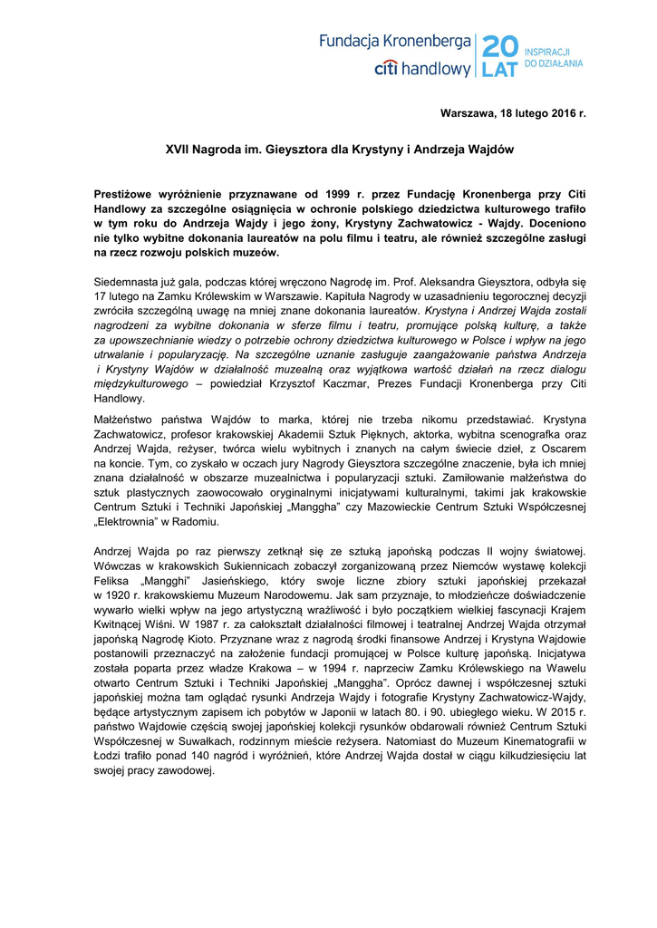 Warszawa, 18 lutego 2016 r. XVII Nagroda im. Gieysztora dla Krystyny i Andrzeja Wajdów Prestiżowe wyróżnienie przyznawane od 1999 r. przez Fundację Kronenberga przy Citi Handlowy za szczególne osiągnięcia w ochronie polskiego dziedzictwa kulturowego trafiło w tym roku do Andrzeja Wajdy i jego żony, Krystyny Zachwatowicz - Wajdy. Doceniono nie tylko wybitne dokonania laureatów na polu filmu i teatru, ale również szczególne zasługi na rzecz rozwoju polskich muzeów. Siedemnasta już gala, podczas której wręczono Nagrodę im. Prof. Aleksandra Gieysztora, odbyła się 17 lutego na Zamku Królewskim w Warszawie. Kapituła Nagrody w uzasadnieniu tegorocznej decyzji zwróciła szczególną uwagę na mniej znane dokonania laureatów. Krystyna i Andrzej Wajda zostali nagrodzeni za wybitne dokonania w sferze filmu i teatru, promujące polską kulturę, a także za upowszechnianie wiedzy o potrzebie ochrony dziedzictwa kulturowego w Polsce i wpływ na jego utrwalanie i popularyzację. Na szczególne uznanie zasługuje zaangażowanie państwa Andrzeja i Krystyny Wajdów w działalność muzealną oraz wyjątkowa wartość działań na rzecz dialogu międzykulturowego – powiedział Krzysztof Kaczmar, Prezes Fundacji Kronenberga przy Citi Handlowy. Małżeństwo państwa Wajdów to marka, której nie trzeba nikomu przedstawiać. Krystyna Zachwatowicz, profesor krakowskiej Akademii Sztuk Pięknych, aktorka, wybitna scenografka oraz Andrzej Wajda, reżyser, twórca wielu wybitnych i znanych na całym świecie dzieł, z Oscarem na koncie. Tym, co zyskało w oczach jury Nagrody Gieysztora szczególne znaczenie, była ich mniej znana działalność w obszarze muzealnictwa i popularyzacji sztuki. Zamiłowanie małżeństwa do sztuk plastycznych zaowocowało oryginalnymi inicjatywami kulturalnymi, takimi jak krakowskie Centrum Sztuki i Techniki Japońskiej „Manggha” czy Mazowieckie Centrum Sztuki Współczesnej „Elektrownia” w Radomiu. Andrzej Wajda po raz pierwszy zetknął się ze sztuką japońską podczas II wojny światowej. Wówczas w krakowskich Sukiennicach zobaczył zorganizowaną przez Niemców wystawę kolekcji Feliksa „Mangghi” Jasieńskiego, który swoje liczne zbiory sztuki japońskiej przekazał w 1920 r. krakowskiemu Muzeum Narodowemu. Jak sam przyznaje, to młodzieńcze doświadczenie wywarło wielki wpływ na jego artystyczną wrażliwość i było początkiem wielkiej fascynacji Krajem Kwitnącej Wiśni. W 1987 r. za całokształt działalności filmowej i teatralnej Andrzej Wajda otrzymał japońską Nagrodę Kioto. Przyznane wraz z nagrodą środki finansowe Andrzej i Krystyna Wajdowie postanowili przeznaczyć na założenie fundacji promującej w Polsce kulturę japońską. Inicjatywa została poparta przez władze Krakowa – w 1994 r. naprzeciw Zamku Królewskiego na Wawelu otwarto Centrum Sztuki i Techniki Japońskiej „Manggha”. Oprócz dawnej i współczesnej sztuki japońskiej można tam oglądać rysunki Andrzeja Wajdy i fotografie Krystyny Zachwatowicz-Wajdy, będące artystycznym zapisem ich pobytów w Japonii w latach 80. i 90. ubiegłego wieku. W 2015 r. państwo Wajdowie częścią swojej japońskiej kolekcji rysunków obdarowali również Centrum Sztuki Współczesnej w Suwałkach, rodzinnym mieście reżysera. Natomiast do Muzeum Kinematografii w Łodzi trafiło ponad 140 nagród i wyróżnień, które Andrzej Wajda dostał w ciągu kilkudziesięciu lat swojej pracy zawodowej. Artystyczne wykształcenie i malarska pasja reżysera zostawiły ślad w mieście jego dzieciństwa, Radomiu, gdzie znajduje się wyjątkowa kolekcja sztuki przekazana przez małżeństwo Wajdów. Od 1990 r. funkcjonowało tam Muzeum Sztuki Współczesnej, będące oddziałem Muzeum Okręgowego im. Jacka Malczewskiego. Wkrótce po inauguracji działalności muzeum zyskało ponad 2500 nowych dzieł, darów pochodzących najczęściej od artystów, które połączono z zasobami lokalnego BWA. Jedną z największych kolekcji (w skład której wchodziły m.in. dzieła Józefa Czapskiego, Ryszard Horowitza i Tadeusza Kantora) podarowali Muzeum Krystyna Zachwatowicz-Wajda i Andrzej Wajda. W 2004 r. Andrzej Wajda przedstawił ideę powołania nowej instytucji łączącej funkcje muzealne i edukacyjne, której warunki lokalowe pozwalałyby na zaprezentowanie wszystkich będących w posiadaniu muzeum dzieł. Na jego nową siedzibę wybrano zabytkowy budynek dawnej elektrowni miejskiej. Od czerwca 2014 r. działa tam Mazowieckie Centrum Sztuki Współczesnej „Elektrownia”. Kolekcja liczy blisko 5 tys. prac i jest jednym z najciekawszych zbiorów sztuki współczesnej w kraju. Krystyna Zachwatowicz-Wajda i Andrzej Wajda są również od wielu lat zaangażowani w projekt utworzenia w Krakowie Muzeum PRL. Krystyna Zachwatowicz-Wajda jest Przewodniczącą Rady Programowej Muzeum. Jego idea zrodziła się w 1999 r. wraz z powstaniem Fundacji SocLand, której celem było otwarcie placówki dokumentującej ten okres historii Polski. Muzeum rozpoczęło działalność w zlokalizowanym na terenie Nowej Huty budynku dawnego kina „Światowid”, jako oddział Muzeum Historii Polski. W 2013 r. Gmina Kraków i Ministerstwo Kultury podpisały umowę o współprowadzeniu Muzeum. Wystawa będzie miała charakter interaktywny i ma być gotowa w ciągu najbliższych lat. Kapituła Nagrody Gieysztora doceniła też fakt ufundowania w 2000 r. przez Krystynę ZachwatowiczWajdę i jej męża Nagrody im. Profesora Jana Zachwatowicza, przyznawanej studentom szkół architektonicznych, artystycznych i konserwatorskich za prace magisterskie podejmujące temat badań i konserwacji zabytków oraz ochrony polskiego dziedzictwa kulturowego. Informacje o Nagrodzie: Nagroda imienia profesora Aleksandra Gieysztora przyznawana jest przez Fundację Kronenberga przy Citi Handlowy od 1999 roku za wybitne osiągnięcia, mające na celu ochronę polskiego dziedzictwa kulturowego w takich dziedzinach jak: dzia