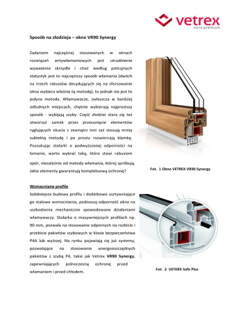 Sposób na złodzieja – okno VR90 Synergy Zadaniem najczęściej stosowanych rozwiązań antywłamaniowych jest w oknach utrudnienie wyważenia skrzydła i choć według policyjnych statystyk jest to najczęstszy sposób włamania (dwóch na trzech rabusiów decydujących się na sforsowanie okna wybiera właśnie tę metodę), to jednak nie jest to jedyna metoda. Włamywacze, zwłaszcza w bardziej odludnych miejscach, chętnie wybierają najprostszy sposób - wybijają szyby. Część złodziei stara się też otworzyć zamek przez przesunięcie elementów ryglujących okucia z zewnątrz inni zaś stosują mniej subtelną metodę i po prostu rozwiercają klamkę. Poszukując stolarki o podwyższonej odporności na łamanie, warto wybrać taką, która stawi rabusiom opór, niezależnie od metody włamania, której spróbują. Jakie elementy gwarantują kompleksową ochronę? Fot. 1 Okno VETREX VR90 Synergy Wzmacniane profile Solidniejsza budowa profilu i dodatkowo usztywniające go stalowe wzmocnienia, podnoszą odporność okna na uszkodzenia mechaniczne spowodowane działaniami włamywaczy. Stolarka o masywniejszych profilach np. 90 mm, pozwala na stosowanie odpornych na rozbicie i przebicie pakietów szybowych w klasie bezpieczeństwa P4A lub wyższej. Na rynku pojawiają się już systemy, pozwalające na stosowanie energooszczędnych pakietów z szybą P4, takie jak Vetrex VR90 Synergy, zapewniających jednoczesną włamaniem i przed chłodem. ochronę przed Fot. 2 VETERX Safe Plus Bezpieczna szyba Pakiet szybowy wyposażony w szybę bezpieczną w klasie P4A charakteryzuje się zwiększoną odpornością na rozbicie i przebicie tępymi oraz ostrymi narzędziami. Szyba w klasie P4A może zastępować kraty o oczku 150 mm wykonane z drutu stalowego średnicy 10mm. Szyba ta składa się z dwóch tafli szkła o grubości 4 mm, połączonych ze sobą czterema foliami PVB o grubości 0,38 mm każda. W przypadku jej uszkodzenia, podtrzymywane folią szkło nie rozpada się więc na niebezpieczne kawałki. Szyba bezpieczna jest najbardziej zewnętrzną taflą szkła wchodzącą w skład pakietu. Na rynku dostępne są już dwukomorowe, energooszczędne pakiety szybowe o współczynniku U=0,5 W/m²K wyposażone w szybę bezpieczną, jednak ze względu na dużą szerokość 58mm – mogą być stosowane wyłącznie w systemach o odpowiedniej szerokości profila, takich jak Vetrex VR90 Synergy. Specyficzna budowa sprawia, że pakiety z szybą bezpieczną uzyskują dodatkowy atut - doskonałe właściwości akustyczne, zapewniając wytłumienie hałasów z zewnątrz. Współczynnik izolacji akustycznej okna referencyjnego w systemie VR90 Synergy Rw(C;Ctr) = 41 (- 1; -5) dB, co oznacza, że okno tłumi dźwięki prawie jak murowana ściana. Okucia antywyważeniowe Okucia o zwiększonej odporności na włamanie wyposażane są w zaczepy antywyważeniowe montowane w każdym skrzydle. Im więcej tego rodzaju elementów w oknie – tym trudniej wyważyć skrzydło i tym większą odporność uzyskuje ono w klasie RC. Klasa ta określa jak długo okno wytrzyma starcie z uzbrojonym w konkretny zestaw narzędzi złodziejem. Im więcej czasu będzie trwało sforsowanie okna – tym wyższą klasę okno uzyska i tym większe prawdopodobieństwo, że rabuś zrezygnuje ze swoich planów. Fot. 3 Antywyważeniowe okucia Kontaktrony Kontaktrony Safe + umożliwiają integrację okna z systemem alarmowym i automatyczne uruchomienie go gdy ich czujniki odnotują rozwarcie skrzydła, a więc w przypadku wyważenia okna, rozwiercenia klamki, lub otwarcie jej przez przesunięcie elementów ryglujących okucia z zewnątrz. Kontakty magnetyczne zyskują coraz większe zainteresowanie, zwłaszcza wśród klientów planujących wykorzystanie w domu technologii inteligentnych i systemów automatycznych. Klamka odporna na włamanie inteligentne Włamywacze niekiedy stosują też bardzo finezyjny sposób włamania, otwierając okno poprzez odblokowanie mechanizmu klamki – jest to tzw. inteligentne włamanie. Aby uniemożliwić takie działanie, bardziej zaawansowane technicznie klamki, takie jak np. Secustik Swing, wyposażane są w mechanizm blokujący obrót klamki przy próbie otwarcia okna od zewnątrz. Co jeśli włamywacz postanowi uciec się do prostszej metody i zechce po prostu rozwiercić klamkę? zostanie w W przypadku, gdy okno uzbrojone stalowe blachy przeciwprzewierceniowe, zapobiegające zdewastowaniu klamki, a tym samym rozbrojeniu całego mechanizmu ryglującego okno – jego wysiłki także zostaną zniweczone. Fot. 4 VETREX Swing Secustic z kluczem srebrna Solidny montaż Zabezpieczenie przed włamaniem to także odpowiedni montaż. Osadzenie okna uwzględniające odpowiedni rodzaj elementów mocujących, dobranych indywidualnie w zależności od materiału ściany, chroni przed włamaniem poprzez wypchnięcie okna z ramą, bądź wyrwanie go ze ściany. Wybierając system kompleksowo chroniący przed włamaniem warto więc zainwestować w profesjonalny, bezpieczny montaż i nie pozostawić niechcianym gościom żadnych szans.