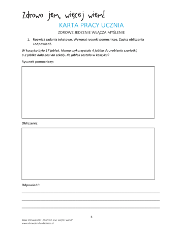 KARTA PRACY UCZNIA ZDROWE JEDZENIE WŁĄCZA MYŚLENIE 1. Rozwiąż zadania tekstowe. Wykonaj rysunki pomocnicze. Zapisz obliczenia i odpowiedź. W koszyku było 17 jabłek. Mama wykorzystała 4 jabłka do zrobienia szarlotki, a 2 jabłka dała Zosi do szkoły. Ile jabłek zostało w koszyku? Rysunek pomocniczy: Obliczenia: Odpowiedź: __________________________________________________________________________________ __________________________________________________________________________________ __________________________________________________________________________________ BANK SCENARIUSZY „ZDROWO JEM, WIĘCEJ WIEM” www.zdrowojem.fundacjabos.pl 3 Ania i jej tata przygotowali na kolację kanapki z chleba razowego. Do 3 kanapek dodali rzodkiewki, do 1 kanapki dodali pomidora, a 6 pozostałych kanapek było z dodatkiem ogórka. Ile kanapek przygotowali Ania i jej tata? Rysunek pomocniczy: Obliczenia: Odpowiedź: __________________________________________________________________________________ __________________________________________________________________________________ __________________________________________________________________________________ BANK SCENARIUSZY „ZDROWO JEM, WIĘCEJ WIEM” www.zdrowojem.fundacjabos.pl 4 2. Narysuj swoją propozycję całodniowego zdrowego jadłospisu dla Twojego kolegi/koleżanki. ŚNIADANIE DRUGIE ŚNIADANIE OBIAD PODWIECZOREK WIECZÓR BANK SCENARIUSZY „ZDROWO JEM, WIĘCEJ WIEM” www.zdrowojem.fundacjabos.pl 5