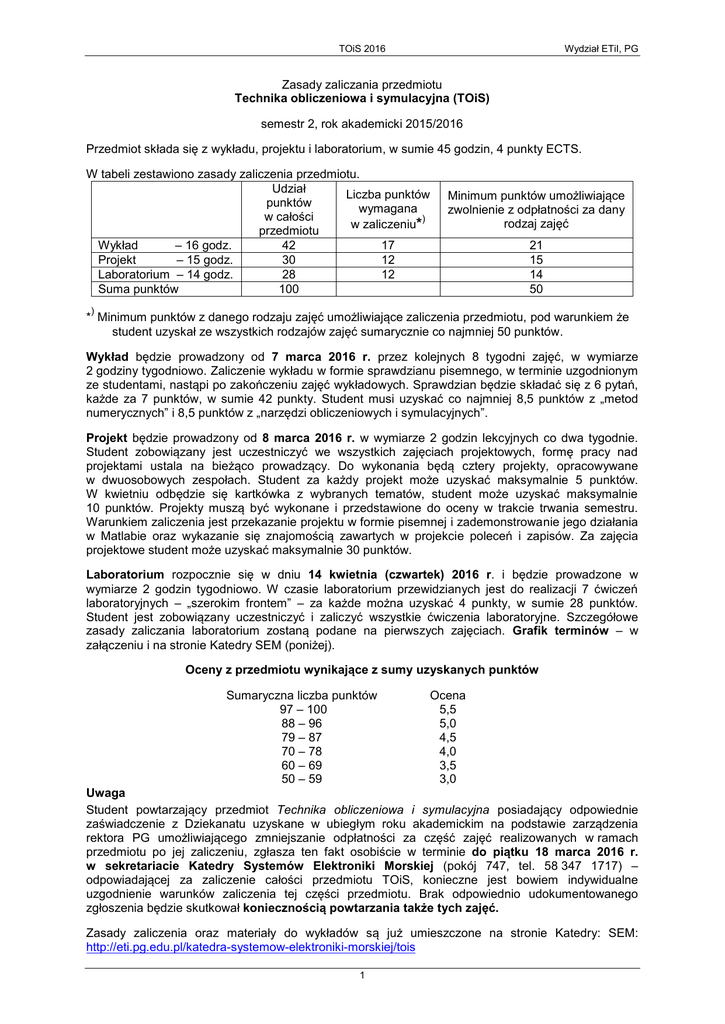 TOiS 2016 Wydział ETiI, PG Zasady zaliczania przedmiotu Technika obliczeniowa i symulacyjna (TOiS) semestr 2, rok akademicki 2015/2016 Przedmiot składa się z wykładu, projektu i laboratorium, w sumie 45 godzin, 4 punkty ECTS. W tabeli zestawiono zasady zaliczenia przedmiotu. Udział Liczba punktów punktów wymagana w całości ) w zaliczeniu* przedmiotu Wykład – 16 godz. 42 17 Projekt – 15 godz. 30 12 Laboratorium – 14 godz. 28 12 Suma punktów 100 Minimum punktów umożliwiające zwolnienie z odpłatności za dany rodzaj zajęć 21 15 14 50 ) * Minimum punktów z danego rodzaju zajęć umożliwiające zaliczenia przedmiotu, pod warunkiem że student uzyskał ze wszystkich rodzajów zajęć sumarycznie co najmniej 50 punktów. Wykład będzie prowadzony od 7 marca 2016 r. przez kolejnych 8 tygodni zajęć, w wymiarze 2 godziny tygodniowo. Zaliczenie wykładu w formie sprawdzianu pisemnego, w terminie uzgodnionym ze studentami, nastąpi po zakończeniu zajęć wykładowych. Sprawdzian będzie składać się z 6 pytań, każde za 7 punktów, w sumie 42 punkty. Student musi uzyskać co najmniej 8,5 punktów z „metod numerycznych” i 8,5 punktów z „narzędzi obliczeniowych i symulacyjnych”. Projekt będzie prowadzony od 8 marca 2016 r. w wymiarze 2 godzin lekcyjnych co dwa tygodnie. Student zobowiązany jest uczestniczyć we wszystkich zajęciach projektowych, formę pracy nad projektami ustala na bieżąco prowadzący. Do wykonania będą cztery projekty, opracowywane w dwuosobowych zespołach. Student za każdy projekt może uzyskać maksymalnie 5 punktów. W kwietniu odbędzie się kartkówka z wybranych tematów, student może uzyskać maksymalnie 10 punktów. Projekty muszą być wykonane i przedstawione do oceny w trakcie trwania semestru. Warunkiem zaliczenia jest przekazanie projektu w formie pisemnej i zademonstrowanie jego działania w Matlabie oraz wykazanie się znajomością zawartych w projekcie poleceń i zapisów. Za zajęcia projektowe student może uzyskać maksymalnie 30 punktów. Laboratorium rozpocznie się w dniu 14 kwietnia (czwartek) 2016 r. i będzie prowadzone w wymiarze 2 godzin tygodniowo. W czasie laboratorium przewidzianych jest do realizacji 7 ćwiczeń laboratoryjnych – „szerokim frontem” – za każde można uzyskać 4 punkty, w sumie 28 punktów. Student jest zobowiązany uczestniczyć i zaliczyć wszystkie ćwiczenia laboratoryjne. Szczegółowe zasady zaliczania laboratorium zostaną podane na pierwszych zajęciach. Grafik terminów – w załączeniu i na stronie Katedry SEM (poniżej). Oceny z przedmiotu wynikające z sumy uzyskanych punktów Sumaryczna liczba punktów 97 – 100 88 – 96 79 – 87 70 – 78 60 – 69 50 – 59 Ocena 5,5 5,0 4,5 4,0 3,5 3,0 Uwaga Student powtarzający przedmiot Technika obliczeniowa i symulacyjna posiadający odpowiednie zaświadczenie z Dziekanatu uzyskane w ubiegłym roku akademickim na podstawie zarządzenia rektora PG umożliwiającego zmniejszanie odpłatności za część zajęć realizowanych w ramach przedmiotu po jej zaliczeniu, zgłasza ten fakt osobiście w terminie do piątku 18 marca 2016 r. w sekretariacie Katedry Systemów Elektroniki Morskiej (pokój 747, tel. 58 347 1717) – odpowiadającej za zaliczenie całości przedmiotu TOiS, konieczne jest bowiem indywidualne uzgodnienie warunków zaliczenia tej części przedmiotu. Brak odpowiednio udokumentowanego zgłoszenia będzie skutkował koniecznością powtarzania także tych zajęć. Zasady zaliczenia oraz materiały do wykładów są już umieszczone na stronie Katedry: SEM: http://eti.pg.edu.pl/katedra-systemow-elektroniki-morskiej/tois 1 TOiS 2016 Wydział ETiI, PG Grafik terminów Laboratorium TOiS w roku 2016 Nr zajęć Pn. Wt. Śr. Czw. Pt. 1 25.04 26.04 20.04 14.04 15.04 2 9.05 10.05 27.04 21.04 22.04 3 16.05 17.05 4.05 28.04 29.04 4 23.05 24.05 11.05 5.05 6.05 Terminy pierwszych zajęć projektowych: Grupa Termin rozpoczęcia zajęć 1 11.03 2 18.03 3 09.03 4 16.03 5 14.03 6 21.03 7 11.03 8 08.03 godz. 8.15 9 18.03 2 5 30.05 31.05 18.05 12.05 13.05 6 6.06 7.06 25.04 19.05 20.05 7 13.06 14.06 1.06 2.06 27.05 8 15.06 16.06 8.06 9.06 3.06