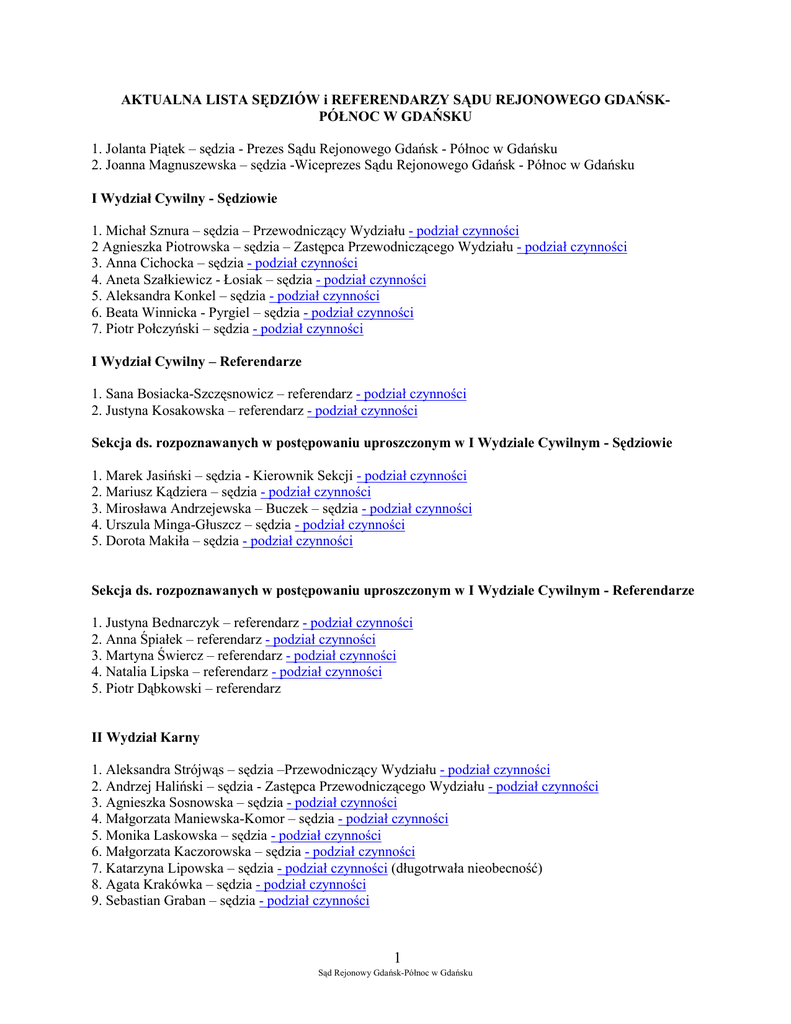 AKTUALNA LISTA SĘDZIÓW i REFERENDARZY SĄDU REJONOWEGO GDAŃSKPÓŁNOC W GDAŃSKU 1. Jolanta Piątek – sędzia - Prezes Sądu Rejonowego Gdańsk - Północ w Gdańsku 2. Joanna Magnuszewska – sędzia -Wiceprezes Sądu Rejonowego Gdańsk - Północ w Gdańsku I Wydział Cywilny - Sędziowie 1. Michał Sznura – sędzia – Przewodniczący Wydziału - podział czynności 2 Agnieszka Piotrowska – sędzia – Zastępca Przewodniczącego Wydziału - podział czynności 3. Anna Cichocka – sędzia - podział czynności 4. Aneta Szałkiewicz - Łosiak – sędzia - podział czynności 5. Aleksandra Konkel – sędzia - podział czynności 6. Beata Winnicka - Pyrgiel – sędzia - podział czynności 7. Piotr Połczyński – sędzia - podział czynności I Wydział Cywilny – Referendarze 1. Sana Bosiacka-Szczęsnowicz – referendarz - podział czynności 2. Justyna Kosakowska – referendarz - podział czynności Sekcja ds. rozpoznawanych w postępowaniu uproszczonym w I Wydziale Cywilnym - Sędziowie 1. Marek Jasiński – sędzia - Kierownik Sekcji - podział czynności 2. Mariusz Kądziera – sędzia - podział czynności 3. Mirosława Andrzejewska – Buczek – sędzia - podział czynności 4. Urszula Minga-Głuszcz – sędzia - podział czynności 5. Dorota Makiła – sędzia - podział czynności Sekcja ds. rozpoznawanych w postępowaniu uproszczonym w I Wydziale Cywilnym - Referendarze 1. Justyna Bednarczyk – referendarz - podział czynności 2. Anna Śpiałek – referendarz - podział czynności 3. Martyna Świercz – referendarz - podział czynności 4. Natalia Lipska – referendarz - podział czynności 5. Piotr Dąbkowski – referendarz II Wydział Karny 1. Aleksandra Strójwąs – sędzia –Przewodniczący Wydziału - podział czynności 2. Andrzej Haliński – sędzia - Zastępca Przewodniczącego Wydziału - podział czynności 3. Agnieszka Sosnowska – sędzia - podział czynności 4. Małgorzata Maniewska-Komor – sędzia - podział czynności 5. Monika Laskowska – sędzia - podział czynności 6. Małgorzata Kaczorowska – sędzia - podział czynności 7. Katarzyna Lipowska – sędzia - podział czynności (długotrwała nieobecność) 8. Agata Krakówka – sędzia - podział czynności 9. Sebastian Graban – sędzia - podział czynności 1 Sąd Rejonowy Gdańsk-Północ w Gdańsku III Wydział Ksiąg Wieczystych - Sędziowie Joanna Jaros – sędzia - Przewodniczący Wydziału - podział czynności III Wydział Ksiąg Wieczystych - Referendarze 1. Dariusz Brylowski - referendarz - podział czynności 2. Agnieszka Gorzałczyńska – referendarz - podział czynności 3. Katarzyna Jelińska – Łopacińska - referendarz - podział czynności 4. Iwona Karaszewska - referendarz (długotrwała nieobecność) 5. Stella Korzeniewska – referendarz - podział czynności 6. Marzena Michaelis – referendarz - podział czynności 7. Magdalena Nowicka – Reszka – referendarz (długotrwała nieobecność) 8. Małgorzata Okońska – referendarz (długotrwała nieobecność) 9. Monika Onacka – Leśniczak – referendarz - podział czynności 10.Anna Ostrowska – referendarz - podział czynności 11. Ewelina Staniszewska – referendarz (długotrwała nieobecność) 12. Beata Szymkowiak – referendarz - podział czynności 13. Magdalena Zaleska – Butkiewicz- referendarz - podział czynności 14. Joanna Zaremba – referendarz - podział czynności 15. Katarzyna Zelewska – referendarz - podział czynności 16. Katarzyna Dudojć – referendarz - podział czynności 17. Aleksandra Siniecka-Kotula – referendarz - podział czynności 18. Grażyna Tandek – referendarz IV Wydział Gospodarczy - Sędziowie 1. Artur Wanarski – sędzia - Przewodniczący Wydziału - podział czynności 2. Monika Wasilewska – sędzia - Zastępca Przewodniczącego Wydziału - podział czynności 3. Maciej Turek – sędzia - podział czynności 4. Jarosław Olszewski – sędzia - podział czynności 5. Rafał Strugała – sędzia - podział czynności 6. Justyna Sosnowy – sędzia - podział czynności IV Wydział Gospodarczy - Referendarze 1. Dawid Deja – referendarze - podział czynności 2. Anna Janiszewska – referendarze - podział czynności V Wydział Gospodarczy - Sędziowie 1. Halina Czapiewska – sędzia - Przewodniczący Wydziału - podział czynności 2. Marzena Gancarz – sędzia - Zastępca Przewodniczącego Wydziału - podział czynności 3. Zofia Szlendak - Karwowska – sędzia - podział czynności 4. Joanna Kocent - Mazurek – sędzia - podział czynności 5. Joanna Magnuszewska – sędzia - podział czynności 6. Beata Głuszak – sędzia - podział czynności 2 Sąd Rejonowy Gdańsk-Północ w Gdańsku V Wydział Gospodarczy – Referendarze 1. Monika Oriol-Signerska – referendarz - podział czynności 2. Izabela Przybylińska – referendarz - podział czynności 3. Hanna Wojszwiłło-Grześ - referendarz VI Wydział Gospodarczy - Sędziowie 1. Maria Jezierska - Mikszewicz – sędzia - Przewodniczący Wydziału - podział czynności 2. Ireneusz Fojuth – sędzia - Zastępca Przewodniczącego Wydziału - podział czynności 3. Anna Stankiewicz – sędzia - podział czynności 4. Jacek Werengowski – sędzia - podział czynności 5. Ewa Kubiak – sędzia - podział czynności 6. Aleksandra Stefanowska – sędzia - podział czynności 7. Anna Morawska- sędzia - podział czynności VII Wydział Gospodarczy Krajowego Rejestru Sadowego - Sędziowie 1. Anna Bieganowska - Kowalska – sędzia - Przewodniczący Wydziału - podział czynności 2. Elżbieta Szczygieł –sędzia - podział czynności VII Wydział Gospodarczy Krajowego Rejestru Sadowego - Referendarze 1. Mariusz Garbarek - referendarz - podział czynności 2. Marcin Gójski – referendarz - podział czynności 3. Ewa Jastrzębowska – referendarz - podział czynności 4. Iwona Karnicka – referendarz - podział czynności 5. Emilia Kluska – referendarz - podział 