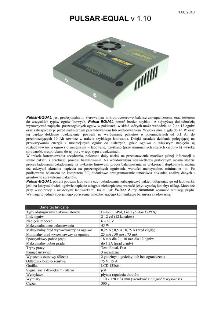 1.08.2010 PULSAR-EQUAL v 1.10 Pulsar-EQUAL jest profesjonalnym, sterowanym mikroprocesorowo balanserem-equalizerem, oraz testerem do wszystkich typów ogniw litowych. Pulsar-EQUAL potrafi bardzo szybko i z najwyŜszą dokładnością wyrównywać napięcia poszczególnych ogniw w pakietach, w skład których moŜe wchodzić od 2 do 12 ogniw oraz zabezpieczy je przed nadmiernym przeładowaniem lub rozładowaniem. Wysoka moc ciągła do 45 W oraz jej bardzo dokładne rozdzielenie, pozwala na wyrównanie pakietów o pojemnościach od 0,1 Ah do przekraczających 10 Ah równieŜ w trakcie szybkiego ładowania. Dzięki zasadzie działania polegającej na przekazywaniu energii z mocniejszych ogniw do słabszych, gdzie ogniwa o większym napięciu są rozładowywane a ogniwa o mniejszym – ładowane, uzyskano (przy minimalnych stratach cieplnych) wysoką sprawność, niespotykaną do tej pory w tego typu urządzeniach. W trakcie konstruowania urządzenia, połoŜono duŜy nacisk na przedstawienie moŜliwe pełnej informacji o stanie pakietu i przebiegu procesu balansowania. Na wbudowanym wyświetlaczu graficznym moŜna śledzić proces ładowania/rozładowania na wykresie liniowym, proces balansowania na wykresach słupkowych, moŜna teŜ odczytać aktualne napięcia na poszczególnych ogniwach, wartości maksymalne, minimalne itp. Po podłączeniu balansera do komputera PC, dodatkowe oprogramowanie umoŜliwia dokładną analizę danych i gruntowne sprawdzenie pakietów. Pulsar-EQUAL potrafi podczas ładowania czy rozładowania zabezpieczyć pakiet, odłączając go od ładowarki, jeśli na którymkolwiek ogniwie napięcie osiągnie niebezpieczną wartość (zbyt wysoką lub zbyt niską). MoŜe teŜ przy współpracy z niektórymi ładowarkami, takimi jak Pulsar 2 czy Akumatik wymusić redukcję prądu. Wymaga to jednak specjalnego połączenia umoŜliwiającego komunikację balansera z ładowarką. Dane techniczne Typy obsługiwanych akumulatorów Ilość ogniw Napięcie robocze Maksymalna moc balansowania Maksymalny prąd wyrównawczy na ogniwo Minimalny prąd wyrównawczy na ogniwo Spoczynkowy pobór prądu Maksymalny pobór prądu Tryby pracy Pamięć ustawień Wyłącznik czasowy (Sleep) Odłącznik bezpieczeństwa Grafika Sygnalizacja dźwiękiem / alarm Wentylator Wymiary CięŜar Li-Ion, Li-Pol, Li-Ph (Li-Ion FePO4) 2-12 cel (12 kanałów) 6 – 60 V 45 W 0,25 A ; 0,5 A ; 0,75 A (prąd ciągły) 25 mA ; 50 mA ; 75 mA 18 mA dla 2 ; 10 mA dla 12 ogniw do 1,2A (prąd ciągły) Test, Equal, Fast 3 niezaleŜne 2 godziny; 4 godziny; lub bez ograniczenia 75 V, 15 A LCD 133x64 jest płynna regulacja obrotów 110 x 120 x 34 mm (szerokość x długość x wysokość) 300 g Uwagi i zalecenia - przed pierwszym podłączeniem zapoznaj się dokładnie z instrukcją obsługi nie przeprowadzaj Ŝadnych modyfikacji i zmian w urządzeniu zawsze zwracaj szczególną uwagę na prawidłowość podłączeń chroń przed wilgocią i kurzem nie wkładaj Ŝadnych przedmiotów do otworów wentylacyjnych przy najmniejszej nieprawidłowości w działaniu balansera, skonsultuj się z autoryzowanym serwisem urządzenie powinno być uŜytkowane pod nadzorem EU - Świadectwo zgodności z normami Pulsar-EQUAL jest wykonany zgodnie z ogólnymi normami bezpieczeństwa – a w szczególności spełnia normy dotyczące urządzeń do uŜytku domowego jak EN 60335-1; EN 50081-1, EN 50082-1 oraz EN 50082- 2 Urządzenie oznaczono znakiem: ELPROG ul. Przemysłowa 1/611 PL 35-105 Rzeszów Po zakończeniu eksploatacji oddać do utylizacji sprzętu elektronicznego! Wprowadzenie Akumulatory litowe mogą być ładowane tylko do napięcia granicznego, charakterystycznego dla danego typu. Na przykład dla akumulatora Li-Pol wynosi ono 4,20 V dla pojedynczego gniwa. Dalsze ładowanie prowadzi do przeładowania i w konsekwencji do uszkodzenia czy nawet do samozapłonu ogniwa. W pakietach akumulatorów litowych w trakcie normalnego uŜytkowania (ładowanie/rozładowanie) dochodzi do zróŜnicowania się napięć na poszczególnych ogniwach. Jest to zjawisko normalne i wynika z minimalnych róŜnic pojemności oraz rezystancji wewnętrznych ogniw, wchodzących w skład pakietu. KaŜdy następny cykl ładowanie/rozładowanie pogłębia róŜnice, co zmniejsza pojemność pakietu a w najgorszym wypadku moŜe doprowadzić do jego uszkodzenia. Im więcej ogniw w pakiecie, tym bardziej trzeba dbać o wyrównanie napięć. Przykład: Chcemy naładować pakiet złoŜony z pięciu akumulatorów Li-Pol. Ładowarka zakończy ładowanie po osiągnięciu 21 V, czyli ładujemy pięć ogniw do 4,20 V na ogniwo. MoŜe zaistnieć sytuacja, Ŝe na skutek róŜnic napięć mamy cztery ogniwa po 4,10 V a ładowarka zakończy ładowanie dopiero, gdy ogniwo piąte będzie miało aŜ 4,60 V! Jest to niedopuszczalne i moŜe spowodować poŜar! Aby zapobiec podobnym sytuacjom, trzeba podczas ładowania kontrolować napięcia pojedynczych ogniw i w razie potrzeby tak je wyrównywać, by Ŝadne z nich nie przekroczyło granicznego napięcia. Do tego celu słuŜą balansery. Balansery mogą w róŜny sposób doprowadzać do wyrównania napięcia w pakietach. Te najprostsze, gdy ogniwo podczas ładowania uzyska juŜ napięcie końcowe, skierowują część prądu ładowania do opornika, który jego nadmiar przetworzy w ciepło (praktycznie jest to ogranicznik napięcia). Inne, zaczynają wyrównywać napięcia jeszcze przed osiągnięciem wartości granicznej (niekoniecznie podczas ładowania). Wyrównywanie napięć w pakietach o duŜych pojemnościach i duŜej ilości cel poprzez zamianę części energii w ciepło jest jednak kłopotliwe do realizacji, wydłuŜa czas ładowania z balansowaniem i w niektórych wypadkach, konieczne będzie wykonanie kilku cykli ładowań lub zmniejszenie prądu ładowania. Balansery najnowszej generacji, wykorzystujące ostatnie osiągnięcia techniczne, to urządzenia z „przetwarzaniem energii” i właśnie do takich naleŜy Pu
