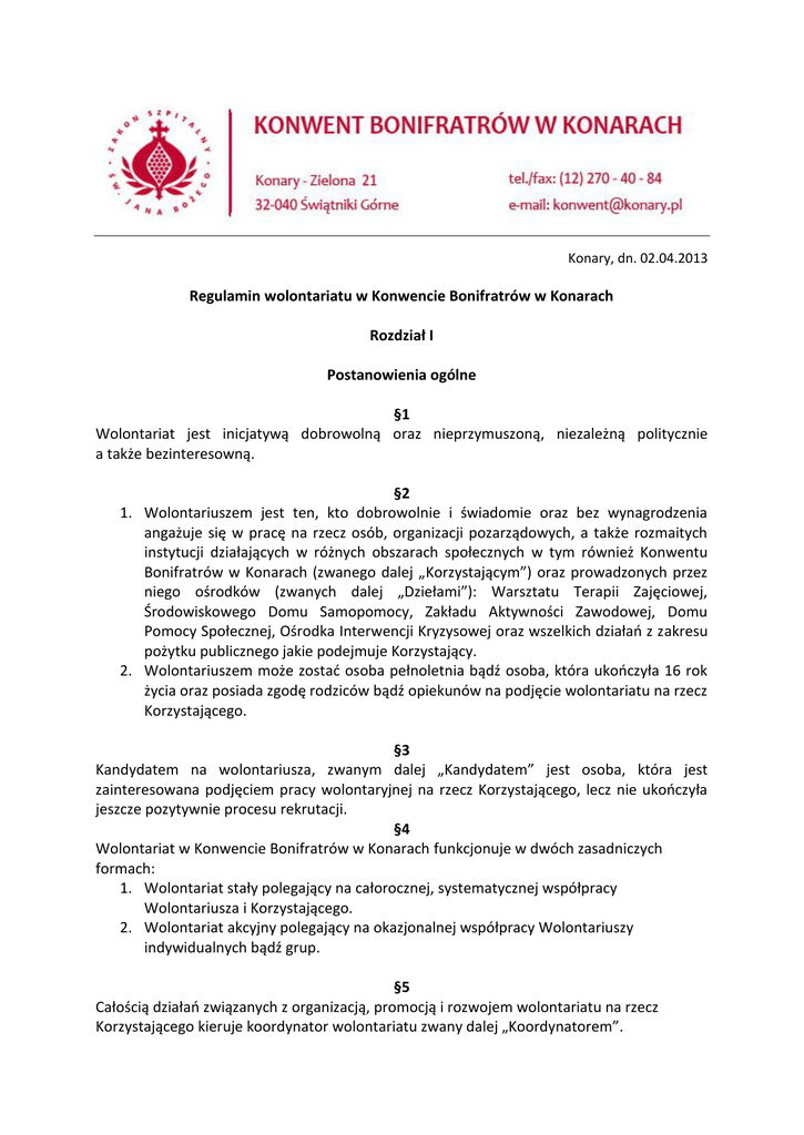 Konary, dn. 02.04.2013 Regulamin wolontariatu w Konwencie Bonifratrów w Konarach Rozdział I Postanowienia ogólne §1 Wolontariat jest inicjatywą dobrowolną oraz nieprzymuszoną, niezależną politycznie a także bezinteresowną. §2 1. Wolontariuszem jest ten, kto dobrowolnie i świadomie oraz bez wynagrodzenia angażuje się w pracę na rzecz osób, organizacji pozarządowych, a także rozmaitych instytucji działających w różnych obszarach społecznych w tym również Konwentu Bonifratrów w Konarach (zwanego dalej „Korzystającym”) oraz prowadzonych przez niego ośrodków (zwanych dalej „Dziełami”): Warsztatu Terapii Zajęciowej, Środowiskowego Domu Samopomocy, Zakładu Aktywności Zawodowej, Domu Pomocy Społecznej, Ośrodka Interwencji Kryzysowej oraz wszelkich działań z zakresu pożytku publicznego jakie podejmuje Korzystający. 2. Wolontariuszem może zostać osoba pełnoletnia bądź osoba, która ukończyła 16 rok życia oraz posiada zgodę rodziców bądź opiekunów na podjęcie wolontariatu na rzecz Korzystającego. §3 Kandydatem na wolontariusza, zwanym dalej „Kandydatem” jest osoba, która jest zainteresowana podjęciem pracy wolontaryjnej na rzecz Korzystającego, lecz nie ukończyła jeszcze pozytywnie procesu rekrutacji. §4 Wolontariat w Konwencie Bonifratrów w Konarach funkcjonuje w dwóch zasadniczych formach: 1. Wolontariat stały polegający na całorocznej, systematycznej współpracy Wolontariusza i Korzystającego. 2. Wolontariat akcyjny polegający na okazjonalnej współpracy Wolontariuszy indywidualnych bądź grup. §5 Całością działań związanych z organizacją, promocją i rozwojem wolontariatu na rzecz Korzystającego kieruje koordynator wolontariatu zwany dalej „Koordynatorem”. §6 Teren działania Wolontariuszy jest tożsamy z terenem działalności Korzystającego. §7 Niniejszy regulamin podlega wewnętrznym statutom i regulaminom w zakresie poszczególnych Dzieł prowadzonych przez Korzystającego. §8 Wolontariat na rzecz Korzystającego jest organizowany w oparciu o ustawę o działalności pożytku publicznego i o wolontariacie oraz aktualne ustawy i rozporządzenia na podstawie, których działają poszczególne Dzieła. §9 Zakres prac, czas oraz formy pomocy określa umowa pomiędzy Wolontariuszem a Korzystającym na rzecz, którego Wolontariusz zgadza się pracować wolontarystycznie, zwana dalej „Porozumieniem o współpracy”. Rozdział II Postanowienia Szczegółowe Część I Rekrutacja Wolontariuszy §10 Wolontariuszem stałym może zostać osoba pełnoletnia lub, która ukończyła 16 rok życia oraz posiada pisemną zgodę rodziców lub opiekunów na świadczenie wolontariatu oraz zakończy pozytywnie proces rekrutacji do Wolontariatu. §11 Wolontariuszem akcyjnym może zostać osoba pełnoletnia bądź niepełnoletnia za zgodą rodziców lub opiekunów, lub działająca w ramach szkolnych kół wolontariatu. §12 Osoba chętna do pracy w wolontariacie powinna zgłosić się do Koordynatora osobiście, telefonicznie bądź drogą elektroniczną oraz wypełnić i przekazać Koordynatorowi Ankietę informacyjną będącą Załącznikiem nr 1 do niniejszego Regulaminu. §13 Koordynator uzgadnia z kandydatem na wolontariusza termin rozmowy kwalifikacyjnej. W rozmowie kwalifikacyjnej może (mogą) uczestniczyć dodatkowo przedstawiciel(e) Dzieł(a), w którym wolontariusz planuje podjąć pracę. §14 Kandydat ma wolontariusza ma prawo uczestnictwa w zajęciach terapeutyczno – rehabilitacyjnych prowadzonych w Dziełach w celu zweryfikowania swoich motywacji i chęci do podjęcia działań wolontaryjnych w danym Dziele. Ilość zajęć w jakich kandydat może wziąć udział ustalana z Koordynatorem. §15 Po pozytywnym zakończeniu rekrutacji Kandydat podpisuje Porozumienie o współpracy przyjmując tym samym rolę Wolontariusza. §15 W przypadku podpisywania Porozumienia o współpracy konieczne jest ukazanie dowodu tożsamości a w przypadku osób, które ukończyły 16 rok życia lecz nie osiągnęły pełnoletności niezbędne jest również „Zaświadczenie o wyrażeniu zgody na wolontariat” będące Załącznikiem nr 2 do niniejszego Regulaminu, podpisane przez rodziców lub opiekunów prawnych Kandydata. §16 Przed podpisaniem „Porozumienia o współpracy” kandydat na wolontariusza jest zobowiązany do zapoznania się z „Regulaminem pracy wolontariusza” i zasadami BHP i PPoż. Zapoznanie się z nimi poświadcza podpisując stosowne oświadczenie będące częścią Porozumienia o współpracy. §17 W przypadku krótkotrwałego wolontariatu akcyjnego możliwe jest zawarcie porozumienia ustnego, po uzyskaniu aprobaty ze strony Wolontariusza. §18 Porozumienie zawierane jest na czas określony bądź nieokreślony i reguluje zakres czynności Wolontariusza. Część II Zasady pracy wolontariusza §19 Wolontariuszowi za wykonane czynności nie przysługuje wynagrodzenie finansowe. §20 Wolontariuszowi przysługuje w każdej chwili pisemne zaświadczenie dotyczące zawartego porozumienia i wykonywanych przez Wolontariusza działań. §21 Wolontariuszowi przysługują te same prawa, które przysługują pracownikom Dzieł, tj. Wolontariusz ma prawo do przerwy w pracy, ubioru roboczego – jeśli wymaga tego stanowisko pracy, szkolenia przygotowującego do pełnionych obowiązków. §22 Wolontariuszowi przysługuje zaopatrzenie z tytułu wypadku przy wykonywaniu świadczeń na podstawie Ustawy o działalności pożytku publicznego i o wolontariacie z dnia 24 kwietnia 2003 r. (Dz. U. Nr 96, poz. 873 z późn. zm.), art. 46 oraz Ustawy o zaopatrzeniu z tytułu wypadków lub chorób zawodowych powstałych w szczególnych okolicznościach z dnia 30 października 2002 r. (Dz.U. Nr 199, poz. 1674 oraz z 2003 r. Nr 83, poz. 760). §23 Wolontariusz ma obowiązek: 1. Przestrzegania postanowień zawartych w porozumieniu. 2. Zachowania tajemnicy służbowej. 3. Dbania o bezpieczeństwo osób niepełnos