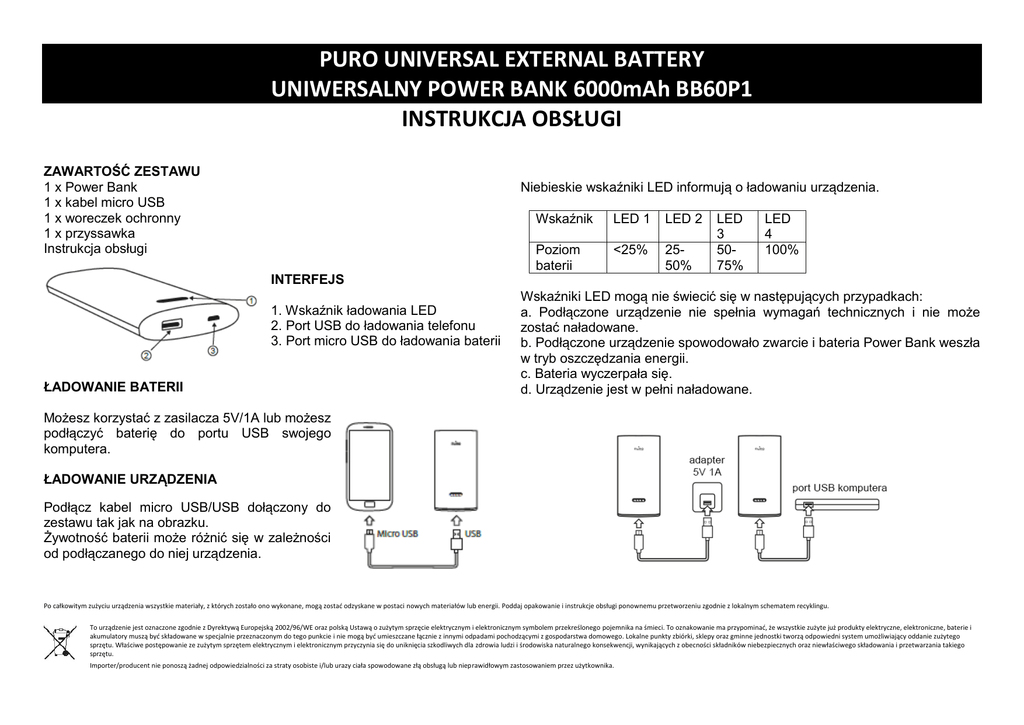 PURO UNIVERSAL EXTERNAL BATTERY UNIWERSALNY POWER BANK 6000mAh BB60P1 INSTRUKCJA OBSŁUGI ZAWARTOŚĆ ZESTAWU 1 x Power Bank 1 x kabel micro USB 1 x woreczek ochronny 1 x przyssawka Instrukcja obsługi Niebieskie wskaźniki LED informują o ładowaniu urządzenia. Wskaźnik LED 1 LED 2 Poziom baterii <25% 2550% LED 3 5075% LED 4 100% INTERFEJS 1. Wskaźnik ładowania LED 2. Port USB do ładowania telefonu 3. Port micro USB do ładowania baterii ŁADOWANIE BATERII Wskaźniki LED mogą nie świecić się w następujących przypadkach: a. Podłączone urządzenie nie spełnia wymagań technicznych i nie może zostać naładowane. b. Podłączone urządzenie spowodowało zwarcie i bateria Power Bank weszła w tryb oszczędzania energii. c. Bateria wyczerpała się. d. Urządzenie jest w pełni naładowane. Możesz korzystać z zasilacza 5V/1A lub możesz podłączyć baterię do portu USB swojego komputera. ŁADOWANIE URZĄDZENIA Podłącz kabel micro USB/USB dołączony do zestawu tak jak na obrazku. Żywotność baterii może różnić się w zależności od podłączanego do niej urządzenia. Po całkowitym zużyciu urządzenia wszystkie materiały, z których zostało ono wykonane, mogą zostać odzyskane w postaci nowych materiałów lub energii. Poddaj opakowanie i instrukcje obsługi ponownemu przetworzeniu zgodnie z lokalnym schematem recyklingu. To urządzenie jest oznaczone zgodnie z Dyrektywą Europejską 2002/96/WE oraz polską Ustawą o zużytym sprzęcie elektrycznym i elektronicznym symbolem przekreślonego pojemnika na śmieci. To oznakowanie ma przypominać, że wszystkie zużyte już produkty elektryczne, elektroniczne, baterie i akumulatory muszą być składowane w specjalnie przeznaczonym do tego punkcie i nie mogą być umieszczane łącznie z innymi odpadami pochodzącymi z gospodarstwa domowego. Lokalne punkty zbiórki, sklepy oraz gminne jednostki tworzą odpowiedni system umożliwiający oddanie zużytego sprzętu. Właściwe postępowanie ze zużytym sprzętem elektrycznym i elektronicznym przyczynia się do uniknięcia szkodliwych dla zdrowia ludzi i środowiska naturalnego konsekwencji, wynikających z obecności składników niebezpiecznych oraz niewłaściwego składowania i przetwarzania takiego sprzętu. Importer/producent nie ponoszą żadnej odpowiedzialności za straty osobiste i/lub urazy ciała spowodowane złą obsługą lub nieprawidłowym zastosowaniem przez użytkownika.