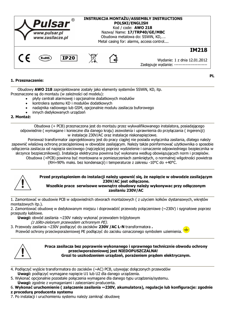 INSTRUKCJA MONTAŻU/ASSEMBLY INSTRUCTIONS POLSKI/ENGLISH Kod / code: AWO 218 Nazwa/ Name: 17/TRP40/GE/MBC Obudowa metalowa do: SSWiN, KD,…. Metal casing for: alarms, access control.... IM218 Wydanie: 1 z dnia 12.01.2012 Zastępuje wydanie: -----------------------PL 1. Przeznaczenie: Obudowy AWO 218 zaprojektowane zostały jako elementy systemów SSWiN, KD, itp. Przeznaczone są do montażu (w zależności od modelu): • płyty centrali alarmowej i opcjonalnie dodatkowych modułów • kontrolera systemu KD i modułów dodatkowych • nadajnika radiowego lub GSM, opcjonalnie modułu zasilacza buforowego • innych dedykowanych urządzeń 2. Montaż: Obudowa (+ PCB) przeznaczona jest do montażu przez wykwalifikowanego instalatora, posiadającego odpowiednie ( wymagane i konieczne dla danego kraju) zezwolenia i uprawnienia do przyłączania ( ingerencji) w instalacje 230V/AC oraz instalacje niskonapięciowe. Ponieważ transformator zaprojektowany jest do pracy ciągłej nie posiada wyłącznika zasilania, dlatego należy zapewnić właściwą ochronę przeciążeniową w obwodzie zasilającym. Należy także poinformować użytkownika o sposobie odłączenia zasilacza od napięcia sieciowego (najczęściej poprzez wydzielenie i oznaczenie odpowiedniego bezpiecznika w skrzynce bezpiecznikowej). Instalacja elektryczna powinna być wykonana według obowiązujących norm i przepisów. Obudowa (+PCB) powinna być montowana w pomieszczeniach zamkniętych, o normalnej wilgotności powietrza (RH=90% maks. bez kondensacji) i temperaturze z zakresu -10°C do +40°C. Przed przystąpieniem do instalacji należy upewnić się, że napięcie w obwodzie zasilającym 230V/AC jest odłączone. Wszelkie prace serwisowe wewnątrz obudowy należy wykonywac przy odłączonym zasilaniu 230V/AC 1. Zamontować w obudowie PCB w odpowiednich otworach montażowych ( z użyciem kołków dystansowych, wkrętów montażowych itp.). 2. Zamontować obudowę w dedykowanym miejscu i doprowadzić przewody połączeniowe (~230V) i sygnałowe poprzez przepusty kablowe. Uwagi: obwód zasilania ~230V należy wykonać przewodem trójżyłowym (z żółto-zielonym przewodem ochronnym PE). 3. Przewody zasilania ~230V podłączyć do zacisków 230V /AC L-N transformatora . Przewód ochrony przeciwporażeniowej PE podłączyć do zacisku oznaczonego symbolem uziemienia. Praca zasilacza bez poprawnie wykonanego i sprawnego technicznie obwodu ochrony przeciwporażeniowej jest NIEDOPUSZCZALNA! Grozi to uszkodzeniem urządzeń, porażeniem prądem elektrycznym. 4. Podłączyć wyjście transformatora do zacisków (~AC) PCB, używając dołączonych przewodów Uwagi: podłączyć wymagane napięcie U1 lub U2 dla danego urządzenia. 5. Wykonać opcjonalnie pozostałe połączenia wymagane dla danego typu urządzenia/systemu. Uwagi: zgodnie z wymaganiami i zaleceniami producenta. 6. Wykonać uruchomienie ( załączenie zasilania ~230V, akumulatora), regulacje lub konfiguracje: zgodnie z procedurą producenta systemu 7. Po instalacji i uruchomieniu systemu należy zamknąć obudowę 1. Destination: EN The AWO 218 metal casings are designed as components (supplying) in intruders alarms, access control systems, security systems etc. There are intended for installation: • control panel optional with supplementary modules • access control controllers with optional modules • radio or GSM transmitter with optional module PS • other dedicated devices, components etc. 2. Installation: The metal casing (+PCB) must be installed by a qualified installer, holding the relevant certificates, required and necessary in the particular country for connecting (interfering with) the 230 V AC systems and low-voltage installations. Because the transformer is designed for the continuous operation and is not equipped with ON/OFF switch, the power supply line should have the appropriate overload protection. The user should be informed how to disconnect the unit from the mains (the most often by separate and mark the adequate fuse in the fuse box). The power supply installation should be conform to the applicable standards and law. The casing (+PCB) should be installed indoors, where the air humidity is normal (RH=90% max. without condensation) and temperature in the range of -10°C to +40°C. Caution! Prior to entering for installation it is necessary to make sure if the voltage in the 230 V/AC circuit is disconnected. All service works inside the housing must be carried out with 230V/AC supply voltage disconnected. 1. Mount the PCB (control panel, etc) with dedicated holes (use distance pins, bracket screw). 2. Install metal casing in dedicated place and bring in the connecting (~230V) and signal conductors through cables bushings. Remarks: supply circuit ~230V should be carried out with three-core cable (with yellow-green protective PE conductor). 3. Supply conductors ~230V should be connected to 230V / AC L-N terminals of the transformers. Protective conductor should be connected to the terminal marked with grounding symbol. Caution! Operating the power supply without properly made and technically operational electric shock protection circuit is IMPERMISSIBLE! This creates hazard of equipment damage and risk of electric shock. 4. Connect the output of transformer to the terminals (~AC) on the PCB, using installed cables Remarks: connect required voltage U1 or U2 (secondary voltage) for the correct device. 5. If necessary, make other connections required for the correct type of system / device. Remarks: consistent with requirements and recommendation of the producer. 6. Start the system (switch on ~230V, battery), adjust or configure: according to procedure of the producer’s system. 7. After installing and checking the proper operation of the system, close the casing. 2 3. Parametry techniczne / Technical data: PL/EN PARAMETRY TECHNICZNE TECHNICAL DATA Napięcie zasilania 230V/AC, 50Hz (-/+15%) Power supply voltage Transformator Norma transformatora 