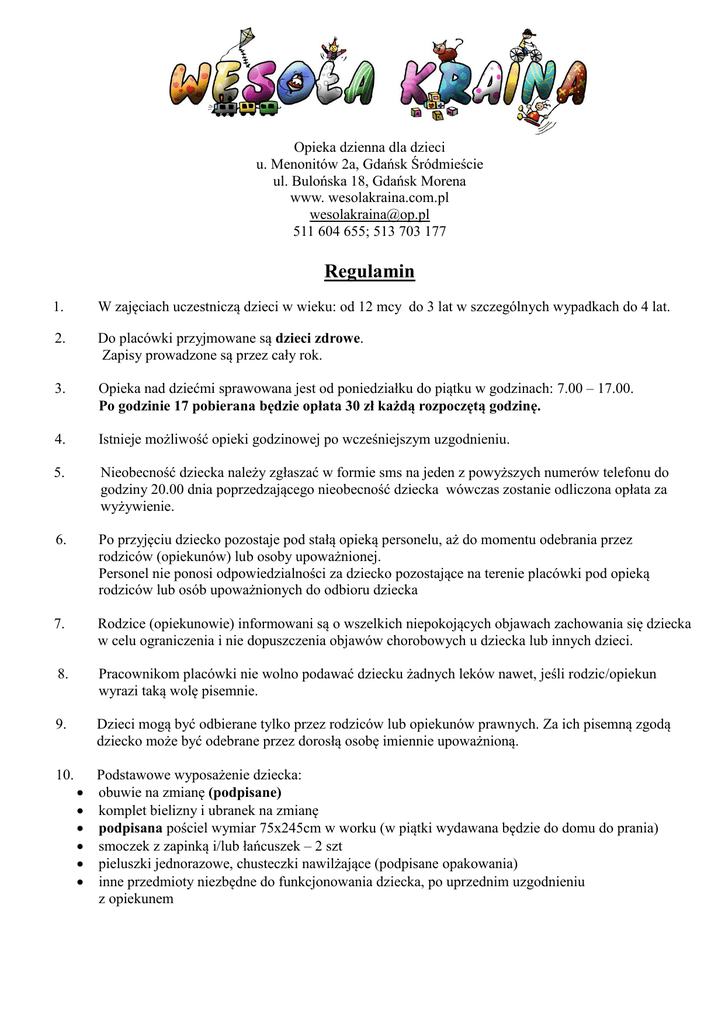 Opieka dzienna dla dzieci u. Menonitów 2a, Gdańsk Śródmieście ul. Bulońska 18, Gdańsk Morena www. wesolakraina.com.pl [email protected] 511 604 655; 513 703 177 Regulamin 1. W zajęciach uczestniczą dzieci w wieku: od 12 mcy do 3 lat w szczególnych wypadkach do 4 lat. 2. Do placówki przyjmowane są dzieci zdrowe. Zapisy prowadzone są przez cały rok. 3. Opieka nad dziećmi sprawowana jest od poniedziałku do piątku w godzinach: 7.00 – 17.00. Po godzinie 17 pobierana będzie opłata 30 zł każdą rozpoczętą godzinę. 4. Istnieje możliwość opieki godzinowej po wcześniejszym uzgodnieniu. 5. Nieobecność dziecka należy zgłaszać w formie sms na jeden z powyższych numerów telefonu do godziny 20.00 dnia poprzedzającego nieobecność dziecka wówczas zostanie odliczona opłata za wyżywienie. 6. Po przyjęciu dziecko pozostaje pod stałą opieką personelu, aż do momentu odebrania przez rodziców (opiekunów) lub osoby upoważnionej. Personel nie ponosi odpowiedzialności za dziecko pozostające na terenie placówki pod opieką rodziców lub osób upoważnionych do odbioru dziecka 7. Rodzice (opiekunowie) informowani są o wszelkich niepokojących objawach zachowania się dziecka w celu ograniczenia i nie dopuszczenia objawów chorobowych u dziecka lub innych dzieci. 8. Pracownikom placówki nie wolno podawać dziecku żadnych leków nawet, jeśli rodzic/opiekun wyrazi taką wolę pisemnie. 9. Dzieci mogą być odbierane tylko przez rodziców lub opiekunów prawnych. Za ich pisemną zgodą dziecko może być odebrane przez dorosłą osobę imiennie upoważnioną. 10. Podstawowe wyposażenie dziecka: obuwie na zmianę (podpisane) komplet bielizny i ubranek na zmianę podpisana pościel wymiar 75x245cm w worku (w piątki wydawana będzie do domu do prania) smoczek z zapinką i/lub łańcuszek – 2 szt pieluszki jednorazowe, chusteczki nawilżające (podpisane opakowania) inne przedmioty niezbędne do funkcjonowania dziecka, po uprzednim uzgodnieniu z opiekunem 11. Wszelkie przybory plastyczne i techniczne do wykonywania prac na zajęciach zapewnia placówka. 12. Prawa dziecka: Dziecko ma w szczególności prawo do: równego traktowania poszanowania godności osobistej i intymności życzliwego i podmiotowego traktowania, wypowiadania myśli, wyrażania uczuć opieki, zabawy, wypoczynku i współdziałania z innymi dziećmi nietykalności fizycznej nieskrępowanego uczestnictwa w życiu kulturalnym i artystycznym 13. Rodzice mogą zgłaszać propozycje do programów wychowawczych, programów profilaktyki promocji zdrowia, włączyć się w organizację imprez okolicznościowych. 14. Za pobyt dziecka rodzice (opiekunowie) obowiązani są wnosić opłaty najpóźniej do 5 dnia kalendarzowego miesiąca za dany miesiąc, 15. Nieobecność dziecka powyżej 4 tygodni (ciągłej nieobecności) zwalnia rodziców z 20 % opłaty za czesne. 16. Placówki są nieczynne w dni ustawowo wolne od pracy Placówka Gdańsk Śródmieście nieczynna od 24.07.2017 do 04.08.2017 Placówka Gdańsk Morena nieczynna od 07.08.2017 do 18.08.2017 Przerwa świąteczna: 24.12.2017 – 01.01.2018 17. Prosimy rodziców o kierowanie uwag do personelu w trosce o dobro dziecka oraz o zapoznawanie się z treścią ogłoszeń i komunikatów. ……………………………… (data) ............................................. (podpis Rodzica / Opiekuna)