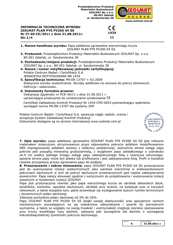 Przedsiębiorstwo Produkcji Materiałów Budowlanych IZOLMAT Sp. z o.o. 80-051 Gdańsk ul. Sandomierska 38 www.izolmat.com.pl INFORMACJA TECHNICZNA WYROBU IZOLMAT PLAN PYE PV200 S4 SS Nr IT-40-CE/2011 z dnia 31.08.2011r. Str.1/4 1434 11 _______________________________________________________________________________________ 1. Nazwa handlowa wyrobu: Papa asfaltowa zgrzewalna wierzchniego krycia IZOLMAT PLAN PYE PV200 S4 SS 2. Producent: Przedsiębiorstwo Produkcji Materiałów Budowlanych IZOLMAT Sp. z o.o. 80-051 Gdańsk, ul. Sandomierska 38 3. Pochodzenie/miejsce produkcji: Przedsiębiorstwo Produkcji Materiałów Budowlanych IZOLMAT Sp. z o.o., 80-051 Gdańsk, ul. Sandomierska 38 4. Nazwa i numer notyfikowanej jednostki certyfikującej: Polskie Centrum Badań i Certyfikacji S.A. JEDNOSTKA NOTYFIKOWANA NR 1434 5. Specyfikacja techniczna: PN-EN 13707 + A2:2009 Elastyczne wyroby wodochronne. Wyroby asfaltowe na osnowie do pokryć dachowych. Definicje i właściwości. 6. Dokumenty formalno-prawne: Deklaracja Zgodności nr PCE-40/11 z dnia 31.08.2011 r. uprawniająca producenta do umieszczania oznakowania Certyfikat Zakładowej Kontroli Produkcji Nr 1434-CPD-0053 potwierdzający spełnienie wymagań normy PN-EN 13707 dla systemu ZKP Polskie Centrum Badań i Certyfikacji S.A. sprawuje ciągły nadzór, ocenia i akceptuje System Zakładowej Kontroli Produkcji. Dokumenty dostępne są na stronie internetowej www.izolmat.com.pl 7. Opis wyrobu: papa asfaltowa zgrzewalna IZOLMAT PLAN PYE PV200 S4 SS jest rolowym materiałem izolacyjnym otrzymywanym przez odpowiednie pokrycie asfaltem modyfikowanym SBS impregnowanej asfaltem osnowy z włókniny poliestrowej; wierzchnia strona wstęgi papy pokryta jest posypką mineralną gruboziarnistą, z wyjątkiem pasa zakładkowego o szerokości ok.9 cm wzdłuż jednego brzegu wstęgi papy zabezpieczonego folią z tworzywa sztucznego; spodnia strona papy może być płaska lub profilowana i jest zabezpieczona folią. Profil w kształcie rowków przyspiesza proces zgrzewania papy do podłoża. 8. Przeznaczenie i zakres stosowania: papa IZOLMAT PLAN PYE PV200 S4 SS przeznaczona jest do wykonywania izolacji wodochronnych jako warstwa wierzchnia w wielowarstwowych pokryciach dachowych w tym do pokryć dachowych przeznaczonych pod ciężkie zabezpieczenie powierzchni. Papę należy stosować zgodnie z wytycznymi do projektowania i wykonywania izolacji zawartymi w Systemach Izolacji IZOLMAT. Papa jest przeznaczona również jako papa wierzchniego krycia do obróbek dekarskich attyk, świetlików, kominów, wpustów dachowych, obróbek przy ścianie, na dylatacje oraz w korytach zlewowych, a także wszędzie tam, gdzie przewiduje się występowanie dużych ruchów termicznych i dynamicznych połaci dachowej. Zalecane pochylenie połaci dachowej od 3% do 20%. Papa IZOLMAT PLAN PYE PV200 S4 SS dzięki swojej elastyczności oraz specjalnym cechom mechanicznym pozwalającym na jej wielokrotne odkształcanie i powrót do pierwotnych wymiarów, a także ze względu na swoją trwałość i wytrzymałość znajduje szerokie zastosowanie przy kryciu wszelkiego typu dachów; zalecana jest szczególnie dla dachów o wymaganej kilkudziesięcioletniej żywotności pokrycia dachowego. EDYCJA : DATA WYDANIA : A 31.08.2011 r. Przedsiębiorstwo Produkcji Materiałów Budowlanych IZOLMAT Sp. z o.o. 80-051 Gdańsk ul. Sandomierska 38 www.izolmat.com.pl INFORMACJA TECHNICZNA WYROBU IZOLMAT PLAN PYE PV200 S4 SS Nr IT-40-CE/2011 z dnia 31.08.2011 r. Str.2/4 1434 11 _______________________________________________________________________________________ 9. Sposób układania: papę należy mocować metodą zgrzewania. 10. Informacja o badaniach i właściwości wyrobu: Papa asfaltowa zgrzewalna wierzchniego krycia IZOLMAT PLAN PYE PV200 S4 SS Właściwości Metoda badania Klasyfikacja 1 2 Jednostka miary Przedstawianie Wymagania wyników 3 4 Wady widoczne PN-EN 1850-1 ---- Spełnienie 5 Długość * PN-EN 1848-1 m MLV Nie mniej niż 5,0 Szerokość * PN-EN 1848-1 m MLV Nie mniej niż 0,99 Prostoliniowość PN-EN 1848-1 ---- MLV Brak wad widocznych wymagań (1,00 ± 0,01) Odchyłka: niewiększa niż 10mm na 5m długości papy Grubość Wodoszczelność przy ciśnieniu 10kPa PN-EN 1849-1 mm MDV PN-EN 1928 ---- Spełnienie PN-EN 1110 o MLV +100 – PN-EN 1109 o C MLV -20 N/50mm MDV Odporność na spływanie w podwyższonej – temperatura, dla Papa wodoszczelna wymagań Metoda A temperaturze 4,2± 0,2 C której średnia wartość przemieszczenia górnej i dolnej powierzchni próbki umieszczonej pionowo jest mniejsza niż 2mm Giętkość w niskiej temperaturze temperatura, przy której nie obserwuje się rys lub pęknięć przy przeginaniu na półobwodzie wałka o średnicy 30mm Maksymalna siła rozciągająca - kierunek wzdłuż - kierunek w poprzek Wydłużenie przy maksymalnej sile PN-EN 12311-1 900 ± 100 600 ± 100 PN-EN 12311-1 % MDV rozciągającej - kierunek wzdłuż - kierunek w poprzek 50 ± 10 50 ± 10 Stabilność wymiarów PN-EN 1107-1 - Metoda A zmiana wymiarów Przyczepność posypki % MLV ≤0,5 PN-EN 12039 % MDV 10 ± 10 Odporność na sztuczne starzenie pod PN-EN 1296 o C MDV +100 ± 10 działaniem podwyższonej temperatury w PN-EN 1110 ---- ---- ---- PN-EN ISO 11925-2 ---- klasa -ubytek masy posypki czasie 12 tygodni–temperatura, dla której średnia wartości przemieszczenia górnej i dolnej powierzchni próbki umieszczonej pionowo jest mniejsza niż 2mm Przenikanie pary wodnej Reakcja na ogień µ = 20 000** E PN-EN 13501-1 * - istnieje możliwość produkcji papy o innej długości i/lub szerokości z zachowaniem wymagania, że określona w badaniach wartość długości i/lub szerokości jest nie mniejsza niż deklarowana ** - przyjęto zgodnie z PN-EN 13707 EDYCJA : DATA WYDANIA : A 31.08.2011 r. Przedsiębiorstwo Produkcji Materiałów Budowlanych IZOLMAT Sp. z o.o. 80-051 Gdańsk ul. Sandomierska 38 www.izolmat.com.pl INFORMACJA TECHNICZNA WYROBU IZOLMAT PLAN PYE P