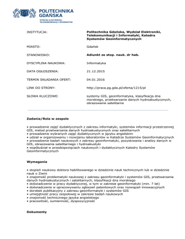 INSTYTUCJA: Politechnika Gdańska, Wydział Elektroniki, Telekomunikacji i Informatyki, Katedra Systemów Geoinformatycznych MIASTO: Gdańsk STANOWISKO: Adiunkt ze stop. nauk. dr hab. DYSCYPLINA NAUKOWA: Informatyka DATA OGŁOSZENIA: 21.12.2015 TERMIN SKŁADANIA OFERT: 04.01.2016 LINK DO STRONY: http://praca.pg.gda.pl/oferta/1215/pl SŁOWA KLUCZOWE: systemy GIS, geoinformatyka, klasyfikacja dna morskiego, przetwarzanie danych hydroakustycznych, obrazowanie satelitarne Zadania/Rola w zespole • prowadzenie zajęć dydaktycznych z zakresu informatyki, systemów informacji przestrzennej GIS, metod przetwarzania danych hydroakustycznych oraz satelitarnych • prowadzenie wybranych zajęć dydaktycznych w języku angielskim • udział w organizowaniu i rozwijaniu laboratoriów w Katedrze Systemów Geoinformatycznych • prowadzenie badań naukowych z zakresu geoinformatyki, pozyskiwania i analizy danych w GIS, obrazowania satelitarnego i hydroakustyki • współudział w przedsięwzięciach naukowych i dydaktycznych Katedry Systemów Geoinformatycznych Wymagania • stopień naukowy doktora habilitowanego w dziedzinie nauk technicznych lub w dziedzinie nauk o Ziemi • znajomość problematyki naukowej z zakresu geoinformatyki i systemów GIS, przetwarzania danych hydroakustycznych i satelitarnych, klasyfikacji dna morskiego • doświadczenie w pracy dydaktycznej, w tym w zakresie geoinformatyki (min. 7 lat) • doświadczenie w opracowywaniu zgłoszeń patentowych oraz rozwiązań innowacyjnych • dorobek publikacyjny z zakresu geoinformatyki i systemów GIS • umiejętność pracy zespołowej w zakresie badań naukowych • znajomość technicznego języka angielskiego • pracowitość, sumienność, dyspozycyjność Dokumenty • odpis dyplomu uzyskania stopnia naukowego doktora habilitowanego nauk technicznych lub w dziedzinie nauk o Ziemi • podanie skierowane do Prorektora ds. Nauki Politechniki Gdańskiej • życiorys • kwestionariusz osobowy • informacja o dorobku naukowym i dydaktycznym wraz ze spisem publikacji • opinia co najmniej jednego nauczyciela akademickiego z tytułem naukowym profesora TERMIN ROZSTRZYGNIĘCIA KONKURSU: 05.01.2016 PLANOWANY TERMIN ZATRUDNIENIA: 01.03.2016 Dokumenty należy złożyć do 04.01.2016 w Katedrze Systemów Geoinformatycznych, Wydział Elektroniki, Telekomunikacji i Informatyki Politechniki Gdańskiej, pok. EA 744. Prosimy o umieszczenie klauzuli "Wyrażam zgodę na przetwarzanie danych osobowych zawartych w mojej ofercie dla potrzeb niezbędnych przy procesie rekrutacji (zgodnie z Ustawą z dnia 29.08.1997 o Ochronie Danych Osobowych Dz.Ust. nr 133 poz. 883)". Konkurs może zostać zamknięty bez wyłonienia kandydata. Skontaktujemy się z wybranymi osobami. Nadesłanych pocztą ofert nie odsyłamy. Zlecający zastrzegają sobie prawo do odpowiedzi jedynie na wybrane oferty.