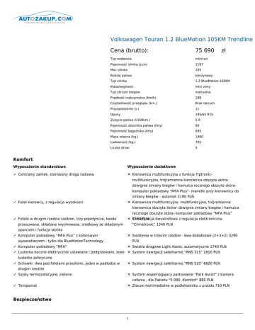 Volkswagen Touran 1.2 BlueMotion 105KM Trendline Cena (brutto): 75 690 zł Typ nadwozia minivan Pojemność silnika (ccm) 1197 Moc silnika 105 Rodzaj paliwa benzynowy Typ silnika 1.2 BlueMotion 105KM Klasa/segment mini vany Typ skrzyni biegów manualna Prędkość maksymalna (km/h) 188 Częstotliwość przeglądu (km.) Brak danych Przyspieszenie (s.) 11 Opony 195/65 R15 Zużycie paliwa (l/100km.) 5.9 Pojemność zbiornika paliwa (litry) 60 Pojemność bagażnika (litry) 695 Masa własna (kg.) 1460 Ładowność (kg.) 705 Liczba drzwi 5 Komfort Wyposażenie standardowe Wyposażenie dodatkowe ✓ Centralny zamek, sterowany droga radiowa ✕ Kierownica multifunkcyjna z funkcja Tiptronicmultifunkcyjna, trójramienna kierownica obszyta skóradzwignie zmiany biegów i hamulca recznego obszyte skórakomputer pokładowy "MFA Plus"- manetki przy kierownicy do zmiany biegów - automat 2190 PLN ✓ Fotel kierowcy, z regulacja wysokosci ✕ Kierownica multifunkcyjna- multifunkcyjna, trójramienna kierownica obszyta skóra- dzwignie zmiany biegów i hamulca recznego obszyte skóra- komputer pokładowy "MFA Plus" ✓ Fotele w drugim rzedzie siedzen, trzy pojedyncze, kazde ✕ Klimatyzacja 1560 PLN dwustrefowa z regulacja elektroniczna przesuwane, składane iwyjmowane, srodkowy ze składanym "Climatronic" 1240 PLN oparciem i funkcja stolika ✓ Komputer pokładowy "MFA Plus" z kolorowym ✕ Siedzenia w trzecim rzedzie - dwa dodatkowe (2+3+2) 3290 wyswietlaczem - tylko dla BlueMotionTechnology ✓ Komputer pokładowy "MFA" PLN ✕ Swiatła drogowe Light Assist, automatyczne 1740 PLN ✓ Lusterka boczne elektrycznie ustawiane i podgrzewane, lewe ✕ System nawigacji satelitarnej "RNS 315" 2810 PLN lusterko asferyczne ✓ Schowki: dwa pod fotelami przednimi, jeden w podłodze w ✕ System nawigacji satelitarnej "RNS 510" 6620 PLN drugim rzedzie ✓ Szyby termoizolacyjne, zielone ✕ System wspomagajacy parkowanie "Park Assist" z kamera ✓ Tempomat ✕ Złacze multimedialne w podłokietniku z przodu 710 PLN cofania - dla Pakietu "5 090 -Komfort" 880 PLN Bezpieczeństwo 1 Wyposażenie standardowe Wyposażenie dodatkowe ✓ ESP (elektroniczny system kontroli trakcji), wraz z ABS, EDS i ✕ Swiatła bi-ksenonowe z funkcja doswietlania zakretów i ASR oraz asystentem siłyhamowania swiatłami do jazdy dziennej LEDz przodu 6930 PLN ✓ Kurtyny powietrzne dla pierwszego i drugiego rzedu siedzen\n ✓ Poduszki powietrzne boczne, z przodu\n ✓ Poduszki powietrzne dla kierowcy i pasazera\n Dodatki Wyposażenie standardowe Wyposażenie dodatkowe ✓ Antena w bocznych szybach, aktywna ✕ Autoalarm z niezaleznym zasilaniem (Back-up-Horn), funkcja dozoru wnetrza i czujnikiem przechyłu 1640 PLN ✓ Aplikacje dekoracyjne "Chrom matt" na desce rozdzielczej, ✕ Czujnik kontroli cisnienia w oponach 240 PLN po stronie pasażera ✓ Asystent podjazdu ✕ Dywaniki materiałowe dla wszystkich rzedów siedzen 510 PLN ✓ Kierownica trójramienna ✕ Hak holowniczy, zdejmowany 3650 PLN ✓ Klimatyzacja z regulacja manualna "Climatic" ✕ Instalacja telefonu Premium 1880 PLN ✓ Lakier uniwersalny ✕ Lakier metaliczny 2190 PLN ✓ Listwy ochronne boczne i klamki, w kolorze czarnym ✕ Lakier perłowy 2190 PLN ✓ Obrecze stalowe 6J x 15 z kołpakami - tylko dla BlueMotion- ✕ Ogrzewanie postojowe sterowane pilotem 4680 PLN opony 195/65 R 15 o obnizonym oporze toczenia ✓ Obrecze stalowe 6J x 15 z kołpakami- opony 195/65 R 15 ✕ Relingi dachowe, czarne 950 PLN ✓ Poduszka powietrzna dla pasazera - deaktywacja ✕ Siatka pionowa, oddzielajaca przestrzen pasazerska od bagazowej 980 PLN ✓ Podłokietnik z przodu, ze schowkiem ✕ Swiatła przeciwmgielne, z przodu, z funkcja statycznego doswietlania zakretów 930 PLN ✓ system radiowy "RCD 310" z odtwarzaczem CD, MP3 i ✕ System radiowy "RCD 510" 1430 PLN osmioma głosnikami ✓ System rekuperacji odzyskujacy energie podczas hamowania ✕ System wspomagajacy parkowanie "Park Assist" 3450 PLN - tylko dla BlueMotionTechnology ✓ System Start-Stop wyłaczajacy silnik podczas postoju - tylko ✕ System wspomagajacy parkowanie "Park Assist" z kamera dla BlueMotion Technology cofania 4330 PLN ✓ Szyby sterowane elektrycznie, z przodu i z tyłu\n ✓ Tapicerka siedzen "Charly"\n ✓ Zaluzja nad przestrzenia bagazowa\n ✓ Zestaw naprawczy "Pannenset": kompresor 12-Volt ze środkiem uszczelniającym opony\n Doprecyzowanie oferty ✕ Lusterka - 1880 PLN Czujnik deszczu Czujnik zmierzchu świateł z funkcją Coming/Leaving Home Lusterka zewnętrzne regulowane elektrycznie, składane Lusterko po stronie pasażera obniżane automatycznie przy wstecznym biegu 2 Lusterko wewnętrzne wsteczne automatycznie przyciemniane Oświetlenie przestrzeni wokół drzwi ✕ 5 090 - Komfort - 5090 PLN - oswietlenie tablicy rejestracyjnej w technologii LED - swiatła bi-ksenonowe z funkcja doswietlania zakretów, swiatła do jazdy dziennej LED zprzodu - system wspomagajacy parkowanie "Park Assist" Czujniki parkowania z przodu i z tyłu Komputer pokładowy "MFA Plus" Siatka pionowa, oddzielajaca przestrzen pasazerska od bagazowej wizualizacja odstepu od przeszkody na ekranie radia ✕ Pakiet "Koło zapasowe I" - 1040 PLN dostepny tylko dla wersji 5-miejscowej Koło zapasowe, pełnowymiarowe podłoga o zmiennej powierzchni w bagazniku ✕ Elementy skórzane - 800 PLN Dźwignie zmiany biegów i hamulca ręcznego obszyte skórą Kierownica pokryta skórą ✕ Lusterka - 1920 PLN Czujnik deszczu Czujnik zmierzchu świateł z funkcją Coming/Leaving Home Lusterka zewnętrzne regulowane elektrycznie, składane Lusterko po stronie pasażera obniżane automatycznie przy wstecznym biegu Lusterko wewnętrzne wsteczne automatycznie przyciemniane Oświetlenie przestrzeni wokół drzwi ✕ Zawieszenie wzmocnione - 1710 PLN Wzmocnione sprężyny Zawieszenie podniesione o około 15 mm ✕ Zimowy - 2090 PLN Fotele przednie podgrzewane Kontrolka poziomu płynu do spryskiwaczy Podgrzewane dysze spryskiwaczy przedniej 