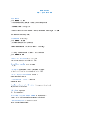 NOC JAZZU 12/13 lipca 2014 rok Mały Rynek godz. 18.00 - 22.00 Eddie Henderson (USA) & Tomek Grochot Quintet Karen Edwards Show (USA) Grzech Piotrowski One World (Polska, Holandia, Norwegia, Kuwejt) Jamal Thomas Band (USA) Rotunda CK ul. Oleandry 1 godz. 22.00 – 01.00 Adam Pierończyk solo (Polska) Francesco Cafiso & Mauro Schiavone (Włochy) Koncerty krakowskich klubach i kawiarniach godz. 22.00-01.00 Piwnica Pod Baranami Rynek Główny 27 NSI Quartet (zwycięzcy Jazz nad Odrą 2014) Harris Piano Jazz Bar Rynek Główny 28 F.O.U.R.S Pracownia Rynek Główny 27 (obok Piwnicy Pod Baranami) Bartosz Dworak Kwartet (zwycięzcy Jazz Juniors 2013) Piec Art Acoustic Jazz Club ul. Szewska 12 Adam Kawończyk Quartet Klub Studencki „Żaczek” al. 3 Maja 5 Generation Next Klub Dziennikarzy „Pod Gruszką” ul. Szczepańska 1 (na piętrze) Zbigniew Czarnecki Quartet Tak było ul. Szpitalna 9 Piotr Domagała Band Mile Stone Jazz Club (Hotel Qubus) ul. Nadwiślańska 6 Ryszard Styła – Jubileuszowy koncert polsko-holenderski Tawerna Stary Port ul. Straszewskiego 27 Leszek Hefe Wiśniowski Band Alchemia ul. Estery 5 Biotone Cafe Foyer pl. Św. Ducha 1 (podziemia Teatru Słowackiego) Organ Spot Restauracja Gródek ul. Na Gródku 4 Kuba Płużek Trio Księgarnia Muzyczna „Kurant” Rynek Główny 36 Mag Balay Project