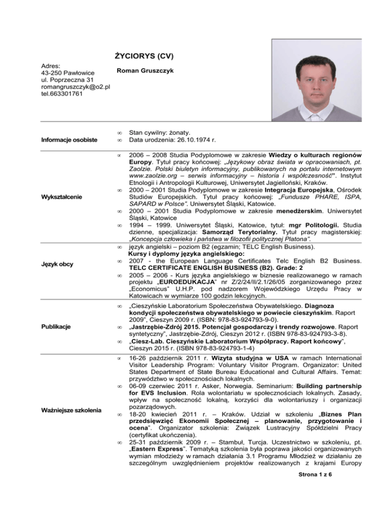 ŻYCIORYS (CV) Adres: 43-250 Pawłowice ul. Poprzeczna 31 [email protected] tel.663301761 Informacje osobiste Roman Gruszczyk • • Stan cywilny: żonaty. Data urodzenia: 26.10.1974 r. • 2006 – 2008 Studia Podyplomowe w zakresie Wiedzy o kulturach regionów Europy. Tytuł pracy końcowej: „Językowy obraz świata w opracowaniach, pt. Zaolzie. Polski biuletyn informacyjny, publikowanych na portalu internetowym www.zaolzie.org – serwis informacyjny – historia i współczesność”. Instytut Etnologii i Antropologii Kulturowej, Uniwersytet Jagielloński, Kraków. 2000 – 2001 Studia Podyplomowe w zakresie Integracja Europejska, Ośrodek Studiów Europejskich. Tytuł pracy końcowej: „Fundusze PHARE, ISPA, SAPARD w Polsce”. Uniwersytet Śląski, Katowice. 2000 – 2001 Studia Podyplomowe w zakresie menedżerskim. Uniwersytet Śląski, Katowice 1994 – 1999. Uniwersytet Śląski, Katowice, tytuł: mgr Politologii. Studia dzienne, specjalizacja: Samorząd Terytorialny. Tytuł pracy magisterskiej: „Koncepcja człowieka i państwa w filozofii politycznej Platona”. język angielski – poziom B2 (egzamin; TELC English Business). Kursy i dyplomy języka angielskiego: 2007 - the European Language Certificates Telc English B2 Business. TELC CERTIFICATE ENGLISH BUSINESS (B2). Grade: 2 2005 – 2006 - Kurs języka angielskiego w biznesie realizowanego w ramach projektu „EUROEDUKACJA” nr Z/2/24/II/2.1/26/05 zorganizowanego przez „Economicus” U.H.P. pod nadzorem Wojewódzkiego Urzędu Pracy w Katowicach w wymiarze 100 godzin lekcyjnych. • Wykształcenie • • • Język obcy • • • Publikacje • • • • Ważniejsze szkolenia • • „Cieszyńskie Laboratorium Społeczeństwa Obywatelskiego. Diagnoza kondycji społeczeństwa obywatelskiego w powiecie cieszyńskim. Raport 2009”, Cieszyn 2009 r. (ISBN: 978-83-924793-9-0). „Jastrzębie-Zdrój 2015. Potencjał gospodarczy i trendy rozwojowe. Raport syntetyczny”, Jastrzębie-Zdrój, Cieszyn 2012 r. (ISBN 978-83-924793-3-8). „Ciesz-Lab. Cieszyńskie Laboratorium Współpracy. Raport końcowy”, Cieszyn 2015 r. (ISBN 978-83-924793-1-4) 16-26 październik 2011 r. Wizyta studyjna w USA w ramach International Visitor Leadership Program: Voluntary Visitor Program. Organizator: United States Department of State Bureau Educational and Cultural Affairs. Temat: przywództwo w społecznościach lokalnych. 06-09 czerwiec 2011 r. Asker, Norwegia. Seminarium: Building partnership for EVS Inclusion. Rola wolontariatu w społecznościach lokalnych. Zasady, wpływ na społeczność lokalną, korzyści dla wolontariuszy i organizacji pozarządowych. 18-20 kwiecień 2011 r. – Kraków. Udział w szkoleniu „Biznes Plan przedsięwzięć Ekonomii Społecznej – planowanie, przygotowanie i ocena”. Organizator szkolenia: Związek Lustracyjny Spółdzielni Pracy (certyfikat ukończenia). 25-31 październik 2009 r. – Stambuł, Turcja. Uczestnictwo w szkoleniu, pt. „Eastern Express”. Tematyką szkolenia była poprawa jakości organizowanych wymian młodzieży w ramach działania 3.1 Programu Młodzież w działaniu ze szczególnym uwzględnieniem projektów realizowanych z krajami Europy Strona 1 z 6 Wschodniej i Kaukazu. Szkolenie zorganizowała Narodowa Agencja Programu Młodzież w Działaniu w Turcji. • styczeń 2007 r. - wrzesień 2009 r. – uczestnictwo w IV edycji programu „Liderzy Polsko – Amerykańskiej Fundacji Wolności”. Program obejmował 14 miesięczny program edukacyjny skierowany dla liderów społecznych, obejmujący indywidualną pracę z tutorem, szkolenia, staże i wizyty studyjne. Odbyte szkolenia w ramach projektu: 13-16.03.2008r.- „Umiejętności liderskie”. 16-17.05.2008r.– „Rozwój osobisty-wzmocnienie tożsamości lidera”. • 4-10 wrzesień 2006 r. – Berno, Szwajcaria. Uczestnictwo w module szkoleniowym nr 3 Obywatelstwo Europejskie, pt. Obywatelstwo. Szkolenie zostało zorganizowane przez Szwajcarską Agencję Programu Młodzież w ramach Programu Szkoleniowego Partnership Komisji Europejskiej oraz Rady Europy. Celem szkolenia było profesjonalne wsparcie rozwoju zawodowego uczestników z 21 krajów Europy przez zachęcenie ich do zastosowania elementów Obywatelstwa Europejskiego w realizowanych projektach. • 1-9 lipiec 2005 – Herne, Niemcy. Summer School – Modernization of Administration. Motto: Improving ourselves by learning from others. Spotkanie grup z Polski, Niemiec i Francji w ramach międzyregionalnego projektu PRO – ACTION. Projekt uzyskał dofinansowanie ze środków Inicjatywy Wspólnotowej INTERREG IIIC w ramach programu „REGIONALNY TRÓJKĄT WEIMARSKI”. Szkolenie dotyczyło zagadnień nowoczesnej administracji, m. in. zarządzania przez projekty, e-Administracji, zarządzania zasobami ludzkimi oraz kwestii różnic kulturowych. • od 12 maja 2008 r. do nadal – własna działalność gospodarcza – Usługi Doradcze Gruszczyk Roman. Wsparcie samorządów, organizacji pozarządowych i przedsiębiorstw w pozyskaniu środków z Unii Europejskiej. Doradztwo strategiczne (strategie, wnioski UE, biznesplany, szkolenia). • 1 maja 2010 r.– 29 lutego 2012 r. Urząd Miasta Jastrzębie–Zdrój. Koordynator Inkubatora Społecznej Przedsiębiorczości w Jastrzębiu–Zdroju (projekt współfinansowany ze środków Europejskiego Funduszu Społecznego). Inkubator wspierał organizacje pozarządowe. Praktyka zawodowa • grudzień 2006 – grudzień 2007. Firma doradcza – Nizielski & Borys Consulting Sp. j. z siedzibą w Katowicach. Kierownik zespołu sektora administracji samorządowej. • marzec 2003 – grudzień 2006. Urząd Gminy Pawłowice. Inspektor. Specjalista ds. środków z Unii Europejskiej. • wrzesień 1999 – luty 2003. Urząd Miasta Jastrzębie-Zdrój. Podinspektor w Wydziale Komunikacji. W ramach pracy na stanowisku kierownika zespołu sektora administracji samorządowej w firmie doradczej – Nizielski & Borys Consulting Sp. j. w 