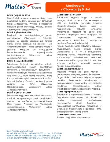 Medjugorie z Chorwacją 8 dni DZIEŃ (wt) 03.06.2014 Msza Święta rozpoczynająca pielgrzymkę o godzinie 16.00 w kościele pw. Chrystusa Króla w Rzeszowie. Wyjazd z Rzeszowa. Przejazd przez Słowację, Węgry, Serbię, Czarnogórę - przejazd nocny. DZIEŃ 2 (śr) 04.06.2014 Przyjazd do najpiękniejszego parku narodowego Chorwacji – Plitwickie Jeziora. W trakcie spaceru po terenie Parku krótka przerwa na posiłek ( we własnym zakresie) – czas spaceru około 4 godziny. Przejazd do Medjugoria. Zakwaterowanie w pensjonacie i obiadokolacja. Wieczorem udział w nabożeństwach. DZIEŃ 3 (czw) 05.06.2014 Śniadanie. Wyjazd do Mostaru miasta zachwycającego swoim orientalnym klimatem, z najcenniejszym zabytkiem kamiennym starym mostem (wpisanym na listę UNESCO) nad rzeką Neretwą, który łączący dwie części miasta muzułmańską i chrześcijańską. Powrót do Medjugoria, wejście na Górę Objawień. Obiadokolacja. Wieczorem udział w nabożeństwach. DZIEŃ 4 (pt) 06.06.2014 Śniadanie. Wyjazd w kierunku Dubrownika – miasta nazywanego „perła Adriatyku”spacer po starówce z przewodnikiem. Czas wolny. Przejazd do Medjugoria i obiadokolacja. Wieczorem udział w nabożeństwach. DZIEŃ 5 (sb) 07.06.2014 Śniadanie. Wyjazd Trogiru – zespół starego miasta, katedra Św. Wawrzyńca z XII w., kościoły gotyckie, kaplica błogosławionego Ivana Ursini – najpiękniejszy zabytek renesansu w Dalmacji. Przejazd do Splitu (jest jednym z większych miast leżących na Chorwackim wybrzeżu. Jako gospodarcze, kulturalne i turystyczne centrum Dalmacji, o bogatej historii, posiada wiele zabytków i zbiorów muzealnych. M.in.: rzymski pałac Dioklecjana z III w. z mauzoleum, świątynią Jowisz, rezydencją cesarską, kolumnowym dziedzińcem, bramami; liczne romańskie, gotyckie i barokowe kościoły, pałace, pomniki, muzea. Powrót do Medjugorie DZIEŃ 6 (ndz) 08.06.2014 Wczesne wyjście na górę Kriżvak – odprawienie drogi krzyżowej. Śniadanie. O godzinie 11.00 msza święta w języku polskim. Zwiedzanie Medjugorie z przewodnikiem. czas wolny na osobistą modlitwę. Obiadokolacja. Udział w nabożeństwach wieczornych. Nocleg. DZIEŃ 7 (pn) 09.06.2014 Śniadanie i wykwaterowanie z hotelu. O godzinie 8.00 wyjazd do Ploski. W drodze powrotnej nawiedzenie miejscowości Marija Bastrica – największego sanktuarium maryjnego w Chorwacji. Msza święta o godzinie 18.00. dalsza podróż w stronę polski. DZIEŃ 8 (wt) 10.06.2014 Przyjazd w godzinach porannych. Biuro Podróży Matteo Travel, tel. +48 504 189 508, lub +48 604 570 550 pn.- sob. 9:00–17:00 Bank PKO BP SA nr konta 87 1020 4391 0000 6402 0108 7113 e-mail: [email protected], www.matteotravel.pl Medjugorie z Chorwacją 8 dni CENA NIE ZAWIERA: CENA ZAWIERA: zakwaterowanie: pokoje 2,3 – osobowe (5 noclegów); wyżywienie jak w programie (5x śniadanie, 4x obiadokolacje); transport: autokar z uchylnymi siedzeniami, klimatyzacją, video, kawiarką, WC; opłaty graniczne i miejscowe; ubezpieczenie NNW, KL, biletów wstępów do zwiedzanych obiektów oraz opłat za przewodników miejscowych ok. 50 euro , płatne u pilota w dniu wyjazdu - opłata obligatoryjna, system tour Guida (na zamówienie grupy) dopłata 40 zł osoba WAŻNE: program jest ramowy, zastrzegamy sobie możliwość zmian w programie, cena skalkulowana przy kursie EURO do 4,2 zł/euro. Jeśli kurs przekroczy 1euro = 4,3 zł, cena ulegnie zmianie. Cena: 1350 zł oraz 50 euro (wstępy, przewodnicy, parkingi, wjazdy do miast) Biuro Podróży Matteo Travel, tel. +48 504 189 508, lub +48 604 570 550 pn.- sob. 9:00–17:00 Bank PKO BP SA nr konta 87 1020 4391 0000 6402 0108 7113 e-mail: [email protected], www.matteotravel.pl