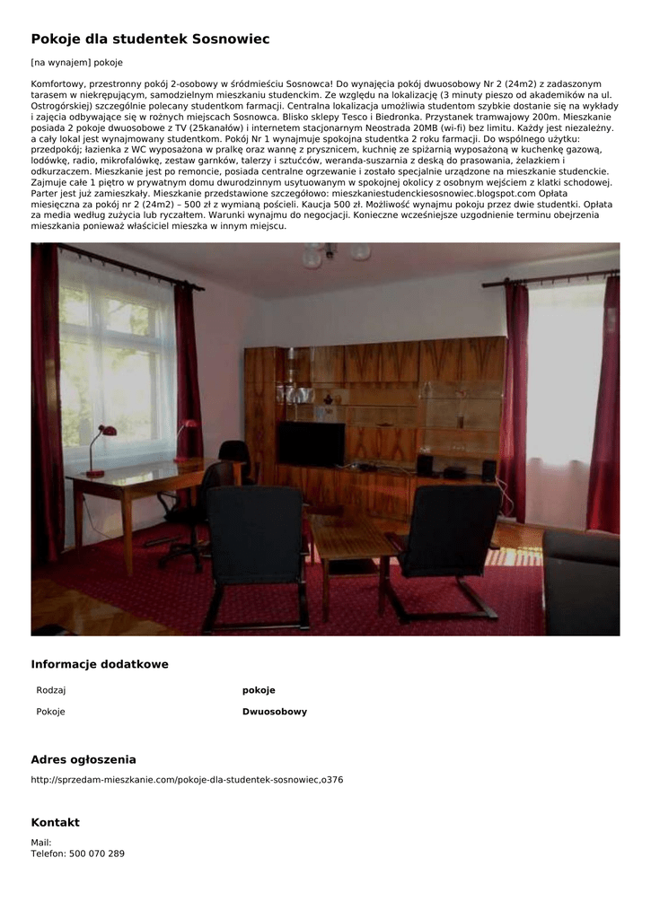 Pokoje dla studentek Sosnowiec [na wynajem] pokoje Komfortowy, przestronny pokój 2-osobowy w śródmieściu Sosnowca! Do wynajęcia pokój dwuosobowy Nr 2 (24m2) z zadaszonym tarasem w niekrępującym, samodzielnym mieszkaniu studenckim. Ze względu na lokalizację (3 minuty pieszo od akademików na ul. Ostrogórskiej) szczególnie polecany studentkom farmacji. Centralna lokalizacja umożliwia studentom szybkie dostanie się na wykłady i zajęcia odbywające się w rożnych miejscach Sosnowca. Blisko sklepy Tesco i Biedronka. Przystanek tramwajowy 200m. Mieszkanie posiada 2 pokoje dwuosobowe z TV (25kanałów) i internetem stacjonarnym Neostrada 20MB (wi-fi) bez limitu. Każdy jest niezależny. a cały lokal jest wynajmowany studentkom. Pokój Nr 1 wynajmuje spokojna studentka 2 roku farmacji. Do wspólnego użytku: przedpokój; łazienka z WC wyposażona w pralkę oraz wannę z prysznicem, kuchnię ze spiżarnią wyposażoną w kuchenkę gazową, lodówkę, radio, mikrofalówkę, zestaw garnków, talerzy i sztućców, weranda-suszarnia z deską do prasowania, żelazkiem i odkurzaczem. Mieszkanie jest po remoncie, posiada centralne ogrzewanie i zostało specjalnie urządzone na mieszkanie studenckie. Zajmuje całe 1 piętro w prywatnym domu dwurodzinnym usytuowanym w spokojnej okolicy z osobnym wejściem z klatki schodowej. Parter jest już zamieszkały. Mieszkanie przedstawione szczegółowo: mieszkaniestudenckiesosnowiec.blogspot.com Opłata miesięczna za pokój nr 2 (24m2) – 500 zł z wymianą pościeli. Kaucja 500 zł. Możliwość wynajmu pokoju przez dwie studentki. Opłata za media według zużycia lub ryczałtem. Warunki wynajmu do negocjacji. Konieczne wcześniejsze uzgodnienie terminu obejrzenia mieszkania ponieważ właściciel mieszka w innym miejscu. Informacje dodatkowe Rodzaj pokoje Pokoje Dwuosobowy Adres ogłoszenia http://sprzedam-mieszkanie.com/pokoje-dla-studentek-sosnowiec,o376 Kontakt Mail: Telefon: 500 070 289 Lokalizacja , Sosnowiec - () Ogłoszenie dodano: 2016-09-30 10:57:18 Ogłoszenie wygasa: 2016-12-30 10:57:18 Powered by TCPDF (www.tcpdf.org)