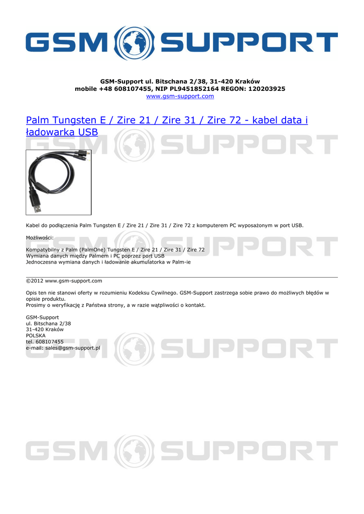 GSM-Support ul. Bitschana 2/38, 31-420 Kraków mobile +48 608107455, NIP PL9451852164 REGON: 120203925 www.gsm-support.com Palm Tungsten E / Zire 21 / Zire 31 / Zire 72 - kabel data i ładowarka USB Kabel do podłączenia Palm Tungsten E / Zire 21 / Zire 31 / Zire 72 z komputerem PC wyposażonym w port USB. Możliwości: Kompatybilny z Palm (PalmOne) Tungsten E / Zire 21 / Zire 31 / Zire 72 Wymiana danych między Palmem i PC poprzez port USB Jednoczesna wymiana danych i ładowanie akumulatorka w Palm-ie ©2012 www.gsm-support.com Opis ten nie stanowi oferty w rozumieniu Kodeksu Cywilnego. GSM-Support zastrzega sobie prawo do możliwych błędów w opisie produktu. Prosimy o weryfikację z Państwa strony, a w razie wątpliwości o kontakt. GSM-Support ul. Bitschana 2/38 31-420 Kraków POLSKA tel. 608107455 e-mail: [email protected] Powered by TCPDF (www.tcpdf.org)
