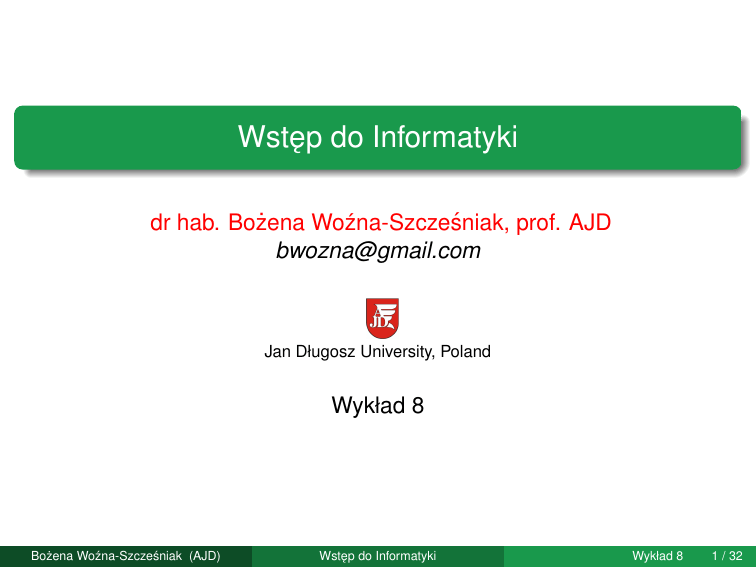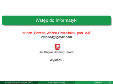 Wstep ˛ do Informatyki dr hab. Bożena Woźna-Szcześniak, prof. AJD [email protected] Jan Długosz University, Poland Wykład 8 Bożena Woźna-Szcześniak (AJD) Wstep ˛ do Informatyki Wykład 8 1 / 32 Instrukcje iteracyjne (z powtórzeniami) Spotykamy sie˛ cz˛esto z takim sytuacjami, w których musimy wykonywać pewna˛ czynność aż do momentu, gdy odniesiemy sukces, np. zrób dziesieć ˛ pompek; bedziesz ˛ tak długo czytać wiersz, aż nauczysz sie˛ go na pamieć; ˛ dopóki bedziesz ˛ siedzieć cicho, nie zapytam cie. ˛ Z tego wynika, że możemy spotkać sie˛ z dwoma sytuacjami: gdy musimy wykonać czynność badź ˛ zadana˛ ilość razy, badź ˛ do momentu spełnienia warunku. Zatem powtarzanie różnych działań ma dwojaka˛ postać: liczba powtórzeń jest z góry określona (przed rozpocz˛eciem cyklu). liczba powtórzeń jest nieznana (zależy od spełnienia pewnego warunku). Bożena Woźna-Szcześniak (AJD) Wstep ˛ do Informatyki Wykład 8 2 / 32 Schemat blokowy - druk liczb z zakresu 1 . . . 9. Bożena Woźna-Szcześniak (AJD) Wstep ˛ do Informatyki Wykład 8 3 / 32 Pseudokod - druk liczb z zakresu 1 . . . 9 begin write("Liczby z zakresu 1..9"); i:= 1; while (i <= 9) do begin write(i); i := i+1; end; end. Bożena Woźna-Szcześniak (AJD) Wstep ˛ do Informatyki Wykład 8 4 / 32 Python - druk liczb z zakresu 1 . . . 9 #!/usr/bin/env python3 print("Liczby z zakresu 1..9") i = 1 while i<=9: print(i) i=i+1 Bożena Woźna-Szcześniak (AJD) Wstep ˛ do Informatyki Wykład 8 5 / 32 Python - druk liczb z zakresu 1 . . . 9 #!/usr/bin/env python3 def zakres (): print("Liczby z zakresu 1..9") i = 1 while i<=9: print(i) i=i+1 def main(): zakres() main() Bożena Woźna-Szcześniak (AJD) Wstep ˛ do Informatyki Wykład 8 6 / 32 Schemat blokowy - druk liczb z zakresu 1 . . . n. Bożena Woźna-Szcześniak (AJD) Wstep ˛ do Informatyki Wykład 8 7 / 32 Pseudokod - druk liczb z zakresu 1 . . . n. begin write("Liczby z zakresu 1..n"); write("Podaj liczbe n = "); read (n); i:= 1; while (i <= n) do begin write(i); i := i+1; end; end. Bożena Woźna-Szcześniak (AJD) Wstep ˛ do Informatyki Wykład 8 8 / 32 Python - druk liczb z zakresu 1 . . . n #!/usr/bin/env python3 n = int(input("Podaj liczb˛ e całkowita: ˛ ")) print("Liczby z zakresu 1..",n) i = 1 while i<=n: print(i) i=i+1 Bożena Woźna-Szcześniak (AJD) Wstep ˛ do Informatyki Wykład 8 9 / 32 Python - druk liczb z zakresu 1 . . . n #!/usr/bin/env python3 def zakres (n): i = 1 while i<=n: print(i) i=i+1 def main(): n = int(input("Podaj liczb˛ e całkowita: ˛ ")) print("Liczby z zakresu 1..",n) zakres(n) main() Bożena Woźna-Szcześniak (AJD) Wstep ˛ do Informatyki Wykład 8 10 / 32 Lista kroków - algorytm Euklidesa Algorytm Euklidesa: Algorytm ten jest najstarszym algorytmem (ma ponad 2000 lat) i przeznaczony jest do znajdowania najwiekszego ˛ wspólnego dzielnika (NWD) dla dwóch liczb naturalnych, tj. NWD(5,25) = 5, NWD(15,25) = 5, NWD(22,24) = 2. Bożena Woźna-Szcześniak (AJD) Wstep ˛ do Informatyki Wykład 8 11 / 32 Lista kroków - algorytm Euklidesa Algorytm Euklidesa: Algorytm ten jest najstarszym algorytmem (ma ponad 2000 lat) i przeznaczony jest do znajdowania najwiekszego ˛ wspólnego dzielnika (NWD) dla dwóch liczb naturalnych, tj. NWD(5,25) = 5, NWD(15,25) = 5, NWD(22,24) = 2. Dane: dowolne dwie liczby naturalne a i b. Wynik: NWD(a, b) Bożena Woźna-Szcześniak (AJD) Wstep ˛ do Informatyki Wykład 8 11 / 32 Lista kroków - algorytm Euklidesa Algorytm Euklidesa: Algorytm ten jest najstarszym algorytmem (ma ponad 2000 lat) i przeznaczony jest do znajdowania najwiekszego ˛ wspólnego dzielnika (NWD) dla dwóch liczb naturalnych, tj. NWD(5,25) = 5, NWD(15,25) = 5, NWD(22,24) = 2. Dane: dowolne dwie liczby naturalne a i b. Wynik: NWD(a, b) Krok 0: Rozpocznij algorytm. Krok 1: Wprowadź wartości dla liczb a i b. Krok 2: Oblicz c jako reszte˛ z dzielenia a przez b. Krok 3: Zastap ˛ a przez b, zaś b przez c. Krok 4: Jeżeli b = 0, to szukane NWD(a, b) wynosi a, w przeciwnym wypadku przejdź do 2. Krok 5: Wyprowadź wynik: NWD(a, b). Krok 4: Zakończ algorytm. Bożena Woźna-Szcześniak (AJD) Wstep ˛ do Informatyki Wykład 8 11 / 32 Lista kroków - algorytm Euklidesa Dane: dowolne dwie liczby naturalne a i b. Wynik: NWD(a, b) Krok 0: Rozpocznij algorytm. Krok 1: Wprowadź wartości dla liczb a i b. Krok 2: Oblicz c jako reszte˛ z dzielenia a przez b. Krok 3: Zastap ˛ a przez b, zaś b przez c. Krok 4: Jeżeli b = 0, to szukane NWD(a, b) wynosi a, w przeciwnym wypadku przejdź do 2. Krok 5: Wyprowadź wynik: NWD(a, b). Krok 4: Zakończ algorytm. Bożena Woźna-Szcześniak (AJD) Wstep ˛ do Informatyki Wykład 8 12 / 32 Lista kroków - algorytm Euklidesa Dane: dowolne dwie liczby naturalne a i b. Wynik: NWD(a, b) Krok 0: Rozpocznij algorytm. Krok 1: Wprowadź wartości dla liczb a i b. Krok 2: Oblicz c jako reszte˛ z dzielenia a przez b. Krok 3: Zastap ˛ a przez b, zaś b przez c. Krok 4: Jeżeli b = 0, to szukane NWD(a, b) wynosi a, w przeciwnym wypadku przejdź do 2. Krok 5: Wyprowadź wynik: NWD(a, b). Krok 4: Zakończ algorytm. Przykład obliczenia NWD(1000, 32): 1 a = 1000, b = 32, c = 1000 mod 32 = 8 2 a = 32, b = 8, c= 32 mod 8 = 0 3 a = 8, b = 0 =⇒ NWD(1000, 32) = 8 Bożena Woźna-Szcześniak (AJD) Wstep ˛ do Informatyki Wykład 8 12 / 32 Schemat blokowy - algorytm Euklidesa Bożena Woźna-Szcześniak (AJD) Wstep ˛ do Informatyki Wykład 8 13 / 32 Pseudokod - algorytm Euklidesa Dane: dowolne dwie liczby naturalne a i b. Wynik: NWD(a, b) begin write("Podaj dwie liczby naturalne"); read(a,b); while (b != 0) do begin {reszta z dzielenia a przez b } c := a mod b; a := b; b := c end NWD := a write(NWD); end. Bożena Woźna-Szcześniak (AJD) Wstep ˛ do Informatyki Wykład 8 14 / 32 Python - algorytm Euklidesa #!/usr/bin/env python3 a = int(input("Podaj liczb˛ e całkowita: ˛ ")) b = int(input("Podaj liczb˛ e całkowita: ˛ ")) print("NWD(",a,",",b,") = ") while b!=0: c = a % b a = b b =