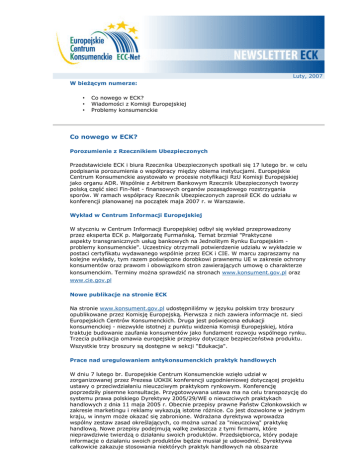 Luty, 2007 W bieżącym numerze: • • • Co nowego w ECK? Wiadomości z Komisji Europejskiej Problemy konsumenckie Co nowego w ECK? Porozumienie z Rzecznikiem Ubezpieczonych Przedstawiciele ECK i biura Rzecznika Ubezpieczonych spotkali się 17 lutego br. w celu podpisania porozumienia o współpracy między obiema instytucjami. Europejskie Centrum Konsumenckie asystowało w procesie notyfikacji RzU Komisji Europejskiej jako organu ADR. Wspólnie z Arbitrem Bankowym Rzecznik Ubezpieczonych tworzy polską część sieci Fin-Net - finansowych organów pozasądowego rozstrzygania sporów. W ramach współpracy Rzecznik Ubezpieczonych zaprosił ECK do udziału w konferencji planowanej na początek maja 2007 r. w Warszawie. Wykład w Centrum Informacji Europejskiej W styczniu w Centrum Informacji Europejskiej odbył się wykład przeprowadzony przez eksperta ECK p. Małgorzatę Furmańską. Temat brzmiał "Praktyczne aspekty transgranicznych usług bankowych na Jednolitym Rynku Europejskim problemy konsumenckie". Uczestnicy otrzymali potwierdzenie udziału w wykładzie w postaci certyfikatu wydawanego wspólnie przez ECK i CIE. W marcu zapraszamy na kolejne wykłady, tym razem poświęcone dorobkowi prawnemu UE w zakresie ochrony konsumentów oraz prawom i obowiązkom stron zawierających umowę o charakterze konsumenckim. Terminy można sprawdzić na stronach www.konsument.gov.pl oraz www.cie.gov.pl Nowe publikacje na stronie ECK Na stronie www.konsument.gov.pl udostępniliśmy w języku polskim trzy broszury opublikowane przez Komisję Europejską. Pierwsza z nich zawiera informacje nt. sieci Europejskich Centrów Konsumenckich. Druga jest poświęcona edukacji konsumenckiej - niezwykle istotnej z punktu widzenia Komisji Europejskiej, która traktuje budowanie zaufania konsumentów jako fundament rozwoju wspólnego rynku. Trzecia publikacja omawia europejskie przepisy dotyczące bezpieczeństwa produktu. Wszystkie trzy broszury są dostępne w sekcji "Edukacja". Prace nad uregulowaniem antykonsumenckich praktyk handlowych W dniu 7 lutego br. Europejskie Centrum Konsumenckie wzięło udział w zorganizowanej przez Prezesa UOKIK konferencji uzgodnieniowej dotyczącej projektu ustawy o przeciwdziałaniu nieuczciwym praktykom rynkowym. Konferencję poprzedziły pisemne konsultacje. Przygotowywana ustawa ma na celu transpozycję do systemu prawa polskiego Dyrektywy 2005/29/WE o nieuczciwych praktykach handlowych z dnia 11 maja 2005 r. Obecnie przepisy prawne Państw Członkowskich w zakresie marketingu i reklamy wykazują istotne różnice. Co jest dozwolone w jednym kraju, w innym może okazać się zabronione. Wdrażana dyrektywa wprowadza wspólny zestaw zasad określających, co można uznać za "nieuczciwą" praktykę handlową. Nowe przepisy podejmują walkę zwłaszcza z tymi firmami, które nieprawdziwie twierdzą o działaniu swoich produktów. Przedsiębiorca, który podaje informacje o działaniu swoich produktów będzie musiał je udowodnić. Dyrektywa całkowicie zakazuje stosowania niektórych praktyk handlowych na obszarze Wspólnoty. Aby mieć pewność, że przedsiębiorcy, osoby zajmujące się marketingiem oraz konsumenci są w pełni świadomi co jest zakazane, w ustawie będzie zawarta "Czarna lista" nieuczciwych praktyk. Wiadomości z Komisji Europejskiej Zielona Księga o konsumenckim acquis Komisja Europejska ogłosiła Zieloną Księgę - przegląd dorobku prawnego Unii Europejskiej z zakresu ochrony konsumentów. Księga podsumowuje wstępne wnioski Komisji a także inicjuje publiczną dyskusję nad konsumenckim acquis. Komisja zidentyfikowała wiele problemów wynikających z obecnych przepisów o ochronie konsumentów. W Zielonej Księdze przedstawiono najważniejsze propozycje zmian jak również kwestie sporne. Wraz z opublikowaniem Księgi Komisja zaprosiła wszystkie zainteresowane strony do konsultacji i zgłaszania projektów zmian. Więcej informacji o Zielonej Księdze można znaleźć pod adresem http://ec.europa.eu/consumers/cons_int/safe_shop/acquis/index_en.htm . Europejscy detaliści obawiają się sprzedaży zagranicznej Komisja Europejska ogłosiła raport Eurobarometr 186 (przygotowany na jej zlecenie przez Organizację Gallupa) zawierający wnioski na temat podejścia przedsiębiorców do transgranicznego handlu i ochrony konsumentów. Najważniejsze wnioski z tej publikacji wskazują, że: • • • • 29% przedsiębiorców europejskich prowadzi detaliczną sprzedaż ponadgraniczną. Handel elektroniczny (e-commerce) wydaje się być kluczem do dalszego rozwoju rynku wewnętrznego UE, ponieważ 57% detalistów twierdzi, że Internet jest jednym z ich kanałów sprzedaży. Jednak aż 2/3 z nich oferuje swoje produkty tylko na rynku krajowym. Z pozostałych 29% sprzedających zagranicę, większość robi to na rynek jednego góra dwóch krajów członkowskich UE. Duża liczba przedsiębiorców deklaruje, że chciałaby wejść na rynek unijny - 48% jest do tego przygotowanych. Jako największa przeszkoda w sprzedaży na rynki UE jest postrzegana niepewność transakcji (61% respondentów odpowiadających na to pytanie uznała to za poważną przeszkodę). Niewiele dalej uplasowały się różnice w przepisach podatkowych (58%), potencjalne problemy w rozwiązywaniu sporów (57%), różnice w narodowych uregulowaniach transakcji konsumenckich (55%), trudności w zapewnieniu serwisu po-sprzedażowego (55%) i zwiększone koszty dostarczenia towaru (51%). Trudności językowe uznano za mniej istotne (43%). 43% sprzedawców detalicznych uważało, że ich zagraniczna sprzedaż wzrosłaby, gdyby przepisy regulujące transakcje konsumenckie były takie same w całej Europie. Raport zawiera również szczegółowe dane o: • • • • • Transgranicznej sprzedaży detalicznej w UE (kanały dystrybucji itp.). Postawie i oczekiwaniach sprzedawców (przygotowanie do sprzedaży zagranicznej, marketing). Przeszkodach w sprzedaży zagranicę (praktyczne 