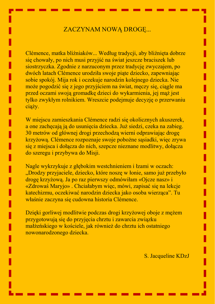 ZACZYNAM NOWĄ DROGĘ... Clémence, matka bliźniaków... Według tradycji, aby bliźnięta dobrze się chowały, po nich musi przyjść na świat jeszcze braciszek lub siostrzyczka. Zgodnie z narzuconym przez tradycję zwyczajem, po dwóch latach Clémence urodziła swoje piąte dziecko, zapewniając sobie spokój. Mija rok i oczekuje narodzin kolejnego dziecka. Nie może pogodzić się z jego przyjściem na świat, męczy się, ciągle ma przed oczami swoją gromadkę dzieci do wykarmienia, jej mąż jest tylko zwykłym rolnikiem. Wreszcie podejmuje decyzję o przerwaniu ciąży. W miejscu zamieszkania Clémence radzi się okolicznych akuszerek, a one zachęcają ją do usunięcia dziecka. Już siedzi, czeka na zabieg. 30 metrów od głównej drogi przechodzą wierni odprawiając drogę krzyżową. Clémence rozpoznaje swoje pobożne sąsiadki, więc zrywa się z miejsca i dołącza do nich, szepcze nieznane modlitwy, dołącza do szeregu i przybywa do Misji. Nagle wykrzykuje z głębokim westchnieniem i łzami w oczach: „Drodzy przyjaciele, dziecko, które noszę w łonie, samo już przebyło drogę krzyżową. Ja po raz pierwszy odmówiłam «Ojcze nasz» i «Zdrowaś Maryjo» . Chciałabym więc, mówi, zapisać się na lekcje katechizmu, oczekiwać narodzin dziecka jako osoba wierząca”. Tu właśnie zaczyna się cudowna historia Clémence. Dzięki gorliwej modlitwie podczas drogi krzyżowej oboje z mężem przygotowują się do przyjęcia chrztu i zawarcia związku małżeńskiego w kościele, jak również do chrztu ich ostatniego nowonarodzonego dziecka. S. Jacqueline KDzJ