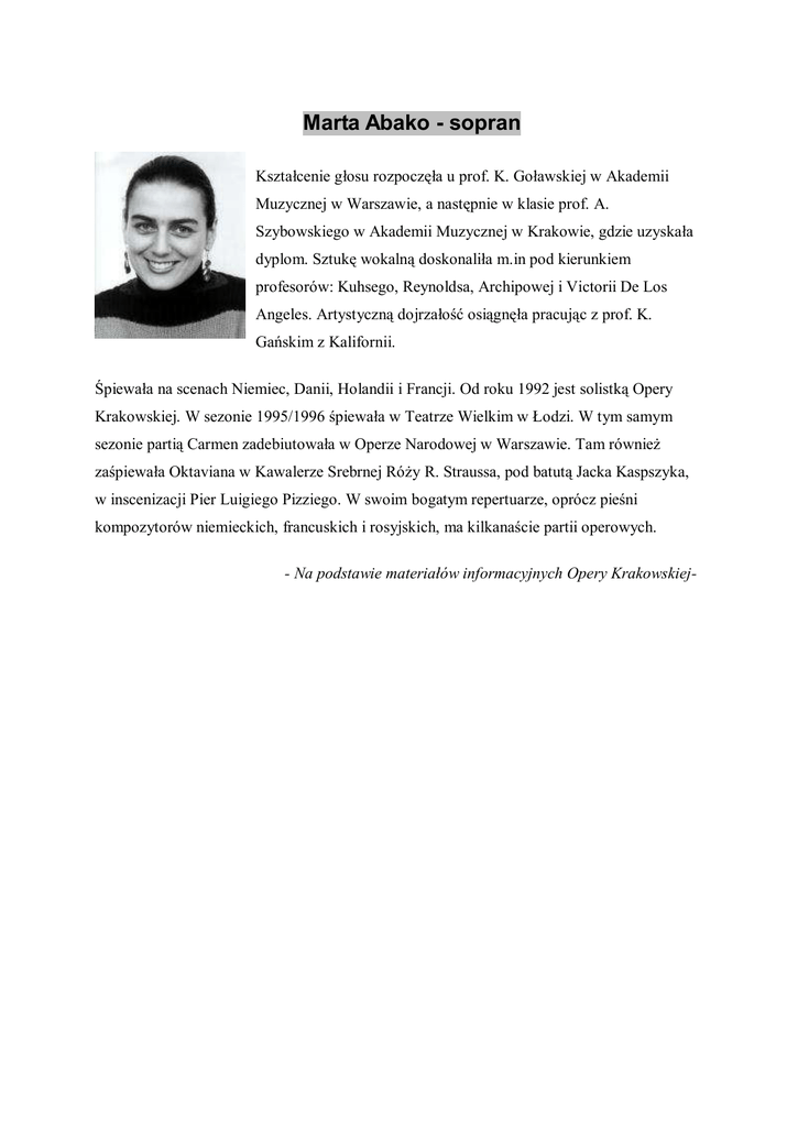 Marta Abako - sopran Kształcenie głosu rozpoczęła u prof. K. Goławskiej w Akademii Muzycznej w Warszawie, a następnie w klasie prof. A. Szybowskiego w Akademii Muzycznej w Krakowie, gdzie uzyskała dyplom. Sztukę wokalną doskonaliła m.in pod kierunkiem profesorów: Kuhsego, Reynoldsa, Archipowej i Victorii De Los Angeles. Artystyczną dojrzałość osiągnęła pracując z prof. K. Gańskim z Kalifornii. Śpiewała na scenach Niemiec, Danii, Holandii i Francji. Od roku 1992 jest solistką Opery Krakowskiej. W sezonie 1995/1996 śpiewała w Teatrze Wielkim w Łodzi. W tym samym sezonie partią Carmen zadebiutowała w Operze Narodowej w Warszawie. Tam również zaśpiewała Oktaviana w Kawalerze Srebrnej Róży R. Straussa, pod batutą Jacka Kaspszyka, w inscenizacji Pier Luigiego Pizziego. W swoim bogatym repertuarze, oprócz pieśni kompozytorów niemieckich, francuskich i rosyjskich, ma kilkanaście partii operowych. - Na podstawie materiałów informacyjnych Opery Krakowskiej-