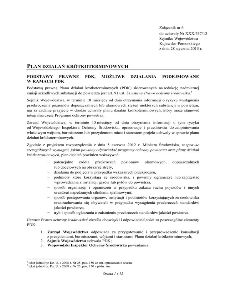 Załącznik nr 6 do uchwały Nr XXX/537/13 Sejmiku Województwa Kujawsko-Pomorskiego z dnia 28 stycznia 2013 r. PLAN DZIAŁAŃ KRÓTKOTERMINOWYCH PODSTAWY PRAWNE W RAMACH PDK PDK, MOśLIWE DZIAŁANIA PODEJMOWANE Podstawą prawną Planu działań krótkoterminowych (PDK) skierowanych na redukcję nadmiernej emisji szkodliwych substancji do powietrza jest art. 91 ust. 3a ustawy Prawo ochrony środowiska.1 Sejmik Województwa, w terminie 18 miesięcy od dnia otrzymania informacji o ryzyku wystąpienia przekroczenia poziomów dopuszczalnych lub alarmowych stęŜeń niektórych substancji w powietrzu, ma za zadanie przyjęcie w drodze uchwały planu działań krótkoterminowych, który moŜe stanowić integralną część Programu ochrony powietrza. Zarząd Województwa, w terminie 15 miesięcy od dnia otrzymania informacji o tym ryzyku od Wojewódzkiego Inspektora Ochrony Środowiska, opracowuje i przedstawia do zaopiniowania właściwym wójtom, burmistrzom lub prezydentom miast i starostom projekt uchwały w sprawie planu działań krótkoterminowych. Zgodnie z projektem rozporządzenia z dnia 5 czerwca 2012 r. Ministra Środowiska, w sprawie szczegółowych wymagań, jakim powinny odpowiadać programy ochrony powietrza oraz plany działań krótkoterminowych, plan działań powinien wskazywać: − potencjalne źródła przekroczeń poziomów alarmowych, dopuszczalnych lub docelowych na obszarze strefy, − działania do podjęcia w przypadku wskazanych przekroczeń, − podmioty które korzystają ze środowiska, i powinny ograniczyć lub zaprzestać wprowadzania z instalacji gazów lub pyłów do powietrza, − sposób organizacji i ograniczeń w przypadku zakazu ruchu pojazdów i innych urządzeń napędzanych silnikami spalinowymi, − sposób postępowania organów, instytucji i podmiotów korzystających ze środowiska oraz zachowania się obywateli w przypadku wystąpienia przekroczeń standardów jakości powietrza, − tryb i sposób ogłaszania o zaistnieniu przekroczeń standardów jakości powietrza. Ustawa Prawo ochrony środowiska2 określa obowiązki i odpowiedzialności za poszczególne elementy PDK: 1. Zarząd Województwa odpowiada za przygotowanie i przeprowadzenie konsultacji z prezydentami, burmistrzami, wójtami i starostami Planu działań krótkoterminowych; 2. Sejmik Województwa uchwala PDK; 3. Wojewódzki Inspektor Ochrony Środowiska powiadamia: 1 2 tekst jednolity: Dz. U. z 2008 r. Nr 25, poz. 150 ze zm. opracowanie własne tekst jednolity: Dz. U. z 2008 r. Nr 25, poz. 150 z późn. zm. Strona 1 z 12 • Zarząd Województwa o ryzyku wystąpienia przekroczeń stęŜeń dopuszczalnych lub docelowych w powietrzu, • Zespół Zarządzania Kryzysowego Wojewody o przekroczeniu poziomów zobowiązujących do podjęcia działań określonych w PDK; 4. Zespół Zarządzania Kryzysowego Wojewody niezwłocznie powiadamia społeczeństwo i podmioty określone z PDK o konieczności podjęcia określonych działań wskazanych w PDK; 5. Prezydenci, starostowie, burmistrzowie, wójtowie realizacja niektórych zadań PDK (np. reorganizacja ruchu pojazdów w miastach). Wojewoda przy pomocy WIOŚ sprawuje nadzór w zakresie terminowego uchwalania programów ochrony powietrza i PDK oraz realizacji programów ochrony powietrza i PDK przez starostę, prezydenta miasta, burmistrza, wójta i inne podmioty. Schemat uchwalania i realizacji PDK według wprowadzonych zmian w przepisach przedstawiono na rysunku. Schemat uchwalania i realizacji PDK W myśl obecnie obowiązujących zapisów ustawy Prawo ochrony środowiska, obowiązek informowania społeczeństwa o ryzyku wystąpienia przekroczeń lub o ich wystąpieniu oraz podjęcia działań wynikających z PDK spoczywa na Wojewodzie, który działa poprzez Organ Zarządzania Kryzysowego. Strona 2 z 12 Mając na uwadze, Ŝe głównymi prekursorami ozonu są tlenki azotu oraz niemetanowe lotne związki organiczne oraz, w mniejszym stopniu, CO i SO2, moŜna wyróŜnić podstawowe kategorie działalności, przyczyniających się do wzrostu emisji tych zanieczyszczeń. W dalszej kolejności naleŜy dąŜyć do ograniczenia ich negatywnego oddziaływania. W przypadku tlenków azotu, największy udział w emisji wykazują (wg klasyfikacji SNAP)3: procesy spalania w sektorze produkcji i transformacji energii (SNAP 1), transport drogowy (SNAP 7). Mniejsze udziały mają inne pojazdy i urządzenia (SNAP 8), na podobnym poziomie są procesy spalania w przemyśle (SNAP 3) i procesy spalania w sektorze komunalnym i mieszkaniowym (SNAP 2). Głównym źródłem niemetanowych lotnych związków organicznych są: procesy spalania w sektorze komunalnym i mieszkaniowym (SNAP 2), stosowanie rozpuszczalników i innych substancji (SNAP 6) i transport drogowy (SNAP 7). Emisja tlenków siarki pochodzi głównie z procesów spalania w sektorze produkcji i transformacji energii (SNAP 1) oraz z procesów spalania w sektorze komunalnym i mieszkaniowym (SNAP 2). Największy udział w emisji tlenku węgla mają procesy spalania w sektorze komunalnym i mieszkaniowym (SNAP 2) i transport drogowy (SNAP 7). Do moŜliwych działań redukujących krótkoterminowo emisję, w zaleŜności od jej rodzaju zaliczamy: w przypadku emisji powierzchniowej: − zakaz palenia w kominkach, jeŜeli nie stanowią one jedynego źródła ogrzewania mieszkań w okresie grzewczym; − zakaz spalania pozostałości roślinnych na powierzchni ziemi. w przypadku emisji liniowej: − przeniesienie uciąŜliwego natęŜenia ruchu samochodowego na odcinki alternatywne, wyznaczone przez zarządzających drogami na danym obszarze wraz z montaŜem tablic informacyjnych o objazdach, − moŜliwość darmowego korzystania z komunikacji zbiorowej, szczególnie na terenach miast, − upłynnienie ruchu poprzez inteligentny system zarządzania ruchem (tworzenie tzw. zielonych fal), − bezwzględny zakaz wjazdu samochodów cięŜarowych o ładowności powyŜej 3,5 tony na wyznaczone trasy miast, − c