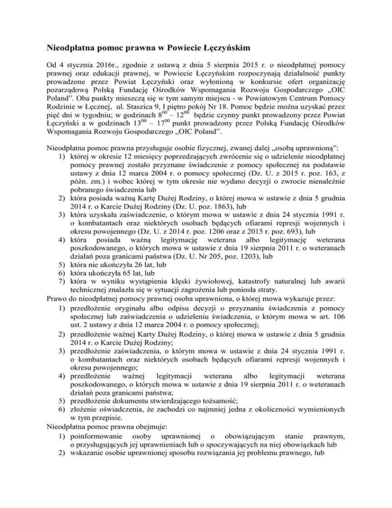 Nieodpłatna pomoc prawna w Powiecie Łęczyńskim Od 4 stycznia 2016r., zgodnie z ustawą z dnia 5 sierpnia 2015 r. o nieodpłatnej pomocy prawnej oraz edukacji prawnej, w Powiecie Łęczyńskim rozpoczynają działalność punkty prowadzone przez Powiat Łęczyński oraz wyłonioną w konkursie ofert organizację pozarządową Polską Fundację Ośrodków Wspomagania Rozwoju Gospodarczego „OIC Poland”. Oba punkty mieszczą się w tym samym miejscu - w Powiatowym Centrum Pomocy Rodzinie w Łęcznej, ul. Staszica 9, I piętro pokój Nr 18. Pomoc będzie można uzyskać przez pięć dni w tygodniu; w godzinach 800 – 1200 będzie czynny punkt prowadzony przez Powiat Łęczyński a w godzinach 1300 – 1700 punkt prowadzony przez Polską Fundację Ośrodków Wspomagania Rozwoju Gospodarczego „OIC Poland”. Nieodpłatna pomoc prawna przysługuje osobie fizycznej, zwanej dalej „osobą uprawnioną”: 1) której w okresie 12 miesięcy poprzedzających zwrócenie się o udzielenie nieodpłatnej pomocy prawnej zostało przyznane świadczenie z pomocy społecznej na podstawie ustawy z dnia 12 marca 2004 r. o pomocy społecznej (Dz. U. z 2015 r. poz. 163, z późn. zm.) i wobec której w tym okresie nie wydano decyzji o zwrocie nienależnie pobranego świadczenia lub 2) która posiada ważną Kartę Dużej Rodziny, o której mowa w ustawie z dnia 5 grudnia 2014 r. o Karcie Dużej Rodziny (Dz. U. poz. 1863), lub 3) która uzyskała zaświadczenie, o którym mowa w ustawie z dnia 24 stycznia 1991 r. o kombatantach oraz niektórych osobach będących ofiarami represji wojennych i okresu powojennego (Dz. U. z 2014 r. poz. 1206 oraz z 2015 r. poz. 693), lub 4) która posiada ważną legitymację weterana albo legitymację weterana poszkodowanego, o których mowa w ustawie z dnia 19 sierpnia 2011 r. o weteranach działań poza granicami państwa (Dz. U. Nr 205, poz. 1203), lub 5) która nie ukończyła 26 lat, lub 6) która ukończyła 65 lat, lub 7) która w wyniku wystąpienia klęski żywiołowej, katastrofy naturalnej lub awarii technicznej znalazła się w sytuacji zagrożenia lub poniosła straty. Prawo do nieodpłatnej pomocy prawnej osoba uprawniona, o której mowa wykazuje przez: 1) przedłożenie oryginału albo odpisu decyzji o przyznaniu świadczenia z pomocy społecznej lub zaświadczenia o udzieleniu świadczenia, o którym mowa w art. 106 ust. 2 ustawy z dnia 12 marca 2004 r. o pomocy społecznej; 2) przedłożenie ważnej Karty Dużej Rodziny, o której mowa w ustawie z dnia 5 grudnia 2014 r. o Karcie Dużej Rodziny; 3) przedłożenie zaświadczenia, o którym mowa w ustawie z dnia 24 stycznia 1991 r. o kombatantach oraz niektórych osobach będących ofiarami represji wojennych i okresu powojennego; 4) przedłożenie ważnej legitymacji weterana albo legitymacji weterana poszkodowanego, o których mowa w ustawie z dnia 19 sierpnia 2011 r. o weteranach działań poza granicami państwa; 5) przedłożenie dokumentu stwierdzającego tożsamość; 6) złożenie oświadczenia, że zachodzi co najmniej jedna z okoliczności wymienionych w tym przepisie. Nieodpłatna pomoc prawna obejmuje: 1) poinformowanie osoby uprawnionej o obowiązującym stanie prawnym, o przysługujących jej uprawnieniach lub o spoczywających na niej obowiązkach lub 2) wskazanie osobie uprawnionej sposobu rozwiązania jej problemu prawnego, lub 3) udzielenie pomocy w sporządzeniu projektu pisma w sprawach, o których mowa w pkt 1 i 2, z wyłączeniem pism procesowych w toczącym się postępowaniu przygotowawczym lub sądowym i pism w toczącym się postępowaniu sądowoadministracyjnym, lub 4) sporządzenie projektu pisma o zwolnienie od kosztów sądowych lub ustanowienie pełnomocnika z urzędu w postępowaniu sądowym lub ustanowienie adwokata, radcy prawnego, doradcy podatkowego lub rzecznika patentowego w postępowaniu sądowoadministracyjnym. Nieodpłatna pomoc prawna nie obejmuje spraw: 1) podatkowych związanych z prowadzeniem działalności gospodarczej; 2) z zakresu prawa celnego, dewizowego i handlowego; 3) związanych z prowadzeniem działalności gospodarczej, z wyjątkiem przygotowania do rozpoczęcia tej działalności. Poniżej harmonogram pracy punktu prowadzonego przez Powiat Łęczyński. Harmonogram udzielania pomocy prawnej przez radców prawnych zatrudnionych przez Powiat Łęczyński w punkcie nieodpłatnej pomocy prawnej w Łęcznej w godzinach od 800 do 1200 Miesiąc styczeń marzec maj lipiec wrzesień listopad Dzień tygodnia Nazwisko i imię radcy prawnego poniedziałek Agata Grudzińska wtorek Beata Dudzińska środa Marzena Zygo czwartek Arkadiusz Słabek piątek Maria Leśniak-Gorgol Harmonogram udzielania pomocy prawnej przez adwokatów zatrudnionych przez Powiat Łęczyński w punkcie nieodpłatnej pomocy prawnej w Łęcznej w godzinach od 800 do 1200 Miesiąc luty kwiecień czerwiec sierpień październik grudzień Dzień tygodnia Nazwisko i imię adwokata poniedziałek Sławomir Sokołowski wtorek Zamiennie jeden z wymienionych adwokatów środa Krzysztof Słabek czwartek Przemysław Pietruszka piątek Elwira Kister