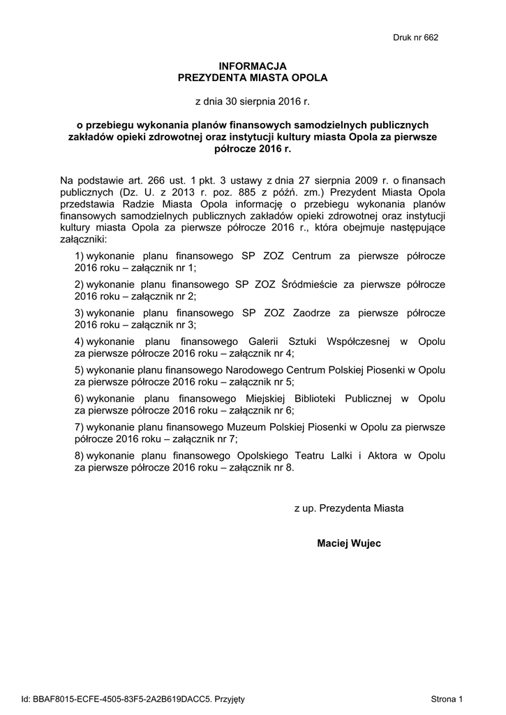 Druk nr 662 INFORMACJA PREZYDENTA MIASTA OPOLA z dnia 30 sierpnia 2016 r. o przebiegu wykonania planów finansowych samodzielnych publicznych zakładów opieki zdrowotnej oraz instytucji kultury miasta Opola za pierwsze półrocze 2016 r. Na podstawie art. 266 ust. 1 pkt. 3 ustawy z dnia 27 sierpnia 2009 r. o finansach publicznych (Dz. U. z 2013 r. poz. 885 z późń. zm.) Prezydent Miasta Opola przedstawia Radzie Miasta Opola informację o przebiegu wykonania planów finansowych samodzielnych publicznych zakładów opieki zdrowotnej oraz instytucji kultury miasta Opola za pierwsze półrocze 2016 r., która obejmuje następujące załączniki: 1) wykonanie planu finansowego SP ZOZ Centrum za pierwsze półrocze 2016 roku – załącznik nr 1; 2) wykonanie planu finansowego SP ZOZ Śródmieście za pierwsze półrocze 2016 roku – załącznik nr 2; 3) wykonanie planu finansowego SP ZOZ Zaodrze za pierwsze półrocze 2016 roku – załącznik nr 3; 4) wykonanie planu finansowego Galerii Sztuki za pierwsze półrocze 2016 roku – załącznik nr 4; Współczesnej w Opolu 5) wykonanie planu finansowego Narodowego Centrum Polskiej Piosenki w Opolu za pierwsze półrocze 2016 roku – załącznik nr 5; 6) wykonanie planu finansowego Miejskiej Biblioteki Publicznej w Opolu za pierwsze półrocze 2016 roku – załącznik nr 6; 7) wykonanie planu finansowego Muzeum Polskiej Piosenki w Opolu za pierwsze półrocze 2016 roku – załącznik nr 7; 8) wykonanie planu finansowego Opolskiego Teatru Lalki i Aktora w Opolu za pierwsze półrocze 2016 roku – załącznik nr 8. z up. Prezydenta Miasta Maciej Wujec Id: BBAF8015-ECFE-4505-83F5-2A2B619DACC5. Przyjęty Strona 1 Załącznik Nr 1 Wykonanie planu finansowego SP ZOZ Centrum za I półrocze 2016 roku zł Przychody Wyszczególnienie Plan na 2016 r. Wykonanie za I półrocze 2016r. 1 2 3 1. Dotacja podmiotowa z budżetu miasta 2. Przychody z prowadzonej działalności 3. Odsetki bankowe 4. Pozostałe przychody 5. Zmiana stanu produktów PRZYCHODY OGÓŁEM 545 000 7 447 109 50 000 64 200 -69 000 206 634,02 3 548 037,60 24 050,90 22 775,57 8 037 309 3 801 498,09 % 3:2 4 37,9% 47,6% 48,1% 35,5% 0,0% 47,3% Koszty Wyszczególnienie Plan na 2016 r. 1 2 Wynagrodzenia Składki naliczane od wynagrodzeń Zakup materiałów i wyposażenia, w tym: leki, odczynniki pozostałe materiały Zakup energii, w tym: energia elektryczna energia cieplna, woda, gaz Usługi obce, w tym: zakup procedur medycznych pozostałe usługi Usługi remontowe Podatki i opłaty, w tym: podatek od nieruchomości pozostałe opłaty Podróże służbowe Świadczenia na rzecz pracowników Odpis na ZFŚS Amortyzacja Pozostałe koszty, z czego: Wynik finansowy % 3:2 3 4 425 000 784 869,67 620 000 165 000 1 412 300 120 000 70 000 5 000 30 000 80 130,33 300 000 15 000 ubezpieczenia majątkowe KOSZTY OGÓŁEM Wykonanie za I półrocze 2016r. 8 027 300 10 009 1 998 987,97 355 940,54 279 121,79 201 199,79 77 922,00 76 315,21 30 097,37 46 217,84 716 610,29 610 011,87 106 598,42 73 682,30 41 348,16 10 320,00 31 028,16 2 409,70 12 451,35 40 065,18 119 240,40 5 077,00 5 077,00 4 45,2% 45,4% 45,0% 46,3% 50,7% 61,4% 59,1% 48,2% 41,5% 50,0% 39,7% 33,8% 3 721 249,89 46,4% 80 248,20 SP ZOZ Centrum I półrocze 2016 r. zamknął dodatnim wynikiem finansowym w wysokości 80.248,20 zł. W I półroczu 2016 roku na inwestycje wydatkowano kwotę 452.962,58 zł, przeznaczając ją m.in. na zakup sprzętu komputerowego, aparatu USG, mebli, sprzętu i wyposażenia medycznego, klimatyzacji w laboratorium, a także przebudowę i modernizację rejestracji MP i oświetlenia. Stan środków pieniężnych na dzień 1.01.2016 r. Stan środków pieniężnych na dzień 30.06.2016 r. Stan należności na dzień 1.01.2016 r. Stan należności na dzień 30.06.2016 r. Stan zobowiązań na dzień 1.01.2016 r. Stan zobowiązań na dzień 30.06.2016 r. Id: BBAF8015-ECFE-4505-83F5-2A2B619DACC5. Przyjęty 3 612 538,81 zł 3 608 863,65 zł 768 301,06 zł 714 865,52 zł 1 100 984,99 zł 999 830,19 zł Strona 2 Załącznik Nr 2 Wykonanie planu finansowego SP ZOZ Śródmieście za I półrocze 2016 roku zł Przychody Wyszczególnienie Plan na 2016 r. 1 2 1. Przychody z prowadzonej działalności 2. Odsetki bankowe 3. Pozostałe przychody PRZYCHODY OGÓŁEM Wykonanie za I półrocze 2016r. 3 % 3:2 4 5 881 000 10 000 55 000 2 877 041,40 7 703,69 26 909,87 48,9% 77,0% 48,9% 5 946 000 2 911 654,96 49,0% Koszty Wyszczególnienie Plan na 2016 r. 1 2 Wynagrodzenia Składki naliczane od wynagrodzeń Zakup materiałów i wyposażenia, w tym: materiały i wyposażenie medyczne pozostałe materiały Zakup energii, w tym: energia elektryczna energia cieplna Usługi obce, w tym: zakup procedur medycznych pozostałe usługi Usługi remontowe Podatki i opłaty Świadczenia na rzecz pracowników Odpis na ZFŚS Amortyzacja Pozostałe koszty KOSZTY OGÓŁEM Wynik finansowy Wykonanie za I półrocze 2016r. 3 % 3:2 4 3 440 000 600 000 272 000 180 000 92 000 130 000 45 000 85 000 1 100 000 990 000 110 000 40 000 28 000 7 000 50 331,72 185 000 40 700 1 670 506,79 305 787,56 130 645,22 92 020,56 38 624,66 71 106,04 22 017,67 49 088,37 511 670,90 476 502,05 35 168,85 14 185,15 13 846,50 4 727,42 25 165,86 91 106,58 19 426,95 48,6% 51,0% 48,0% 51,1% 42,0% 54,7% 48,9% 57,8% 46,5% 48,1% 32,0% 35,5% 49,5% 67,5% 50,0% 49,2% 47,7% 5 893 031,72 2 858 174,97 48,5% 52 968,28 53 479,99 SP ZOZ Śródmieście I półrocze 2016 r. zamknął dodatnim wynikiem finansowym w wysokości 53.479,99 zł. Stan środków pieniężnych na dzień 1.01.2016 r. Stan środków pieniężnych na dzień 30.06.2016 r. 999 411,85 zł 1 441 022,76 zł Stan należności na dzień 1.01.2016 r. Stan należności na dzień 30.06.2016 r. 523 237,96 zł 448 130,30 zł Stan zobowiązań na dzień 1.01.2016 r. Stan zobowiązań na dzień 30.06.2016 r. 621 693,10 zł 633 762,69 zł Id: BBAF8015-ECFE-4505-83F5-2A2B619DACC5. Przyjęty Strona 3 Załącznik Nr 3 Wykonanie planu finansowego SP ZOZ Zaod
