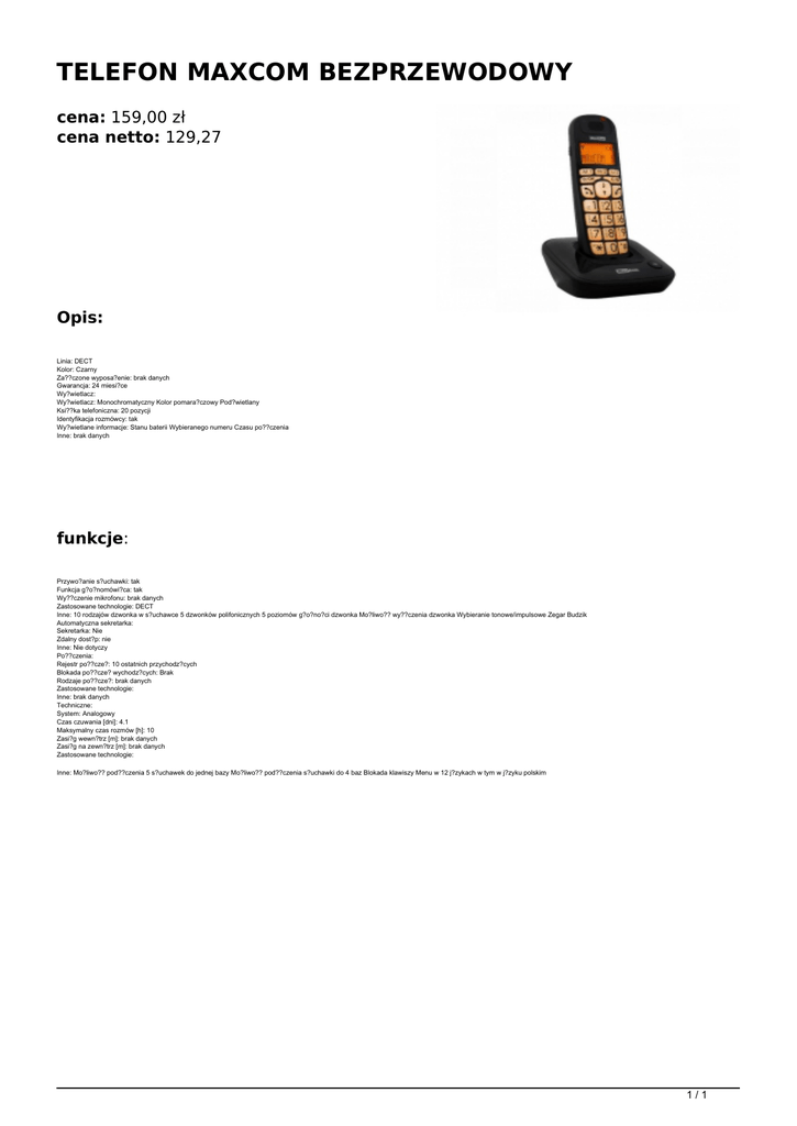 TELEFON MAXCOM BEZPRZEWODOWY cena: 159,00 zł cena netto: 129,27 Opis: Linia: DECT Kolor: Czarny Za??czone wyposa?enie: brak danych Gwarancja: 24 miesi?ce Wy?wietlacz: Wy?wietlacz: Monochromatyczny Kolor pomara?czowy Pod?wietlany Ksi??ka telefoniczna: 20 pozycji Identyfikacja rozmówcy: tak Wy?wietlane informacje: Stanu baterii Wybieranego numeru Czasu po??czenia Inne: brak danych funkcje: Przywo?anie s?uchawki: tak Funkcja g?o?nomówi?ca: tak Wy??czenie mikrofonu: brak danych Zastosowane technologie: DECT Inne: 10 rodzajów dzwonka w s?uchawce 5 dzwonków polifonicznych 5 poziomów g?o?no?ci dzwonka Mo?liwo?? wy??czenia dzwonka Wybieranie tonowe/impulsowe Zegar Budzik Automatyczna sekretarka: Sekretarka: Nie Zdalny dost?p: nie Inne: Nie dotyczy Po??czenia: Rejestr po??cze?: 10 ostatnich przychodz?cych Blokada po??cze? wychodz?cych: Brak Rodzaje po??cze?: brak danych Zastosowane technologie: Inne: brak danych Techniczne: System: Analogowy Czas czuwania [dni]: 4.1 Maksymalny czas rozmów [h]: 10 Zasi?g wewn?trz [m]: brak danych Zasi?g na zewn?trz [m]: brak danych Zastosowane technologie: Inne: Mo?liwo?? pod??czenia 5 s?uchawek do jednej bazy Mo?liwo?? pod??czenia s?uchawki do 4 baz Blokada klawiszy Menu w 12 j?zykach w tym w j?zyku polskim 1/1